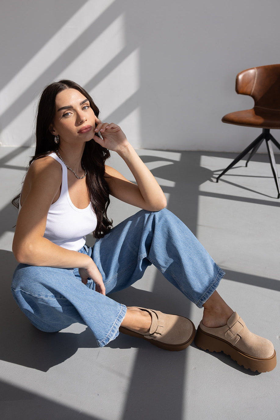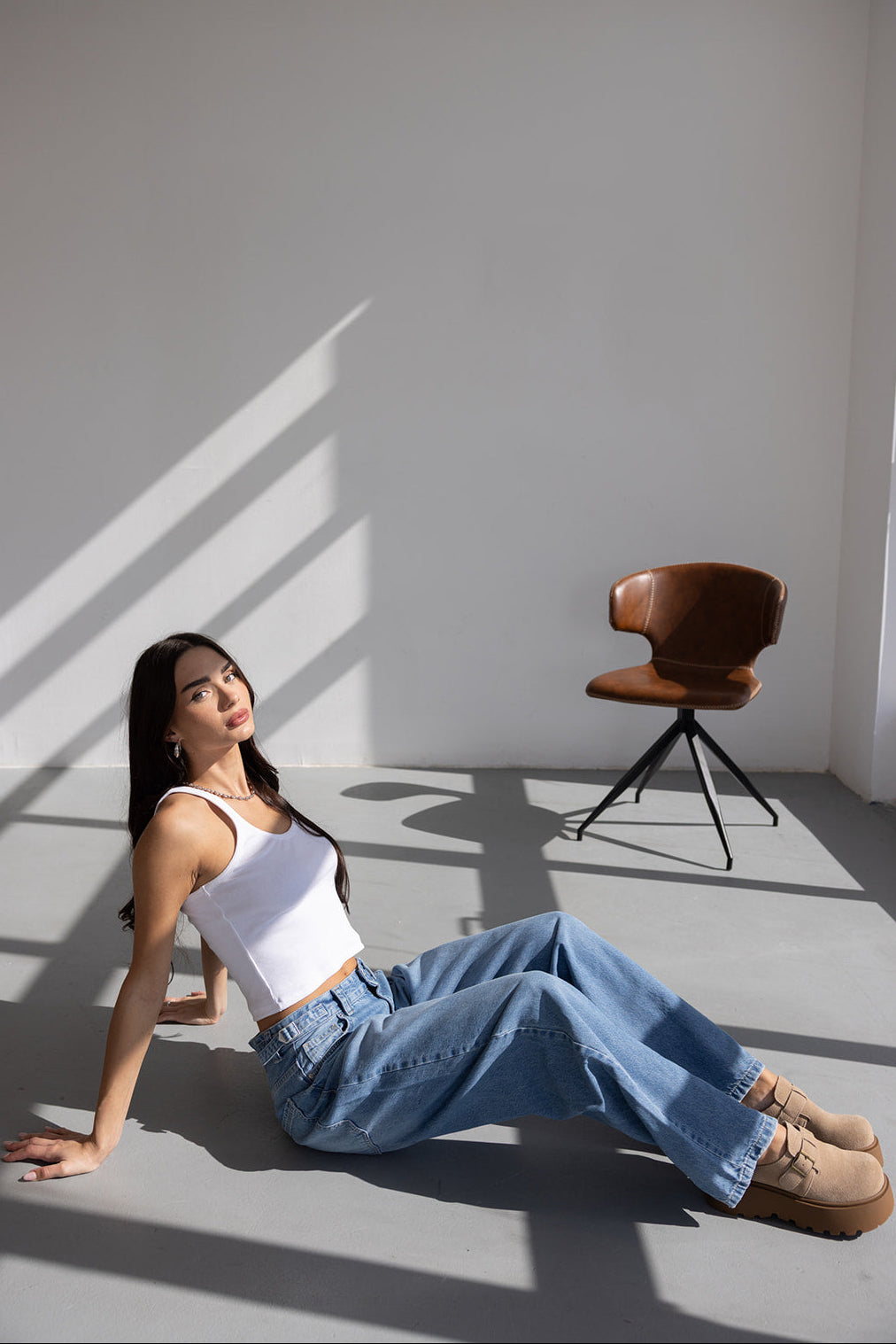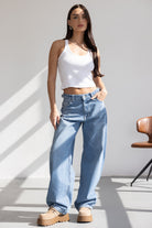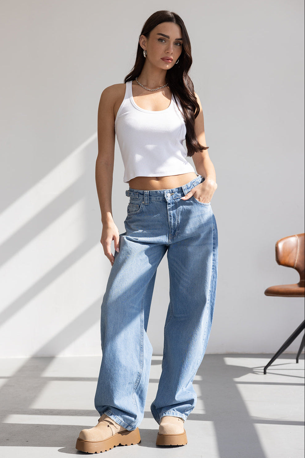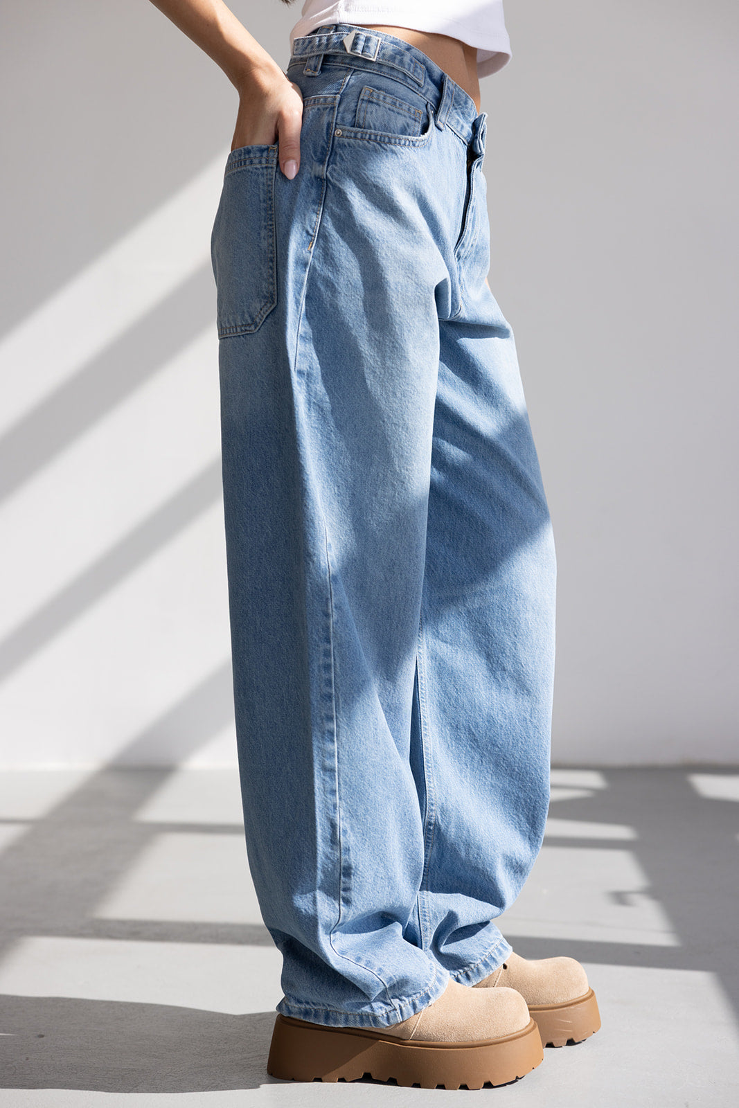 ג'ינס בגזרת מידי רחבה עשוי מבד דנים במראה דהוי. בשילוב שני כיסים קדמיים ושני כיסים אחוריים, סגירת רוכסן וכפתור קדמי ושני אבזמים למראה טרנדי בצידי הג'ינס.