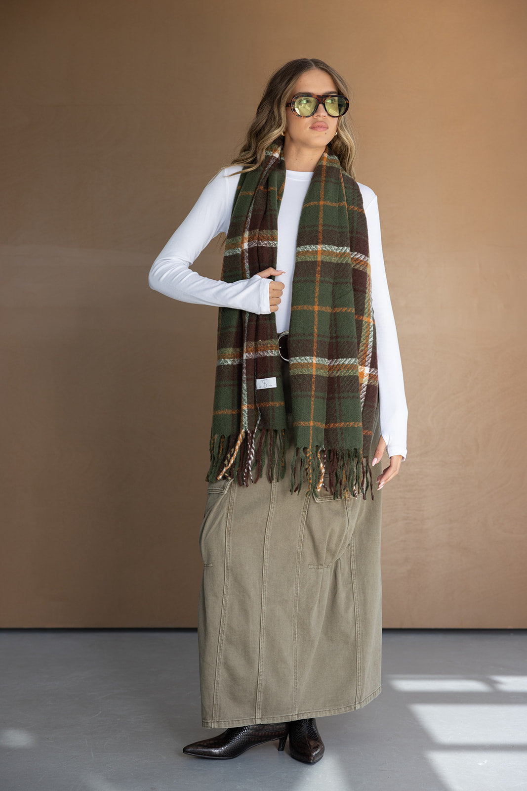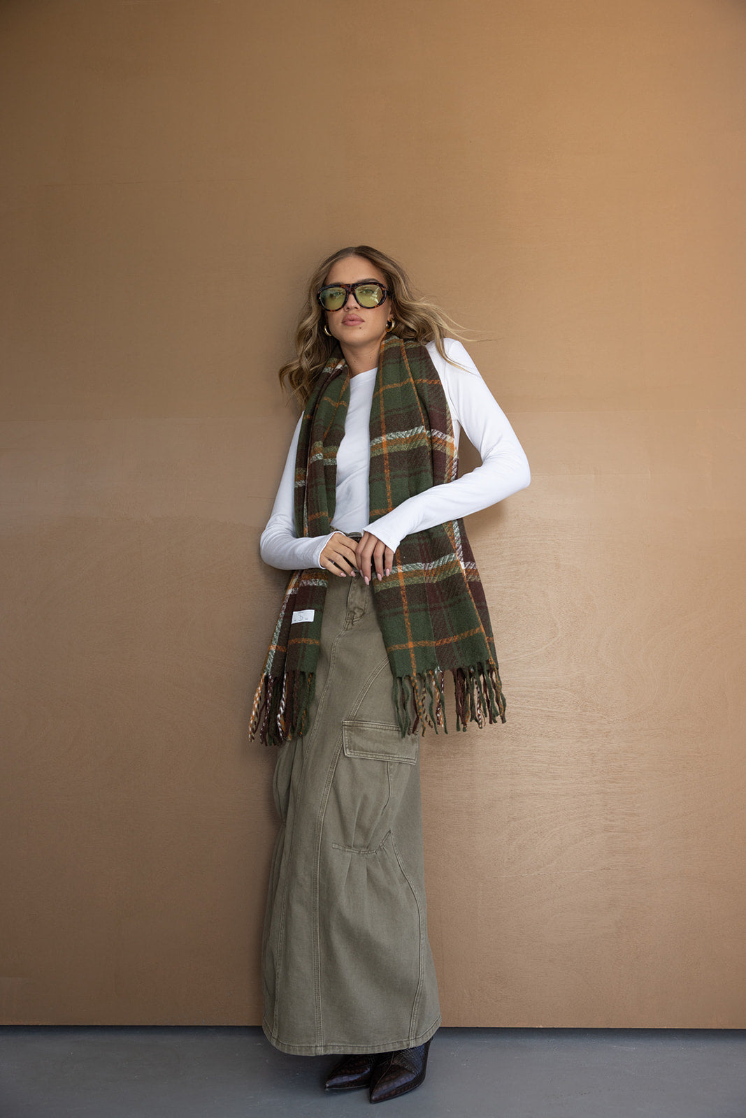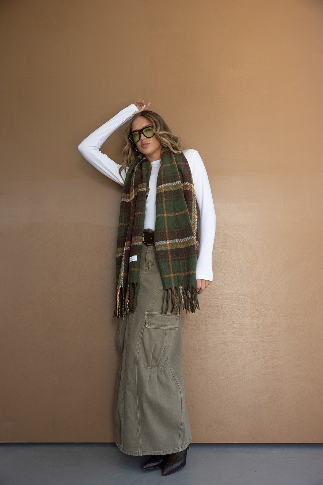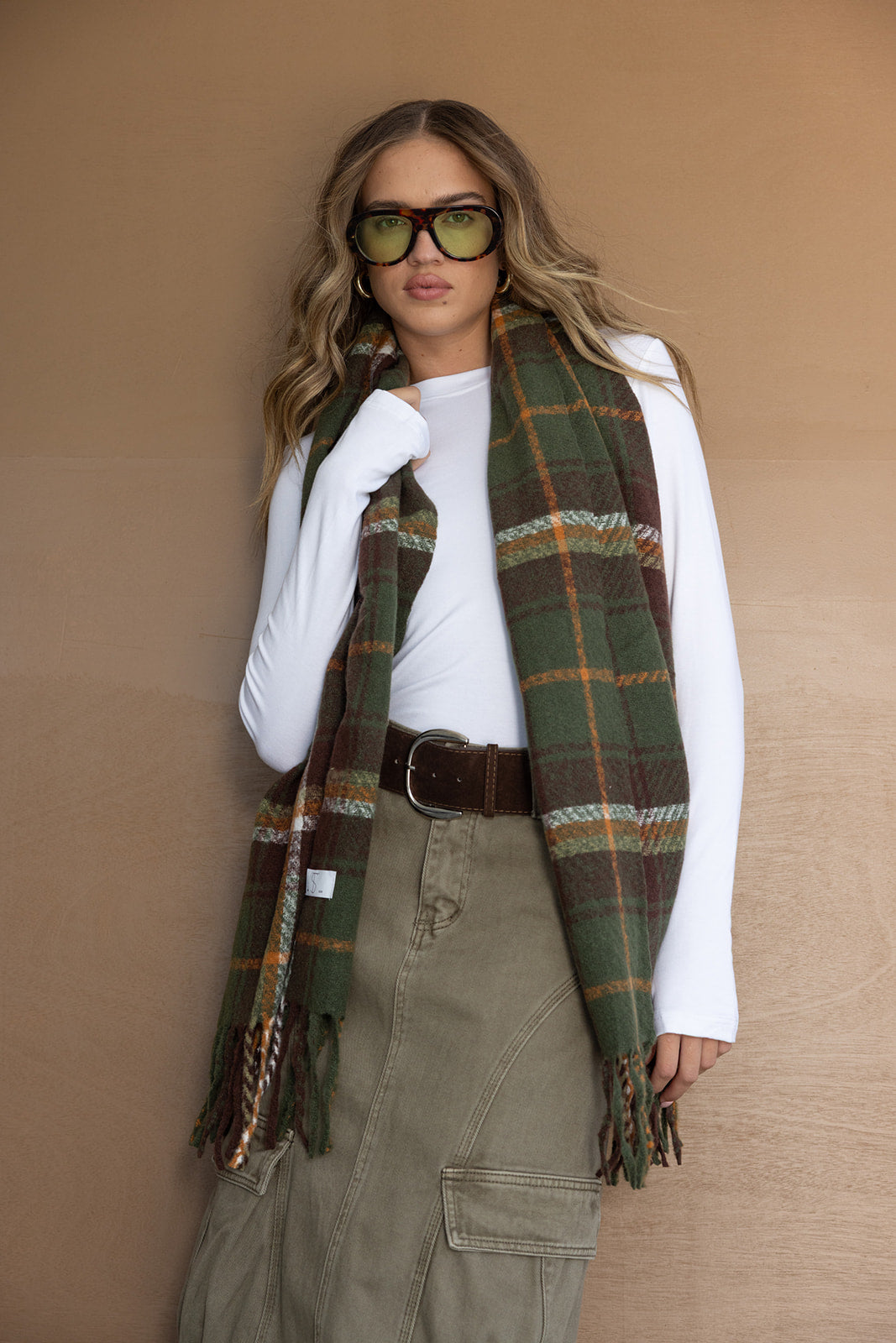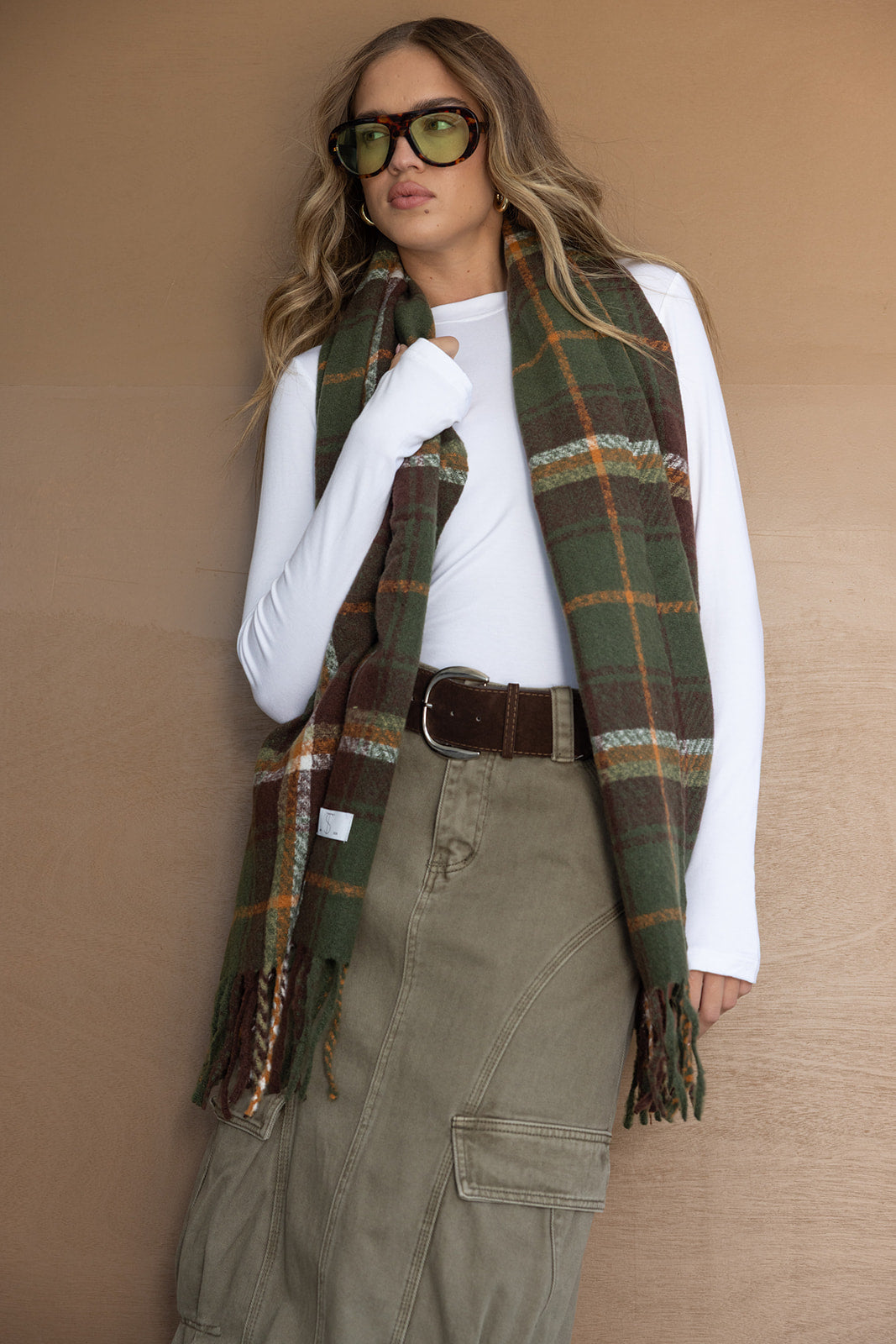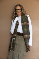 צעיף צמר קלאסי בשילוב דוגמה משובצת טרנדית ביותר לעונה וסיומת פרנזים.