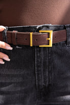 חגורת דמוי זמש בצבע חום בשילוב אבזם מרובע זהב, למראה קלאסי.