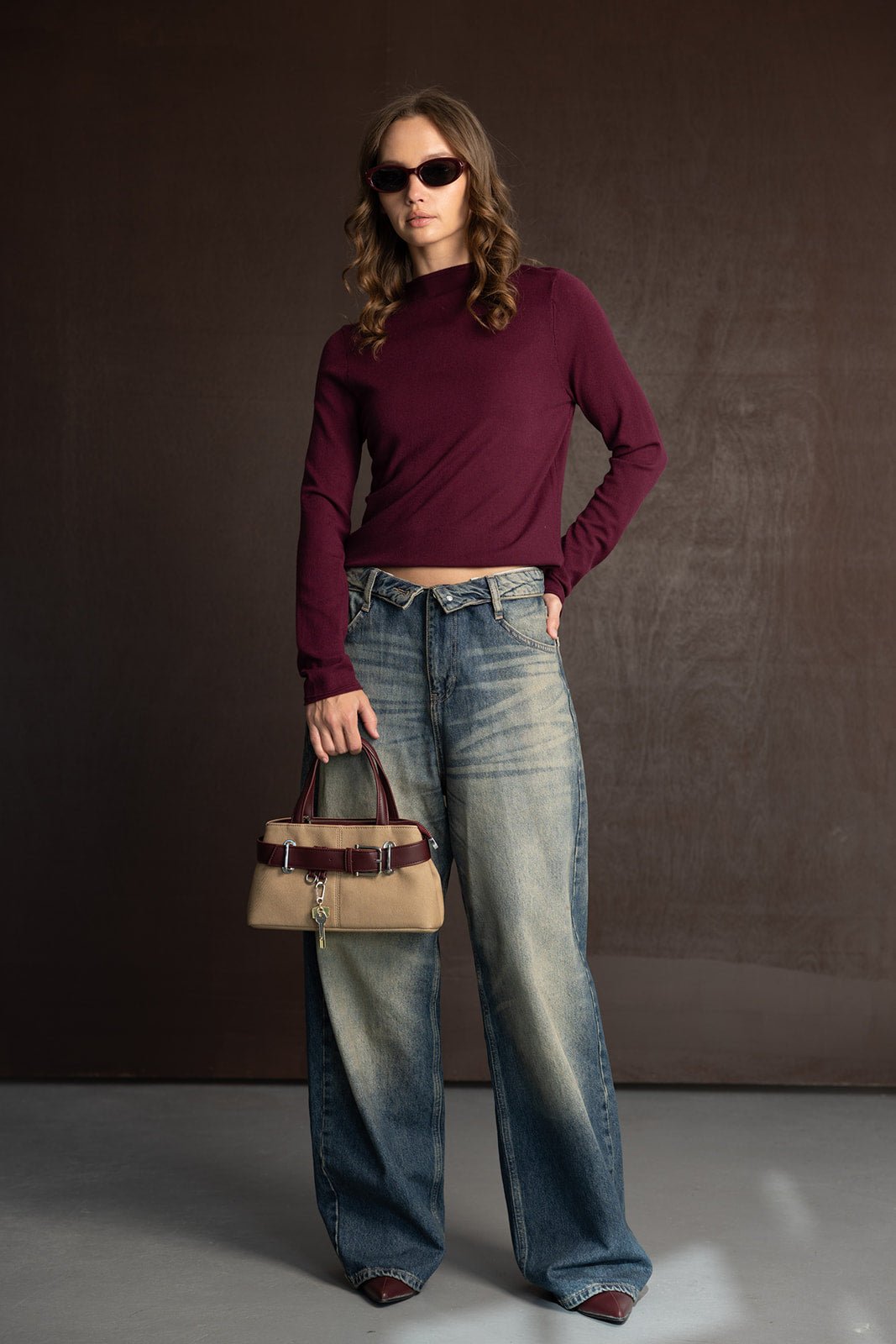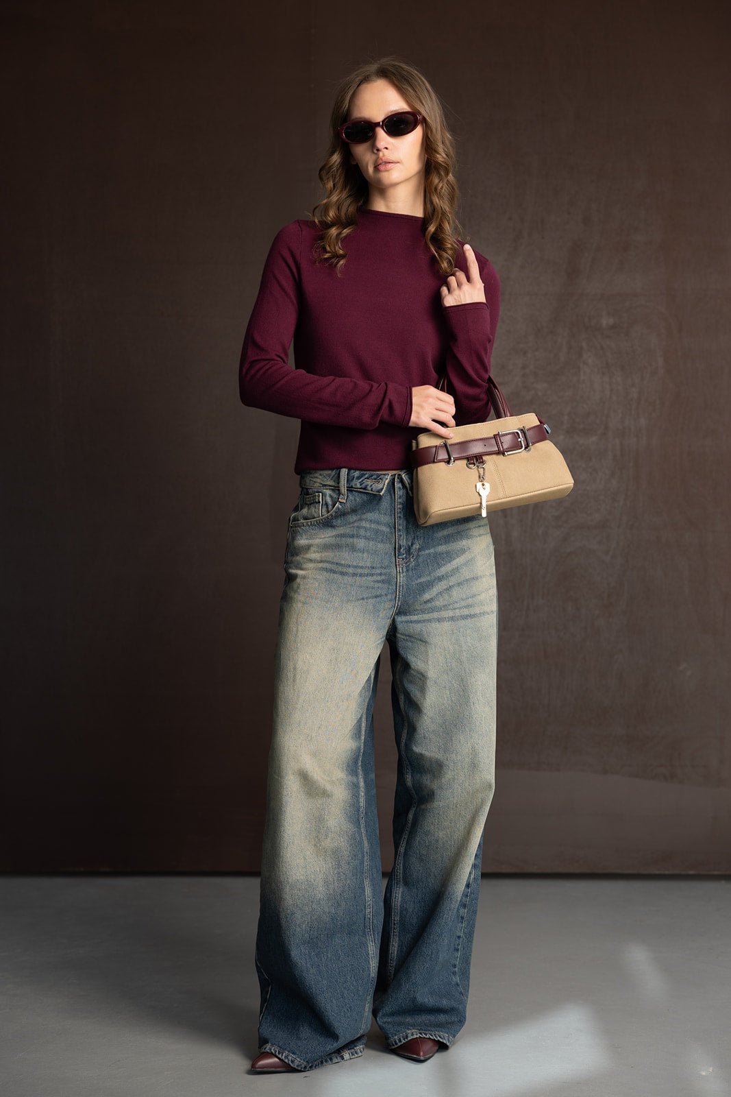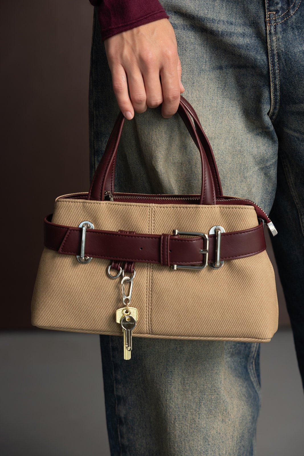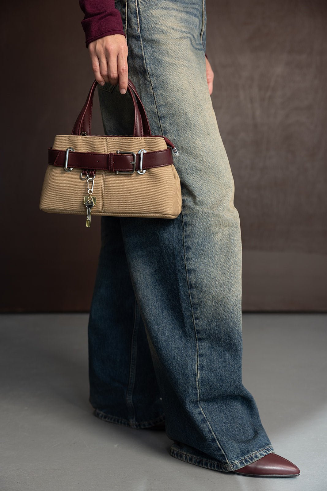 תיק יד קטן במראה הטרנדי של העונה. לתיק רצועת נשיאה ורוכסן לסגירה.