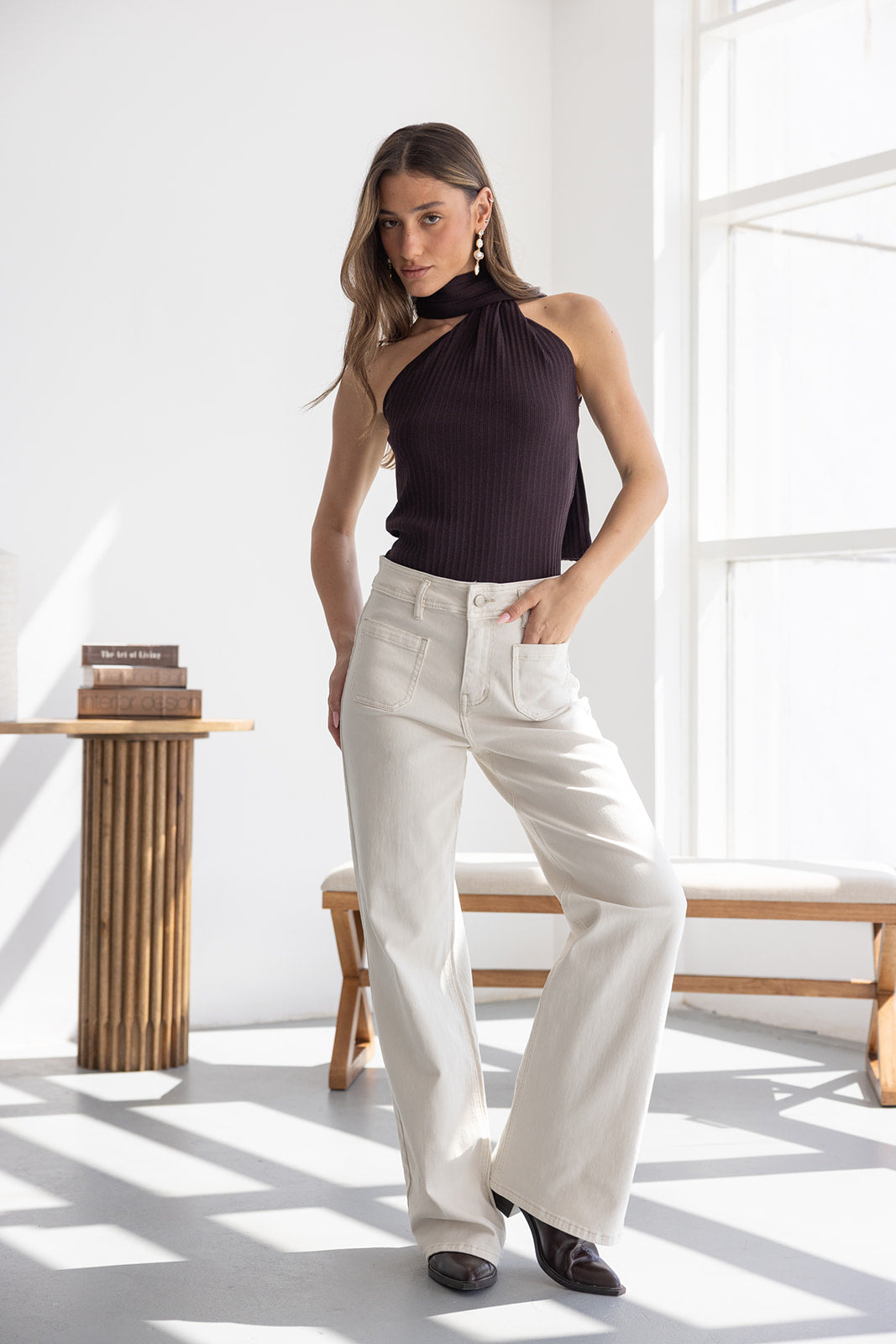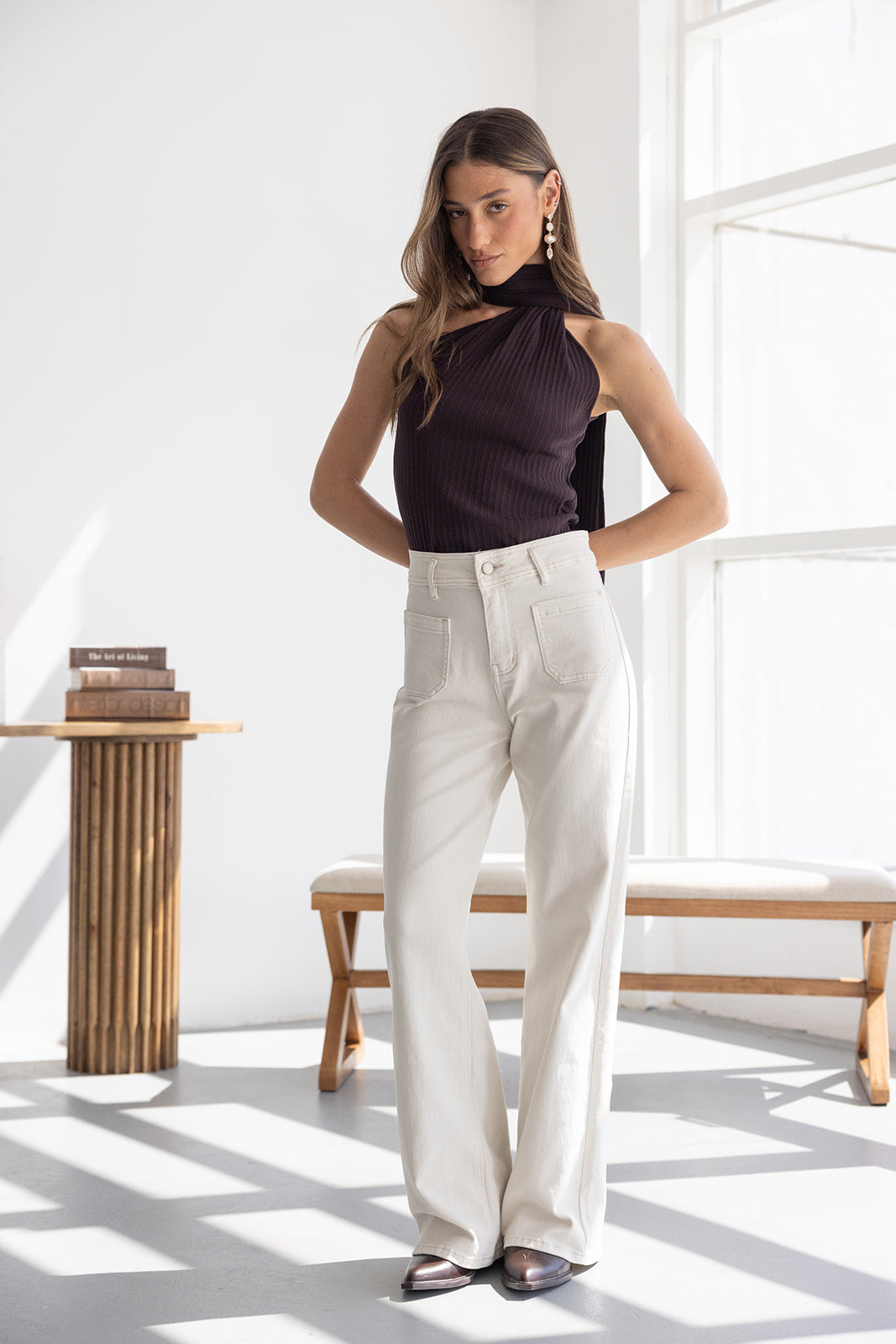 מכנס ג'ינס בגזרה ישרה ומחמיאה. בשילוב שני כיסים קדמיים ושני כיסים אחוריים.