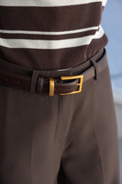 חגורה עשויה דמוי עור במראה חלק קלאסי, בשילוב אבזם מלבני מוזהב.