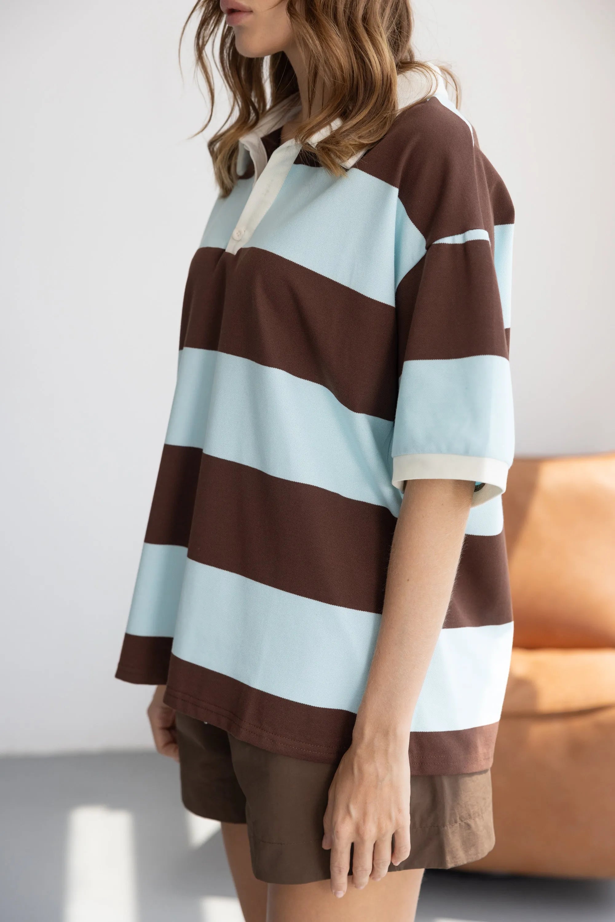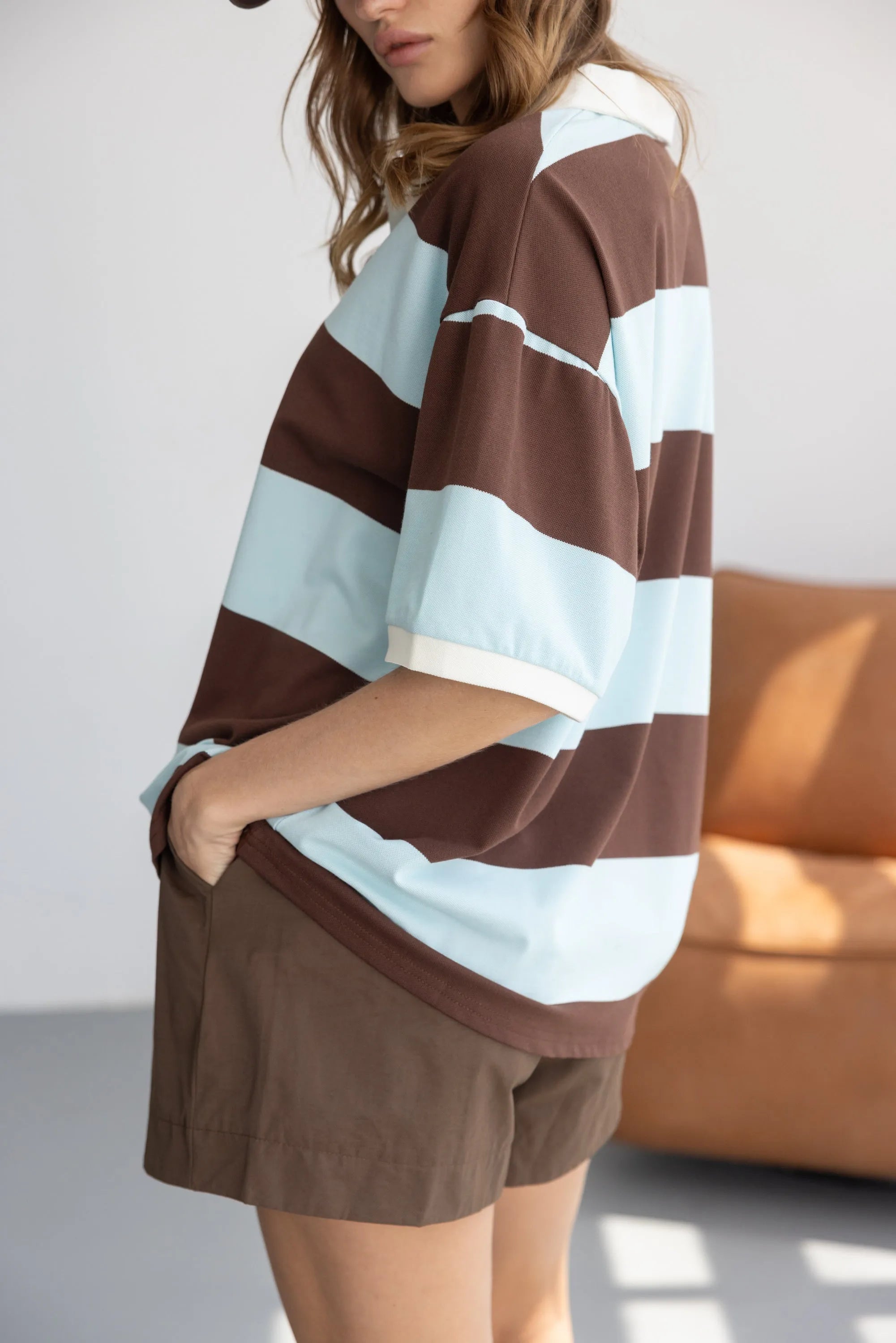 חולצת פולו בגזרה משוחררת מבד נעים ואיכותי, למראה קלאסי וטרנדי. בשילוב דוגמת פסים לרוחב החולצה.