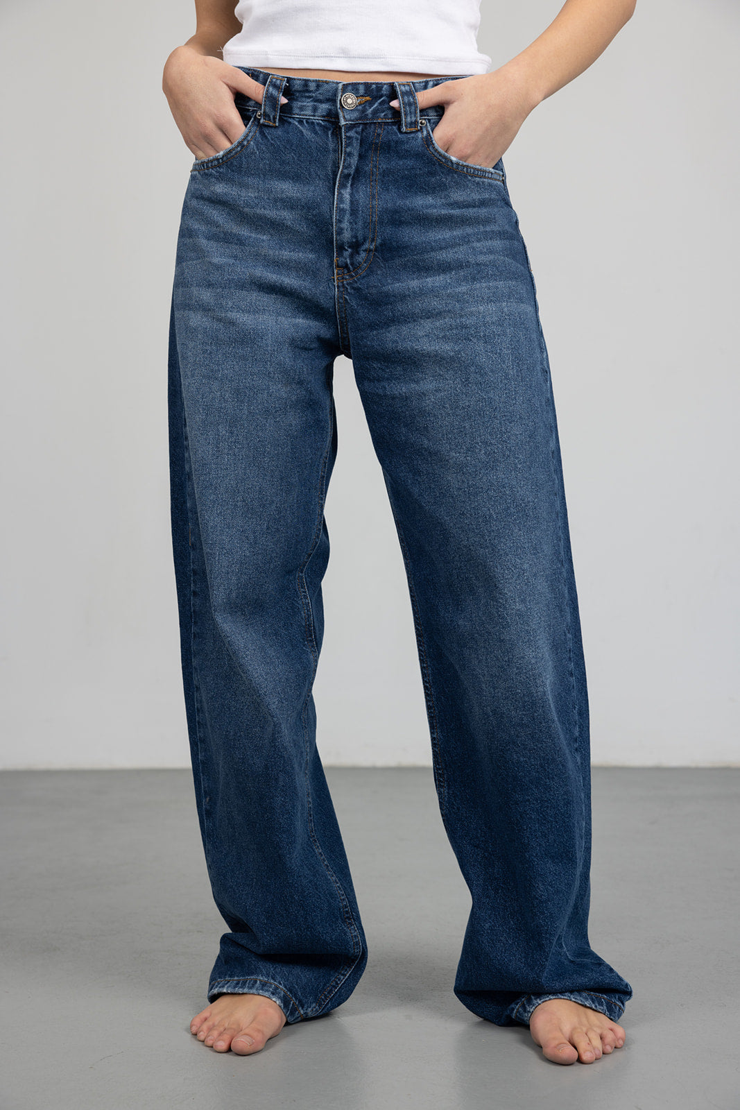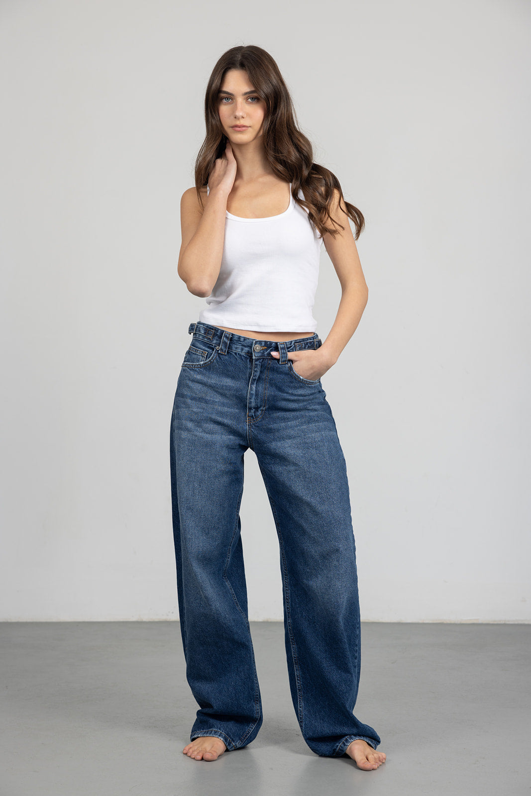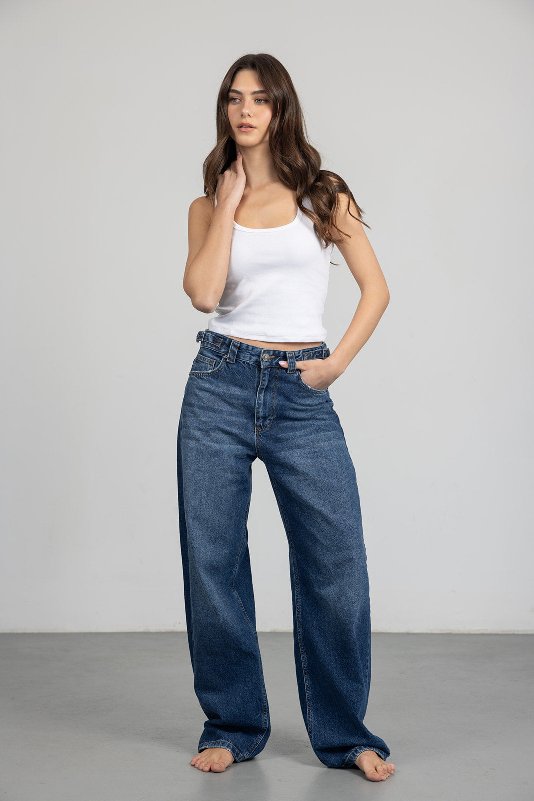 ג'ינס בגזרה ישרה ורפויה עם מותן גבוהה למראה מחמיא ונוח. כולל כיסים קדמיים ואחוריים, סגירת רוכסן וכפתור.