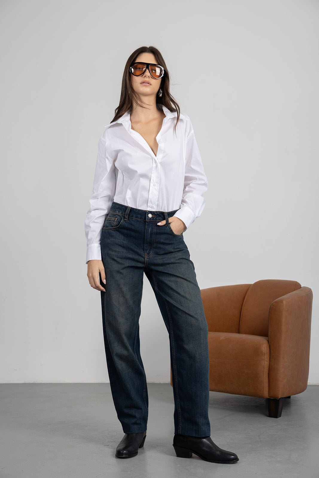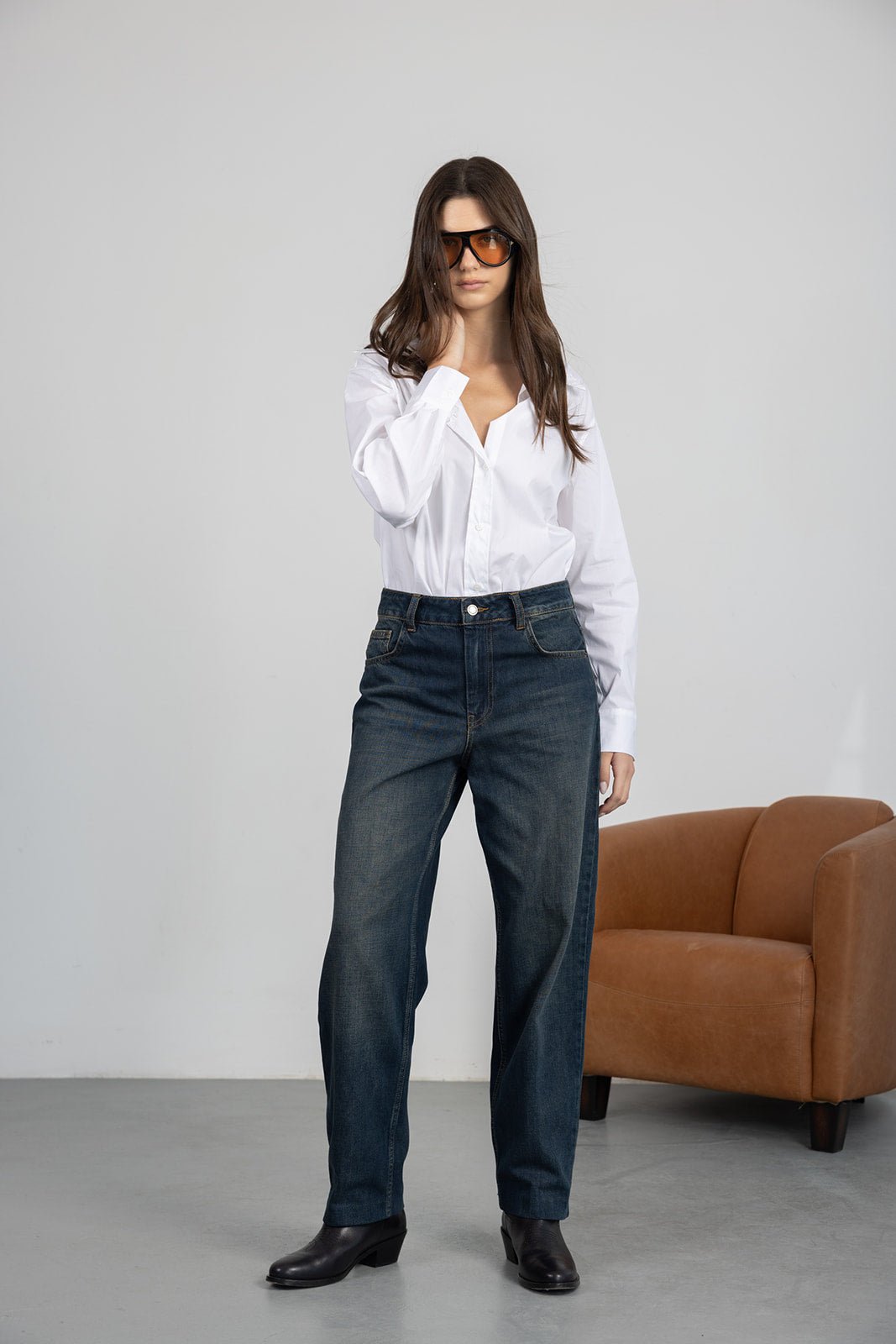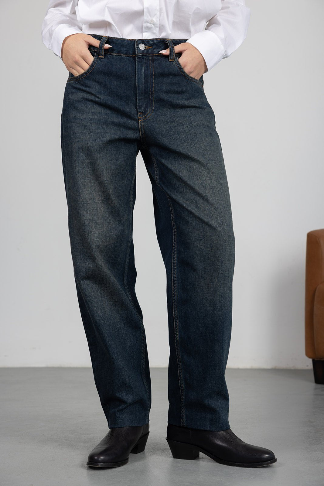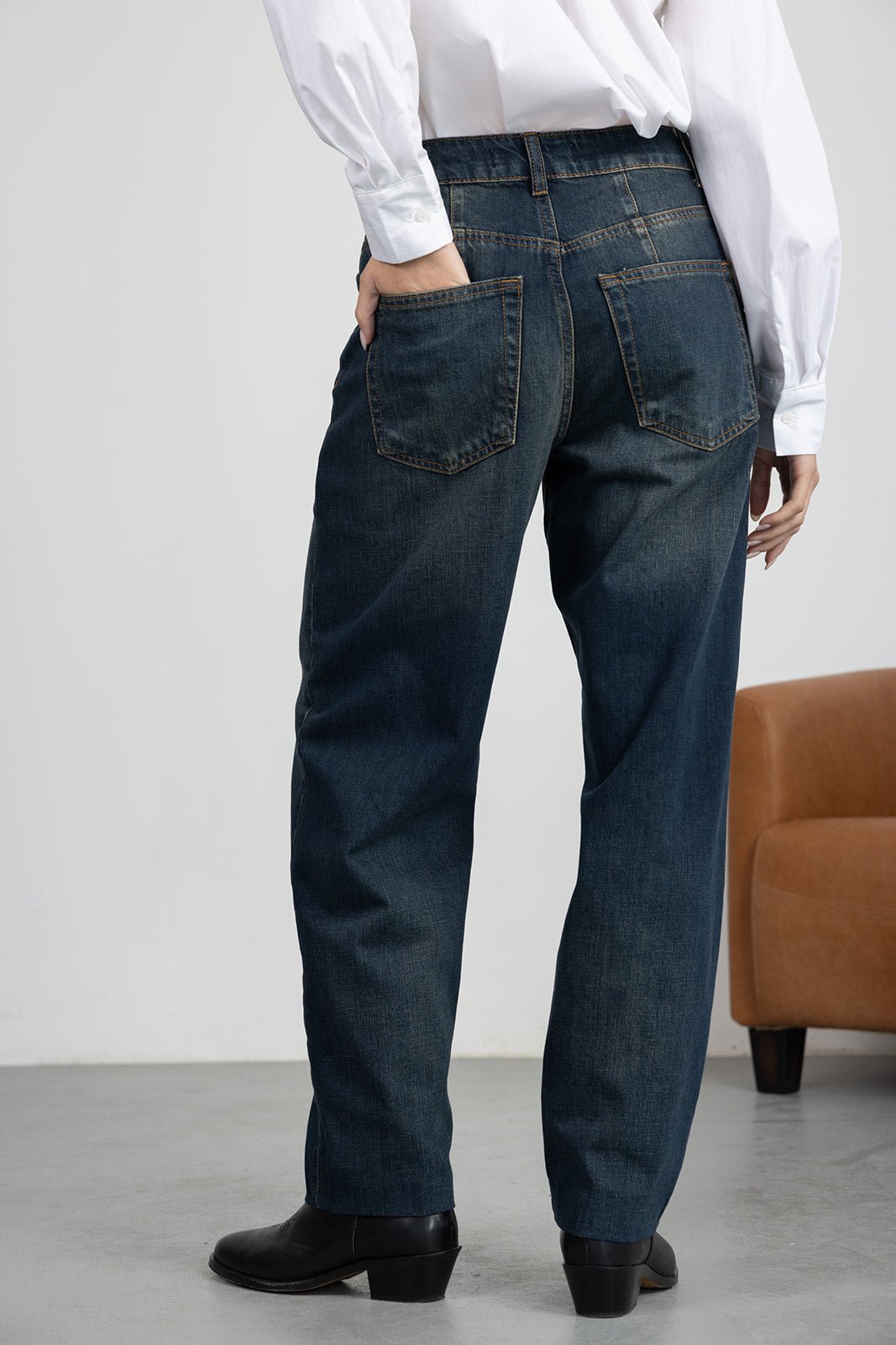 ג'ינס כחול כהה קלאסי בגזרת מידי משוחררת מעט. לג'ינס שני כיסים קדמיים ושני כיסים אחוריים, כפתור ורוכסן לסגירה.