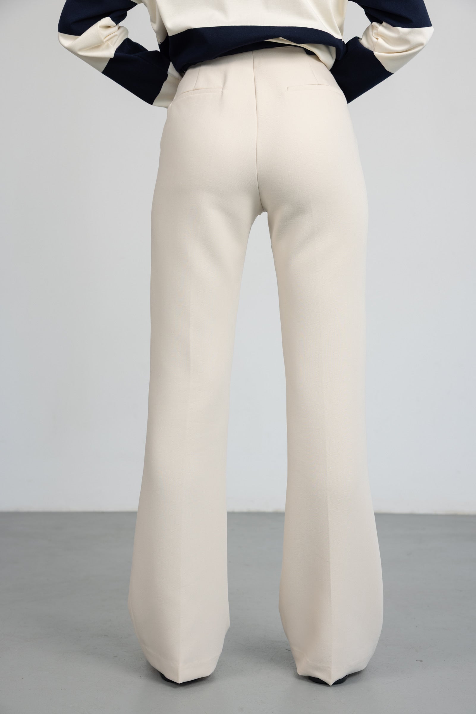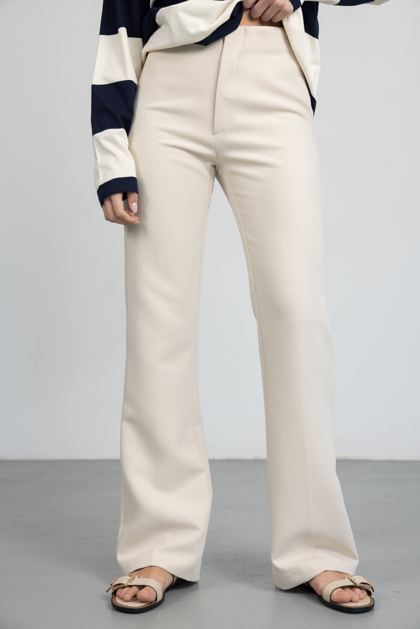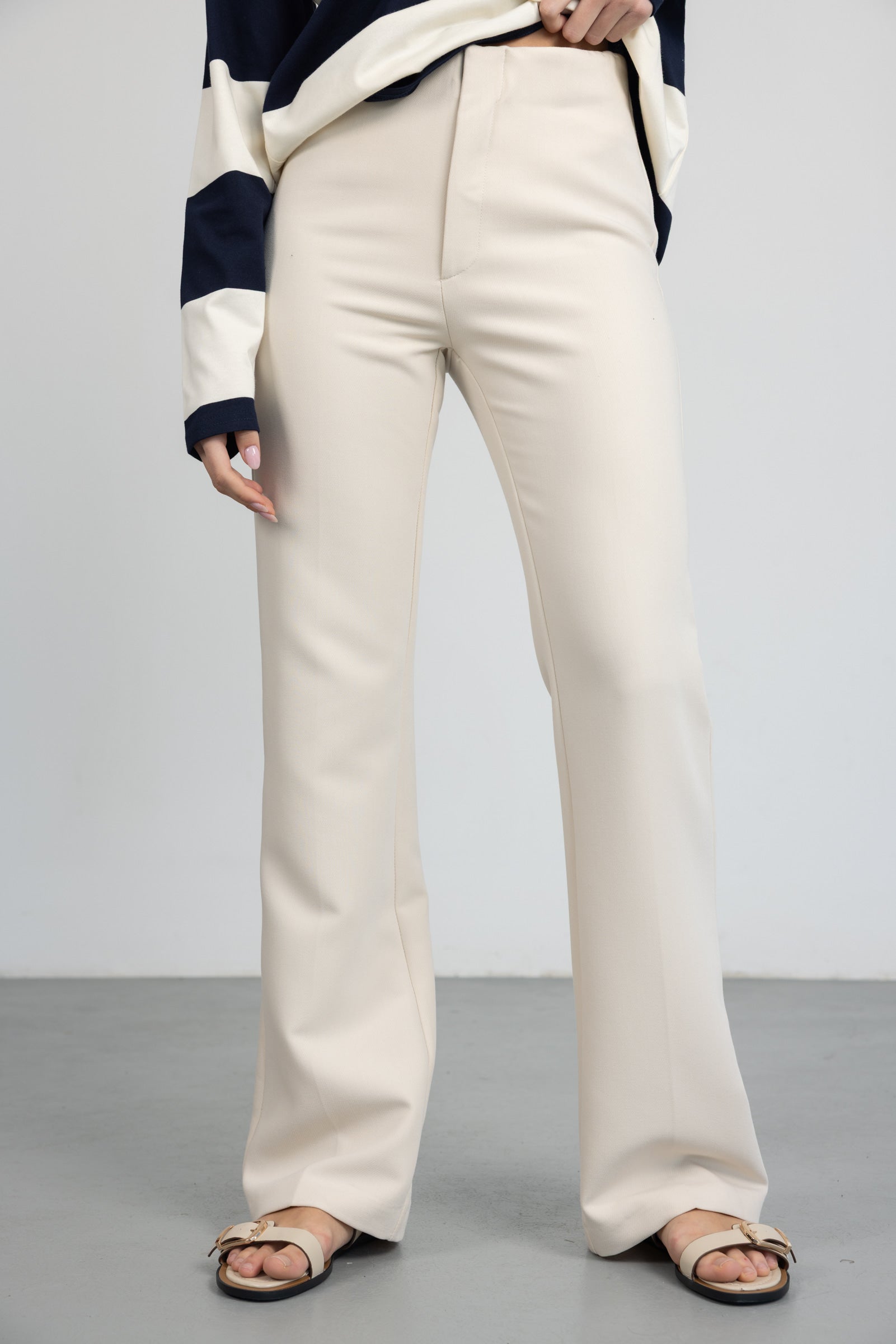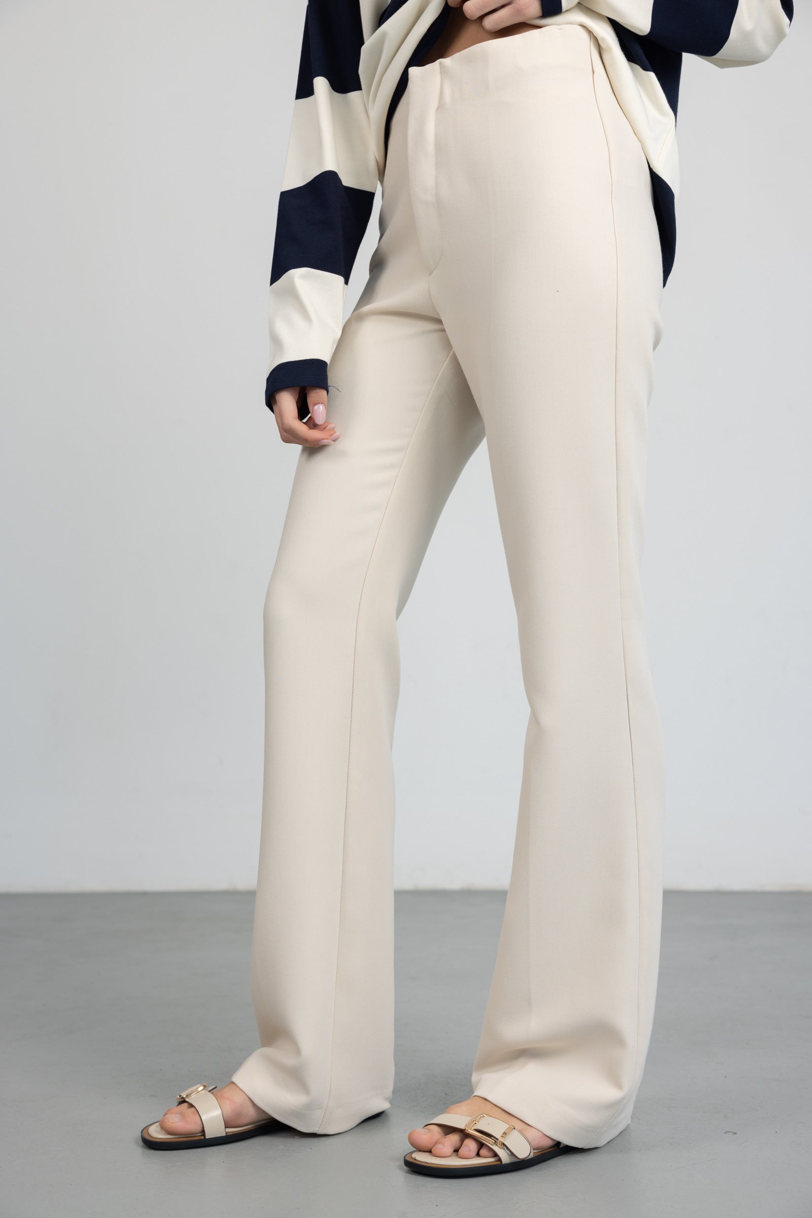 מכנסיים בגזרה מתרחבת עם מותן גבוהה. נסגרים ברוכסן וכפתור, ליצירת מראה חלק ואלגנטי.