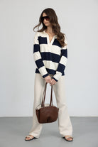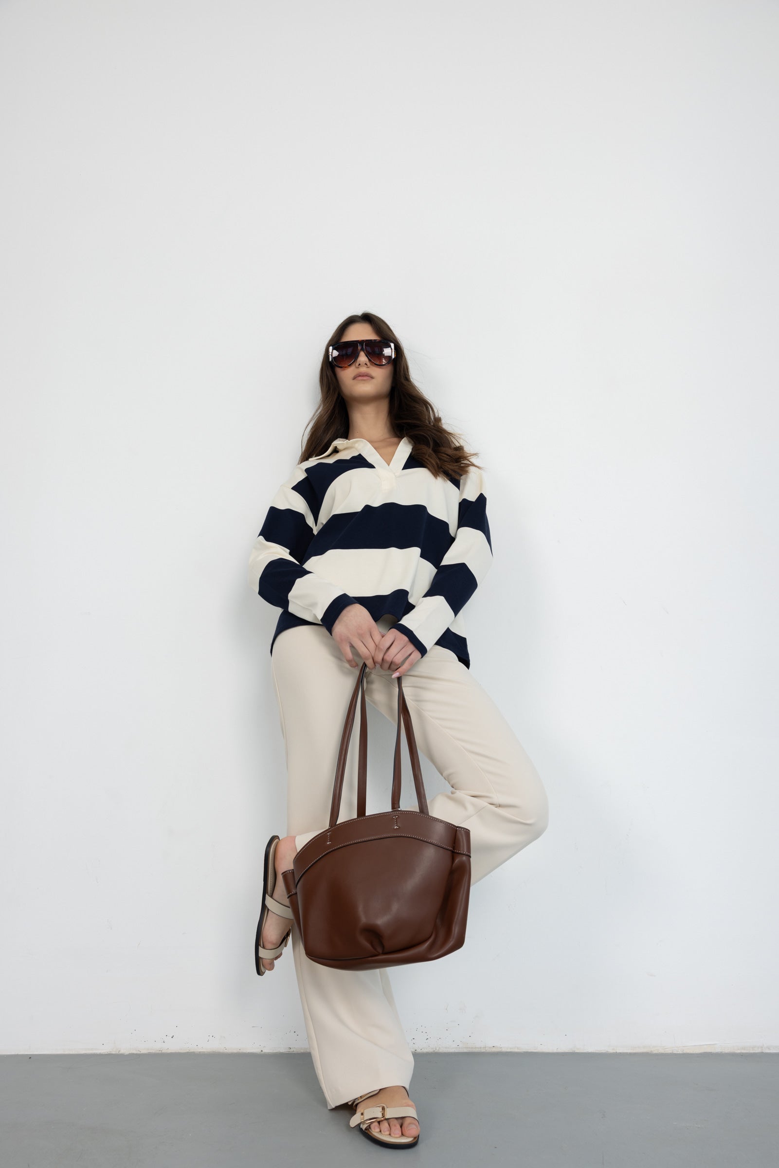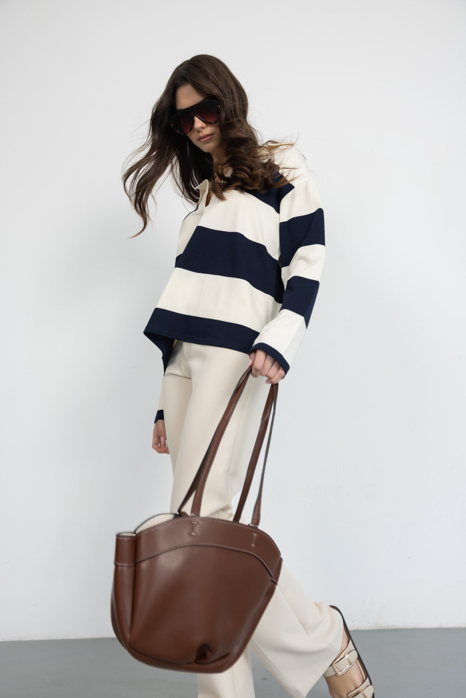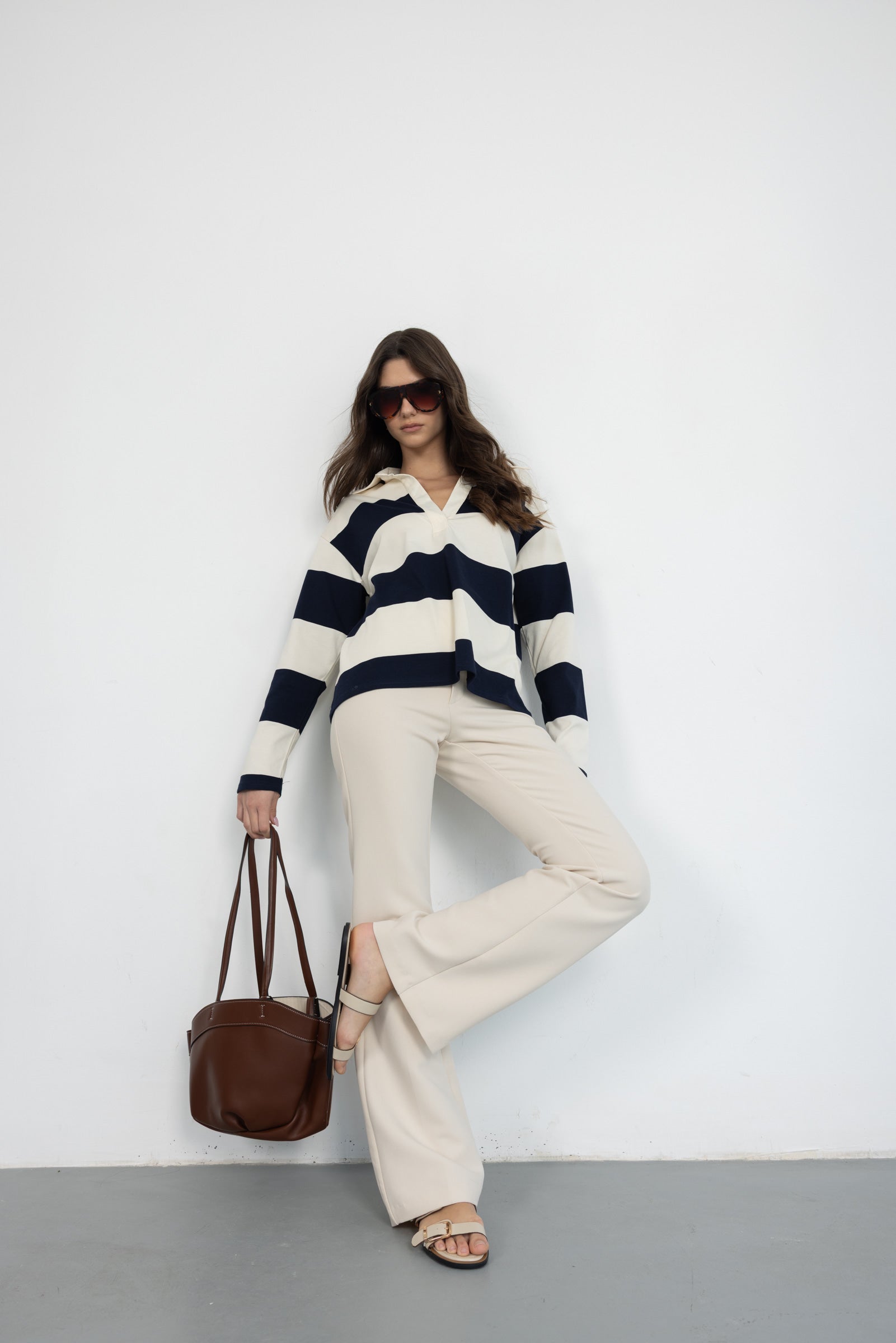 מכנסיים בגזרה מתרחבת עם מותן גבוהה. נסגרים ברוכסן וכפתור, ליצירת מראה חלק ואלגנטי.