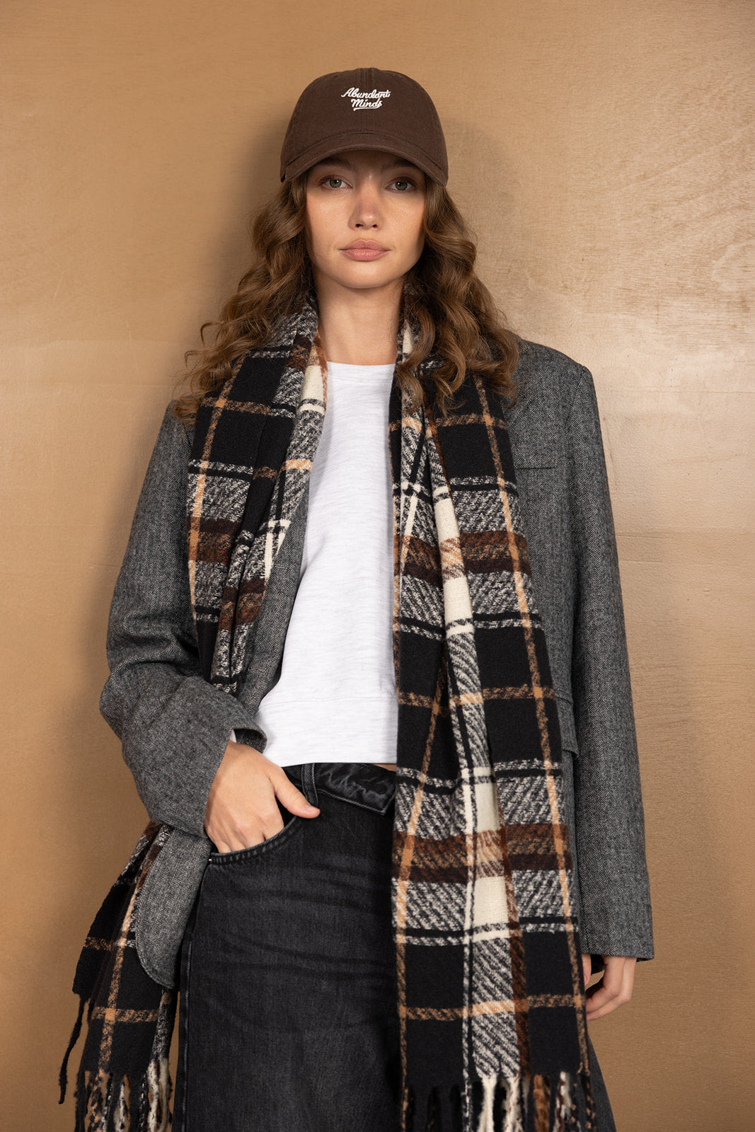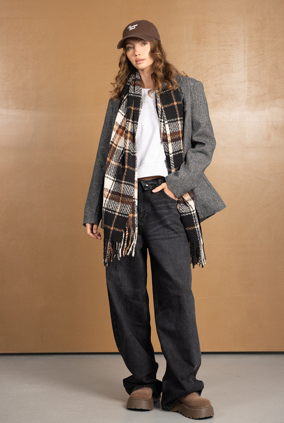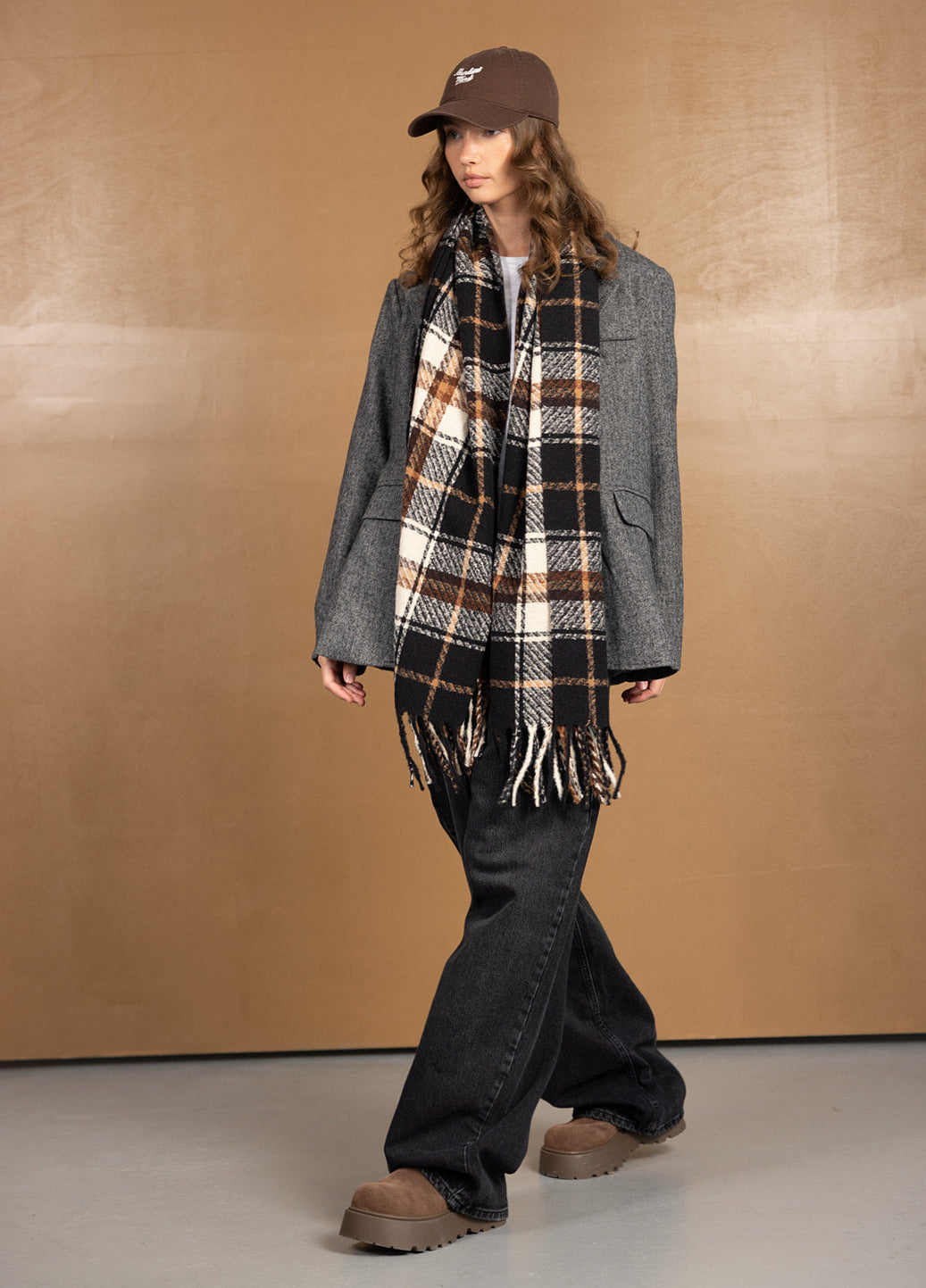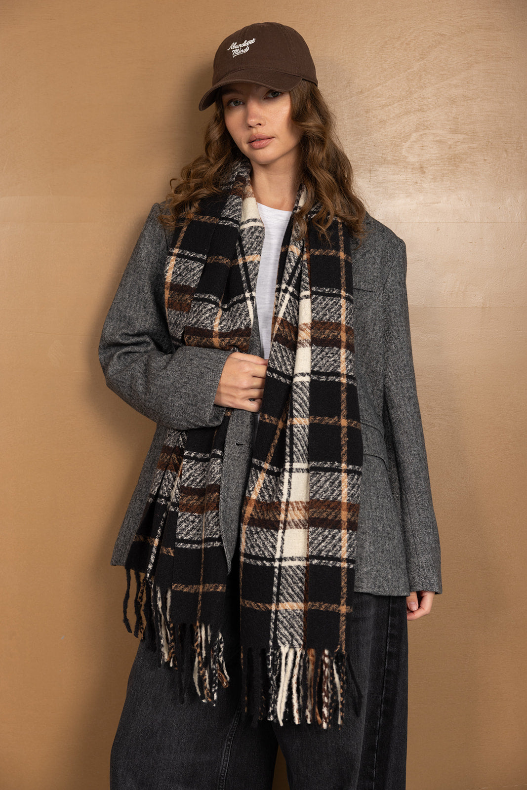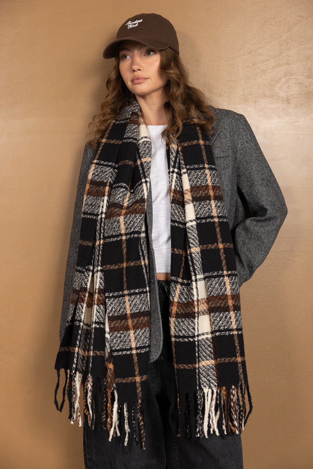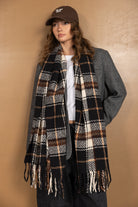 צעיף צמר קלאסי בשילוב דוגמה משובצת טרנדית ביותר לעונה וסיומת פרנזים.
