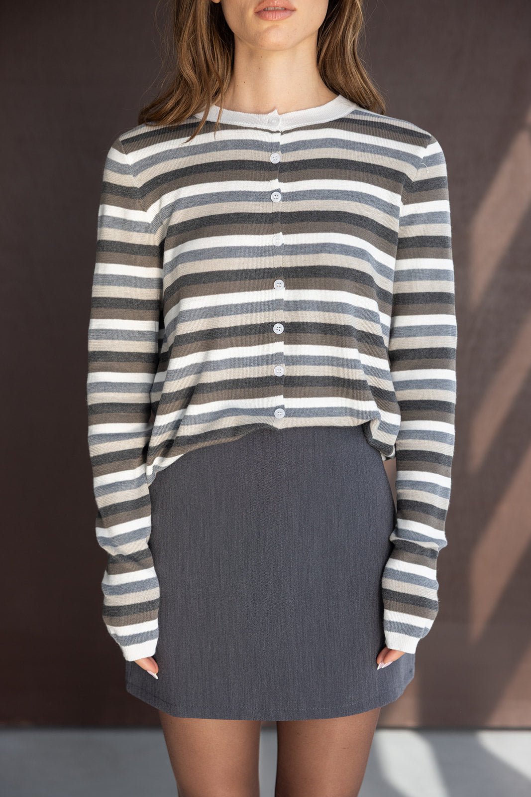 קרדיגן בגזרה צמודה ומחמיאה, עשוי בד נעים ביותר ואיכותי. בשילוב כפתורים לאורך והדפס פסים לרוחב הקרדיגן.