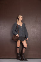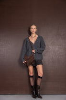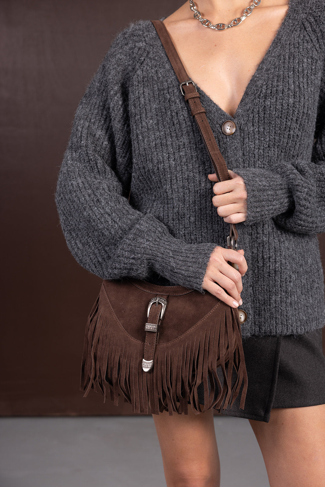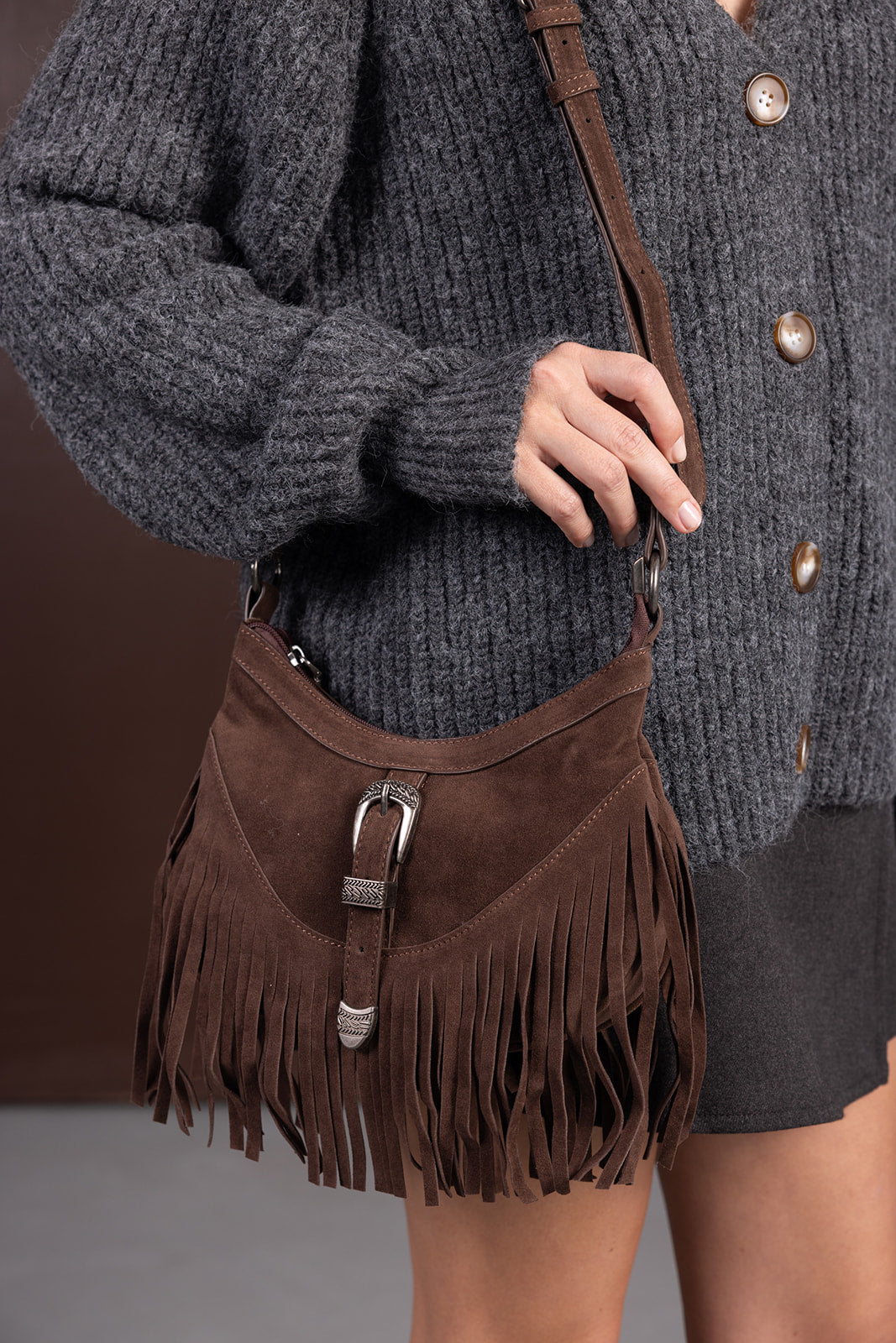 תיק כתף מעוצב מזמש רך בגוון חום, בשילוב פרנזים ארוכים. מגיע עם אבזם דקורטיבי בחזית ורצועה תואמת