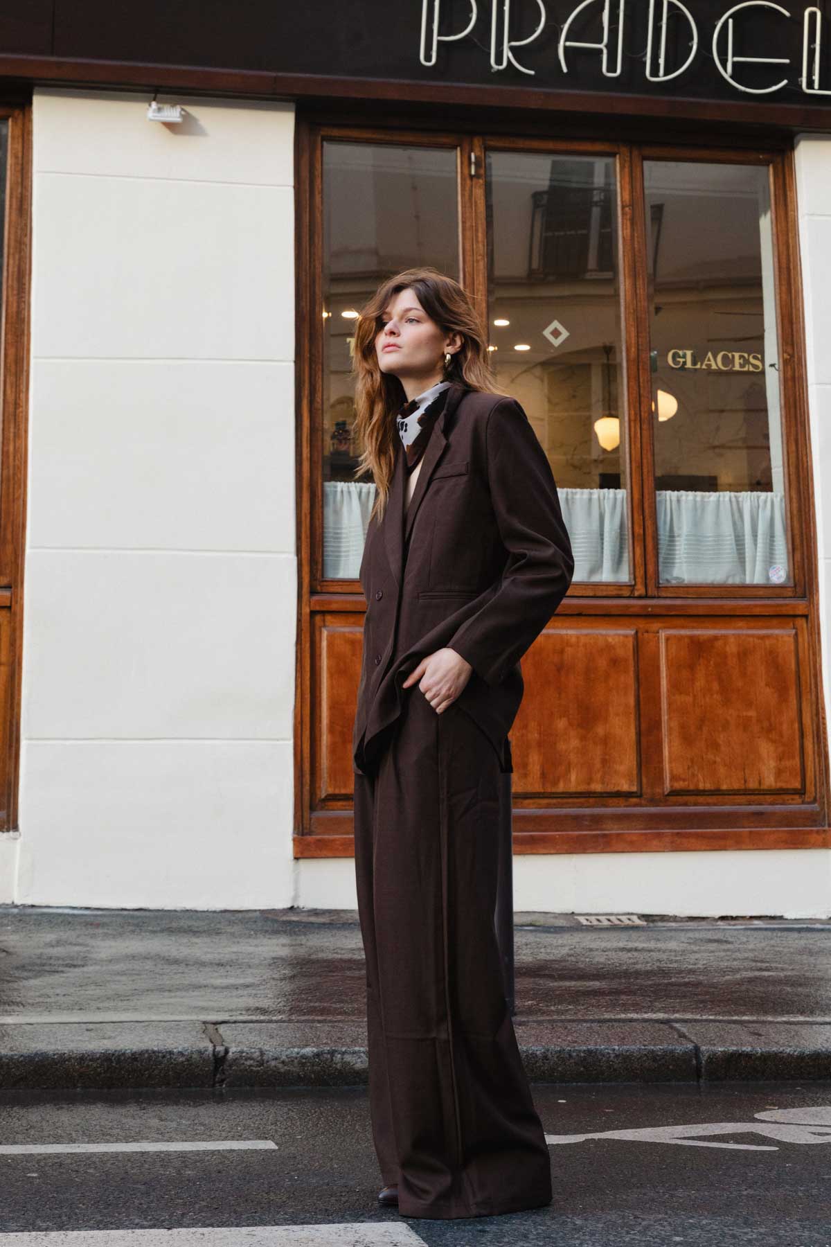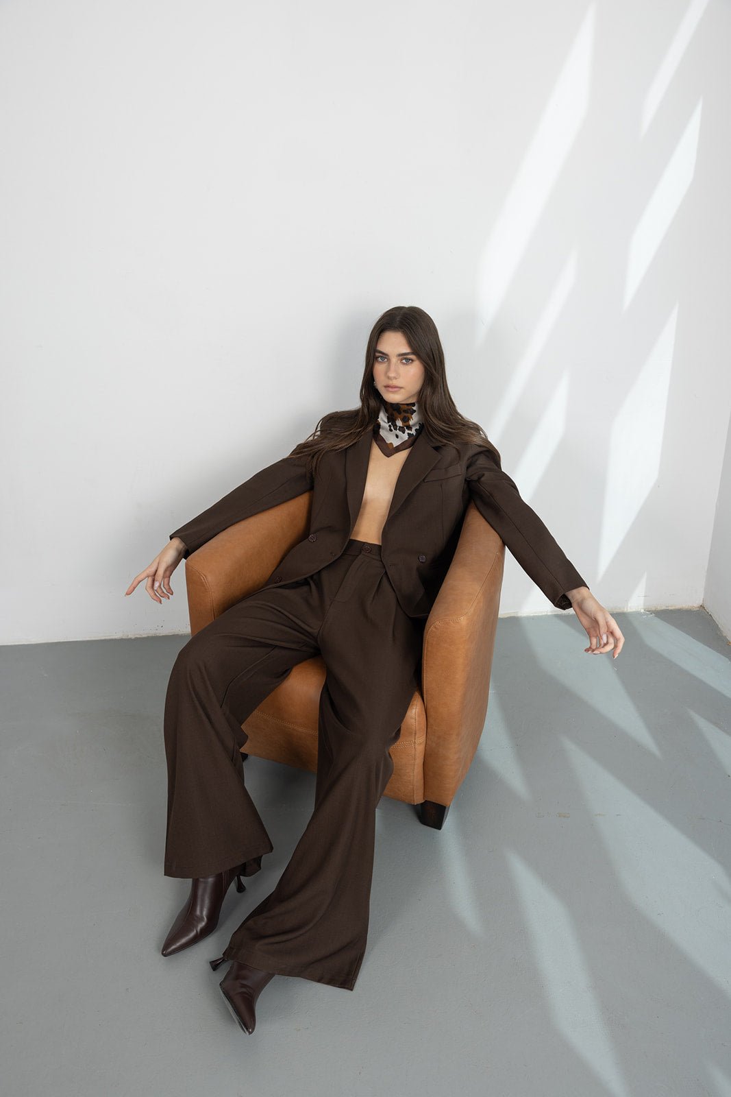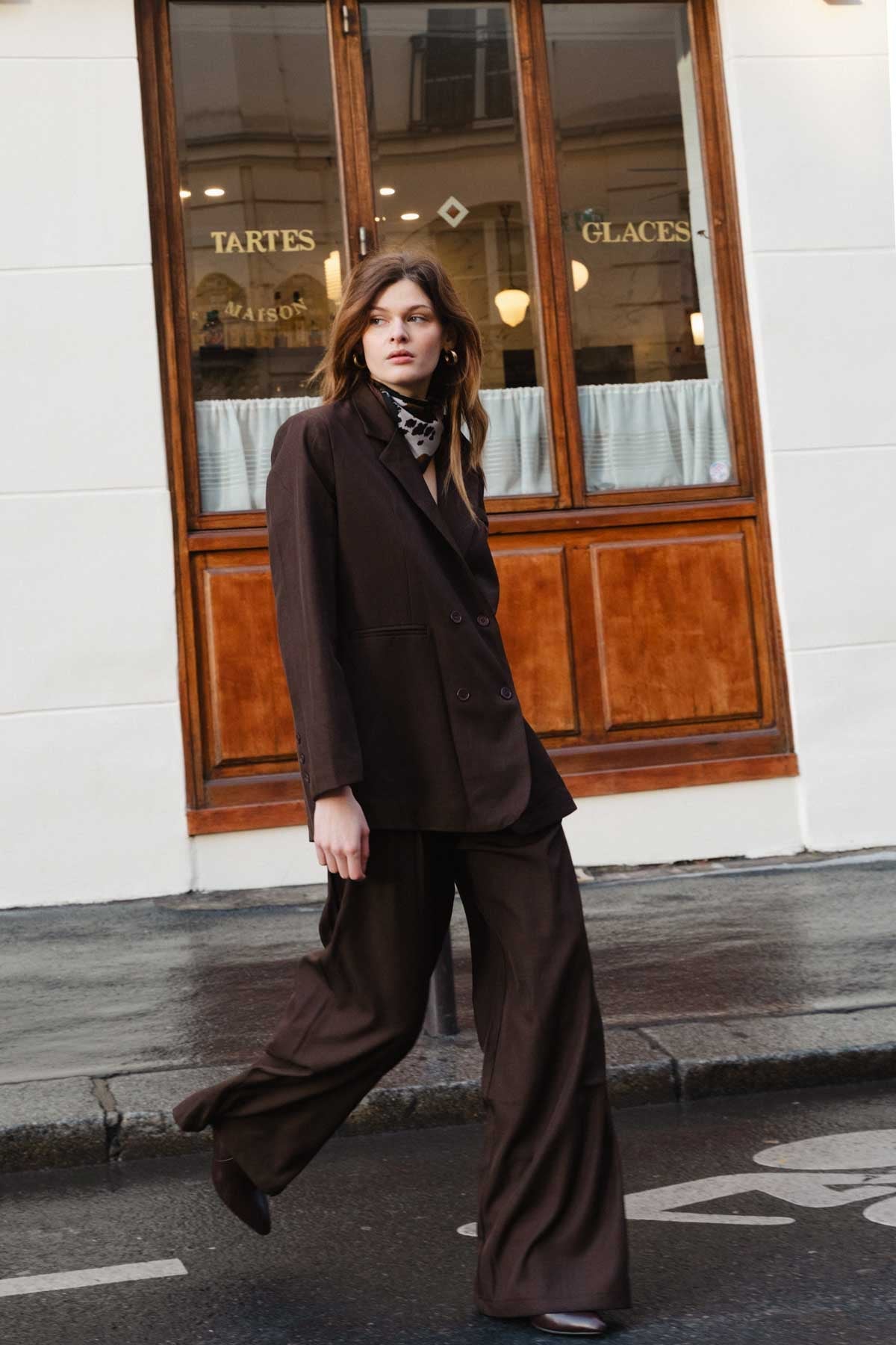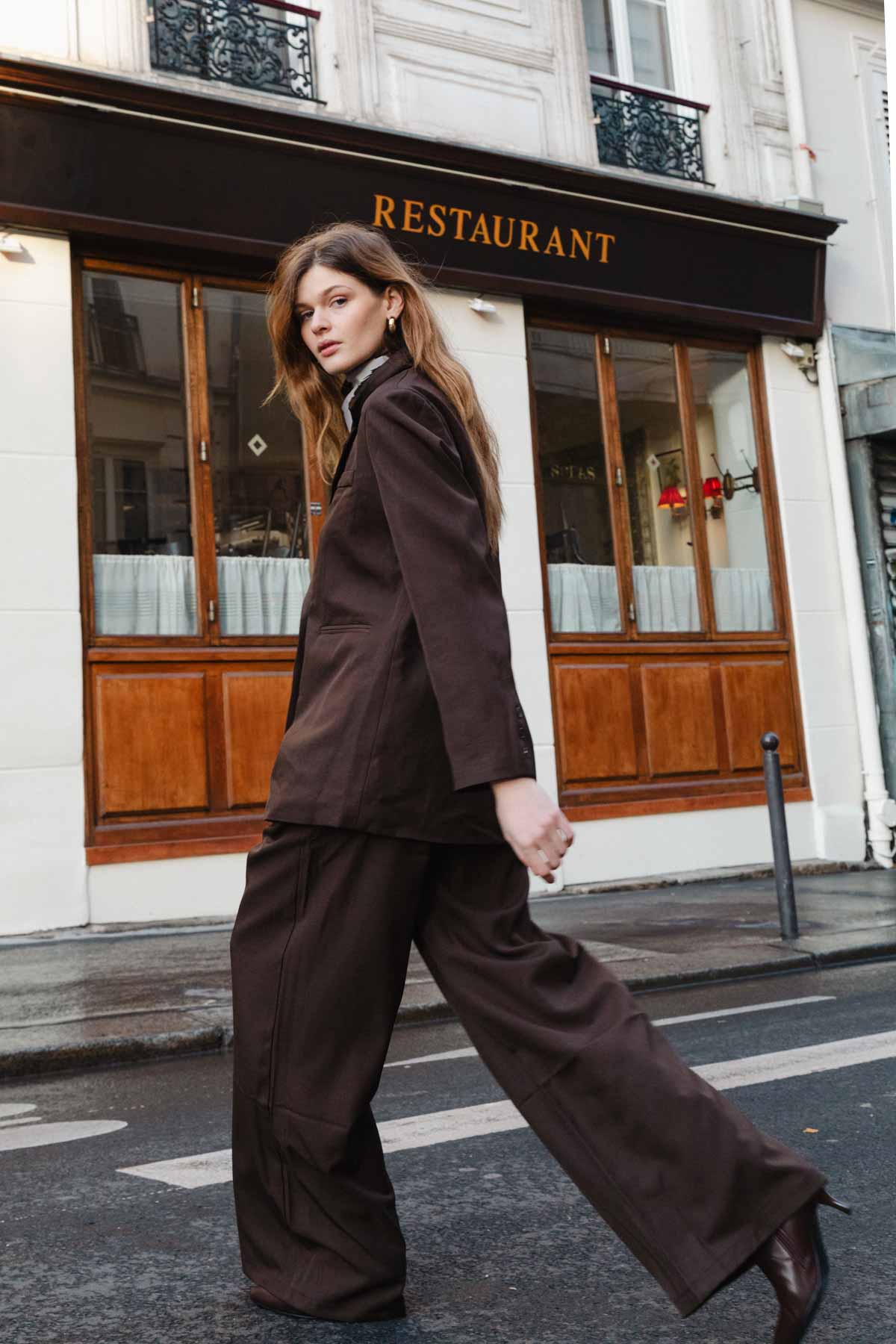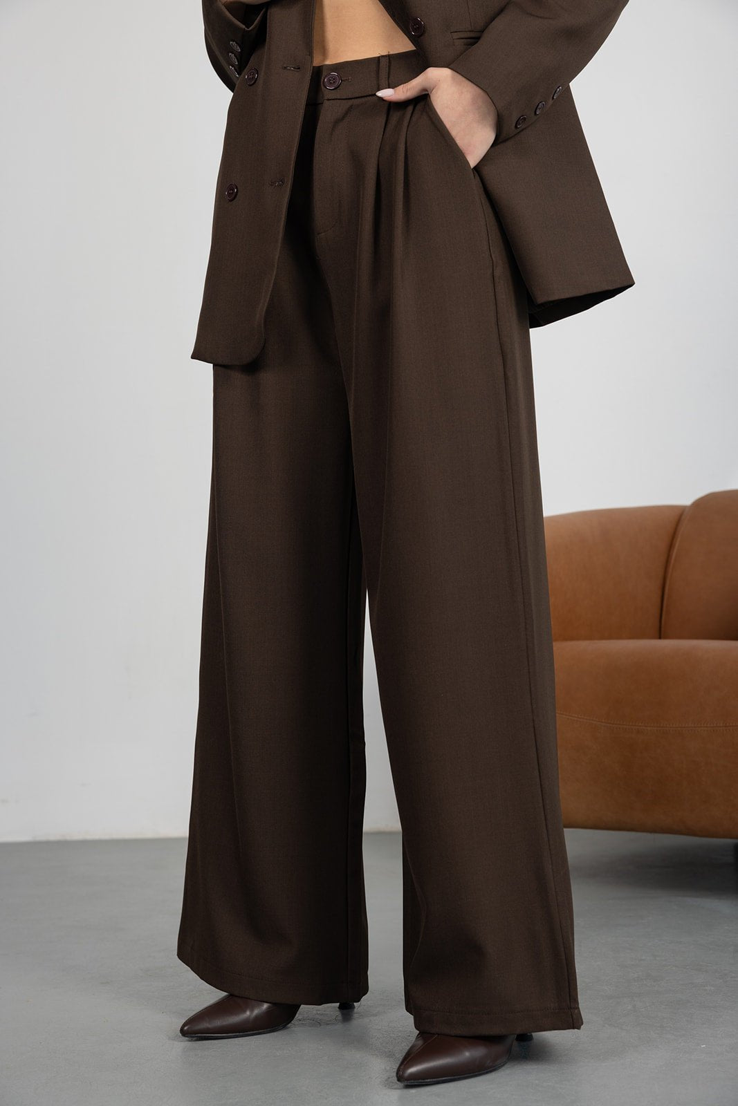 מכנס מחויט במראה קלאסי וגזרה משוחררת, עם כפתור ורוכסן ושני כיסים קדמיים.