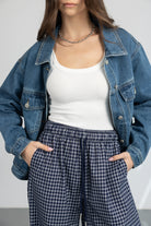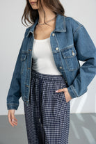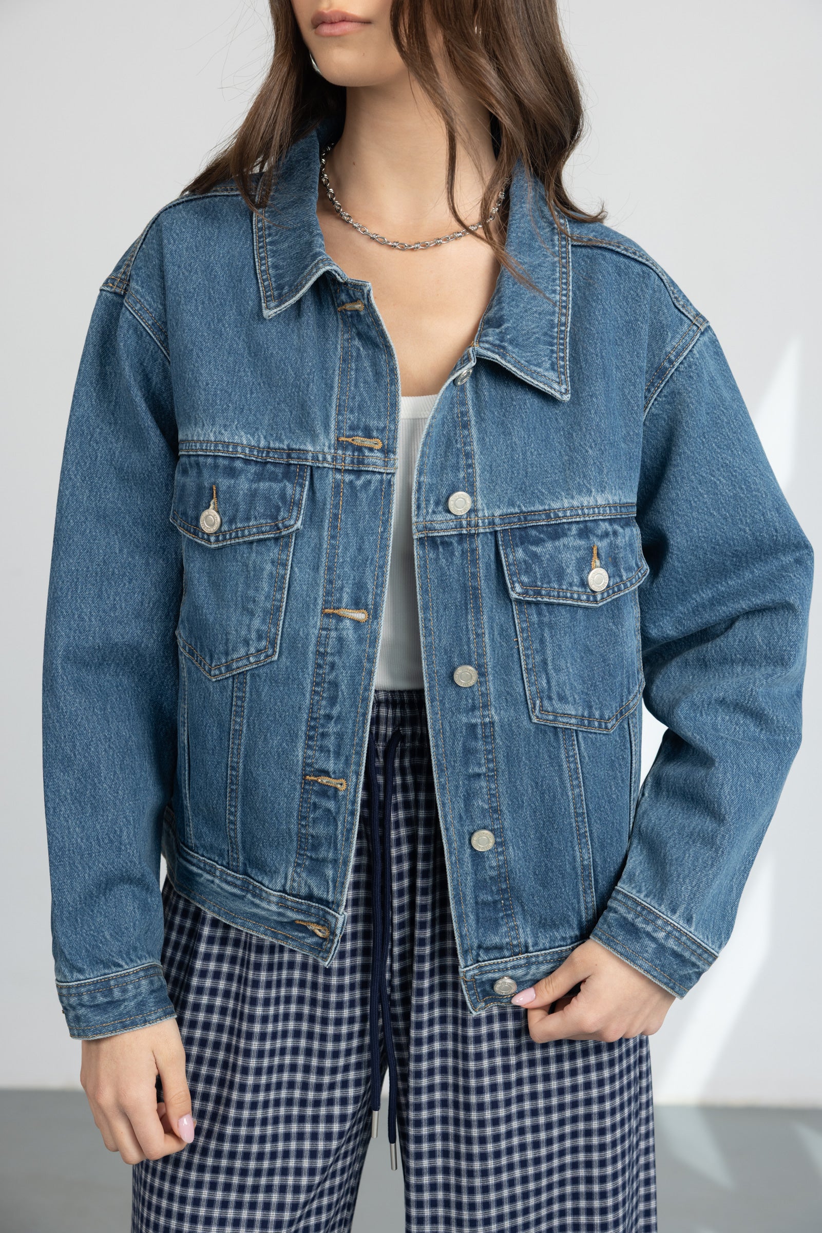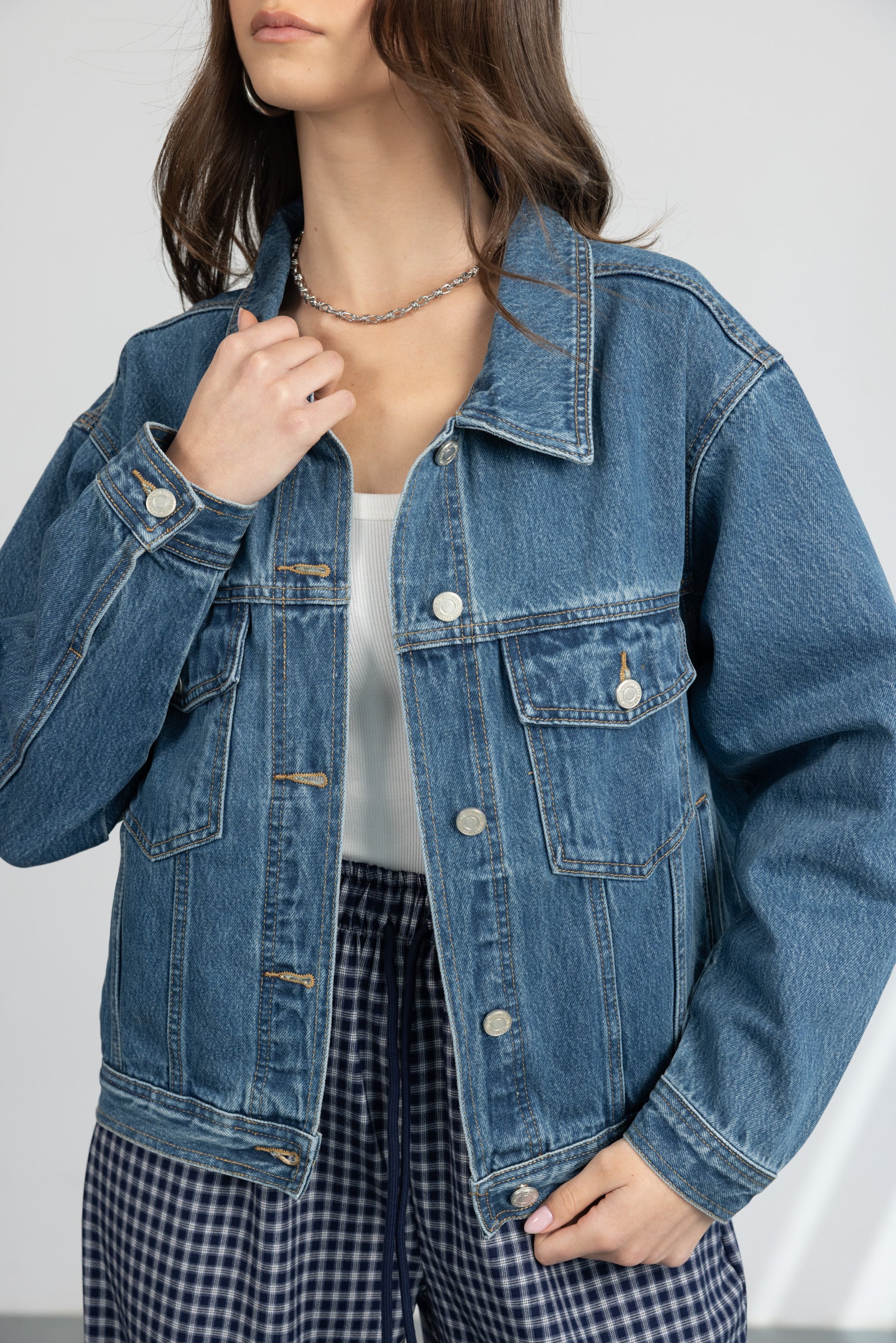 ג'קט ג'ינס במראה קלאסי, בשילוב שני כיסים, כפתורים וצווארון קלאסי.