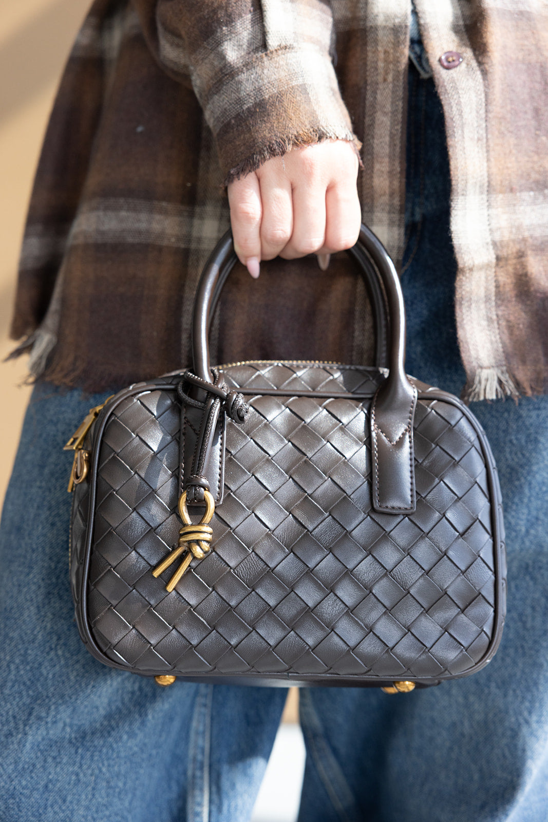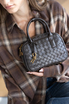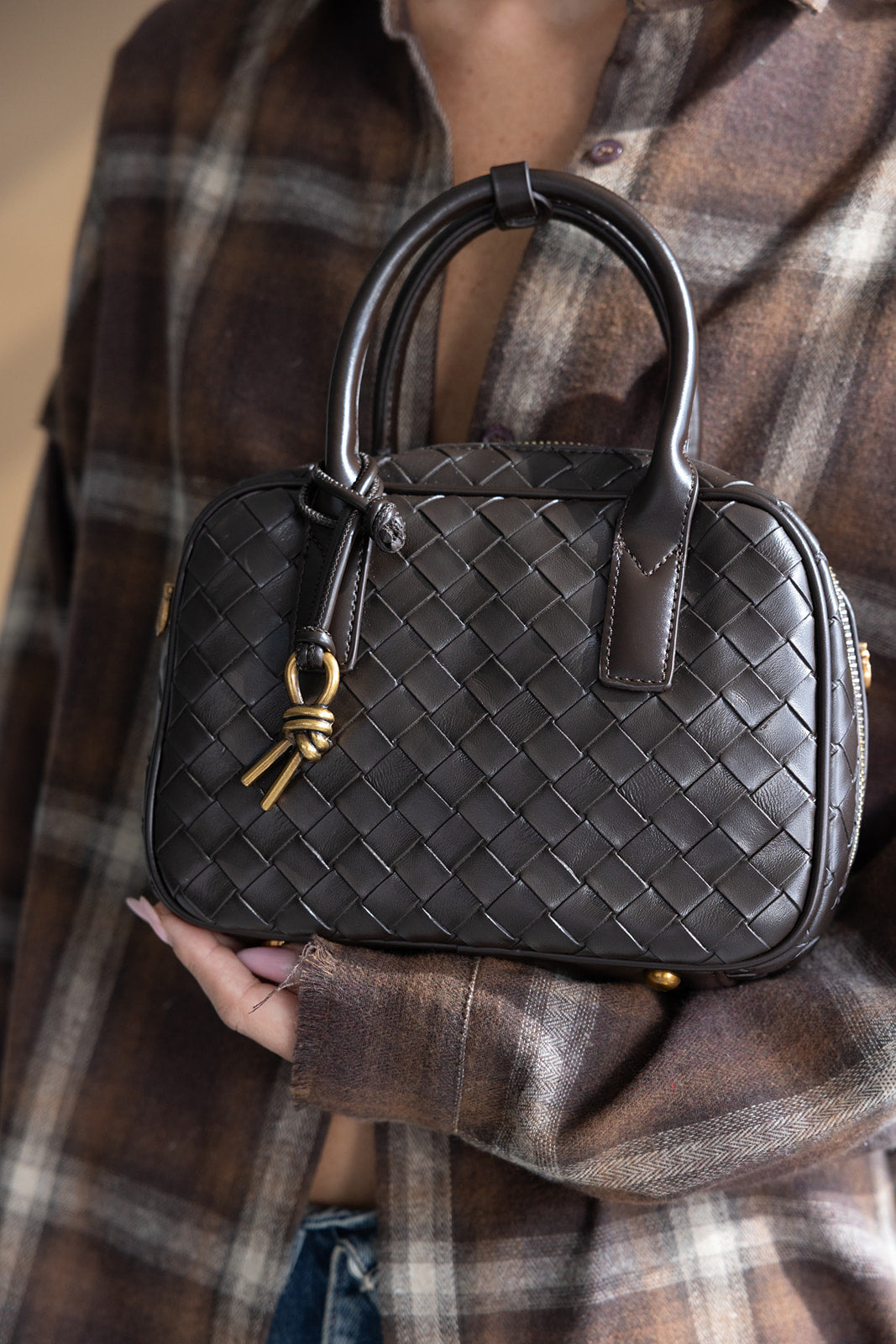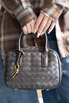 תיק יד בגודל קטן עשוי דמוי עור ארוג טרנדי, בשילוב רוכסן לסגירה.