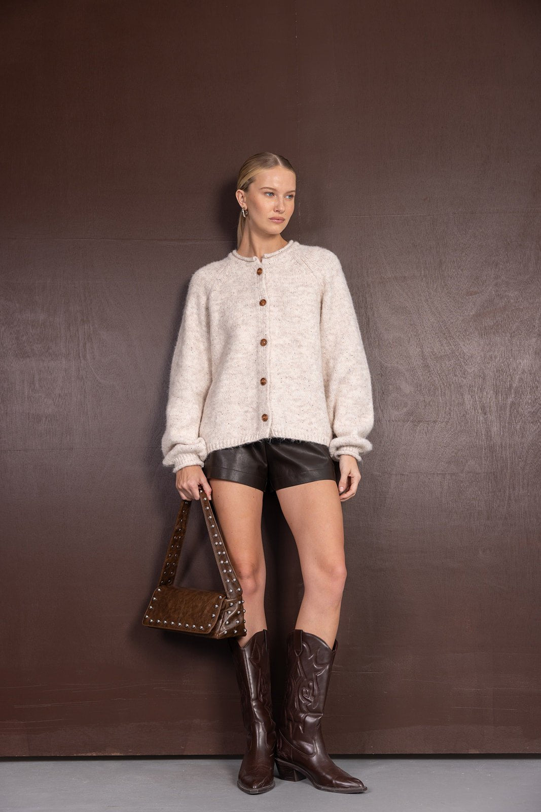 תיק צד עשוי דמוי עור איכותי במראה טרנדי, בשילוב ניטים כסופים. לתיק סגירת רוכסן.