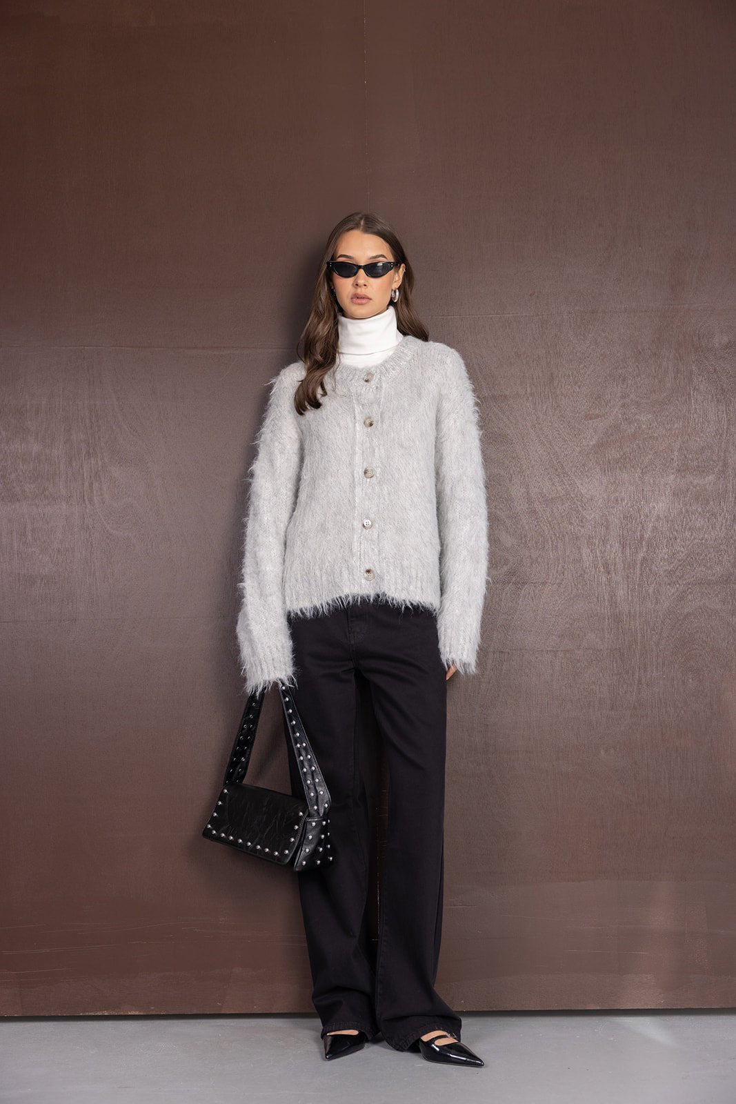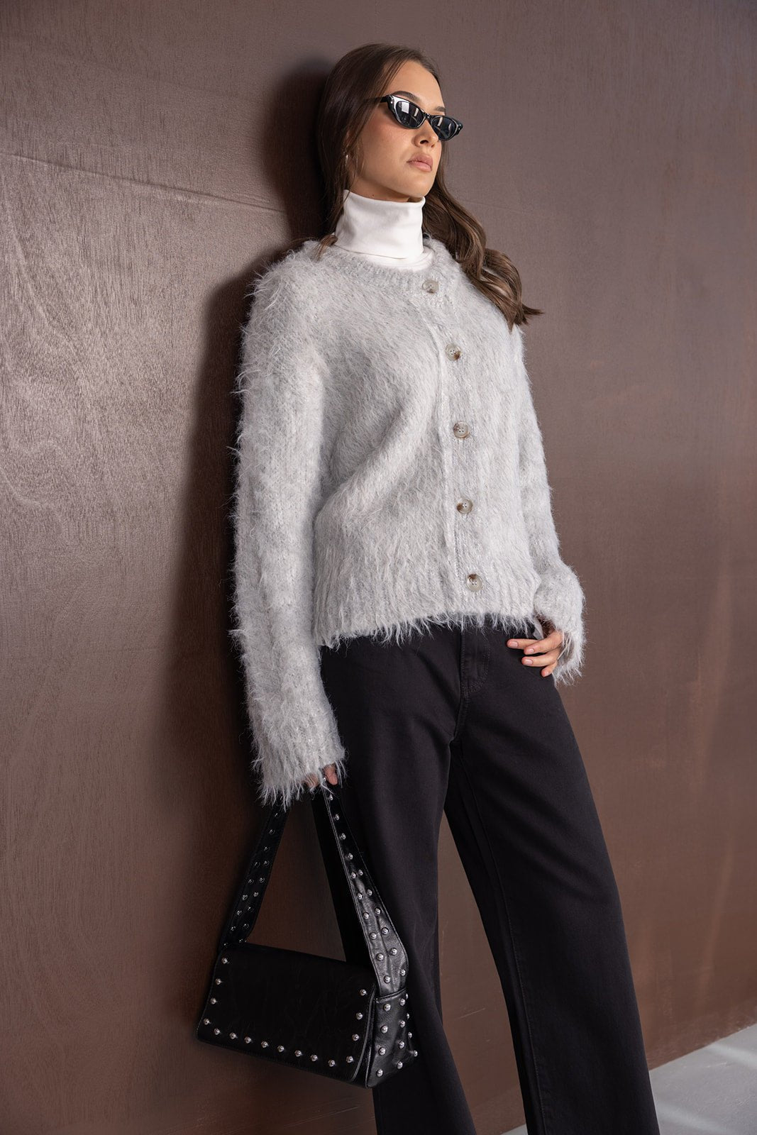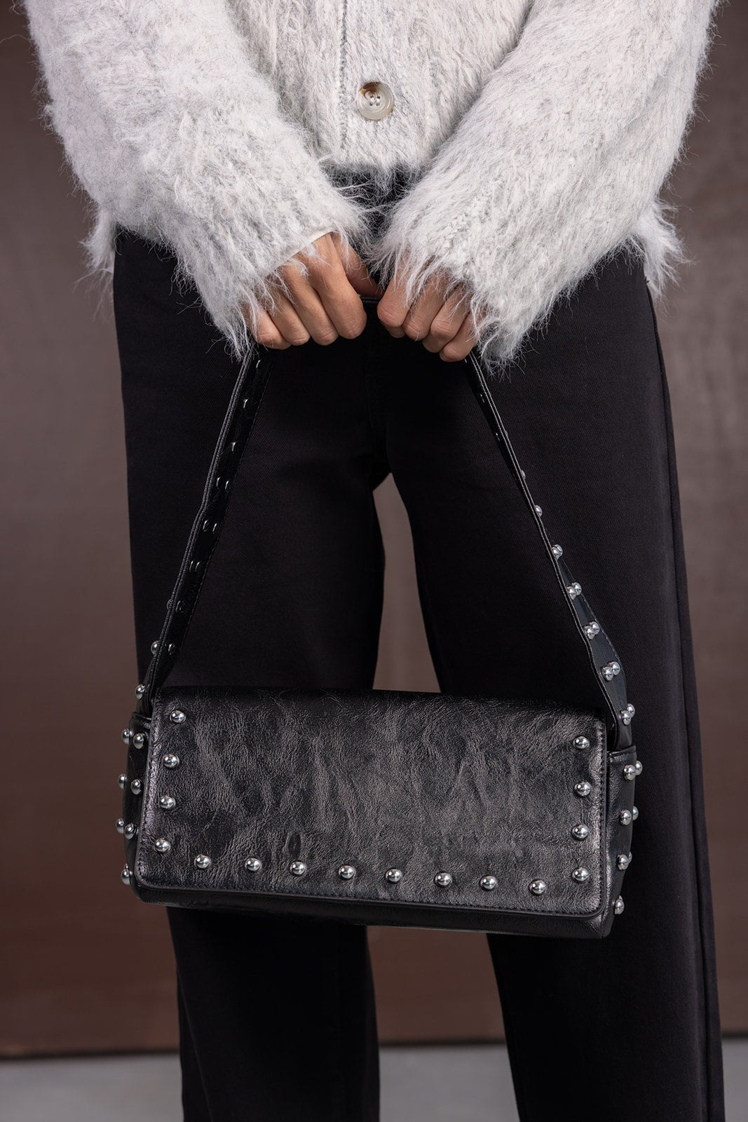 תיק צד עשוי דמוי עור איכותי במראה טרנדי, בשילוב ניטים כסופים. לתיק סגירת רוכסן.