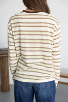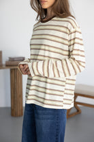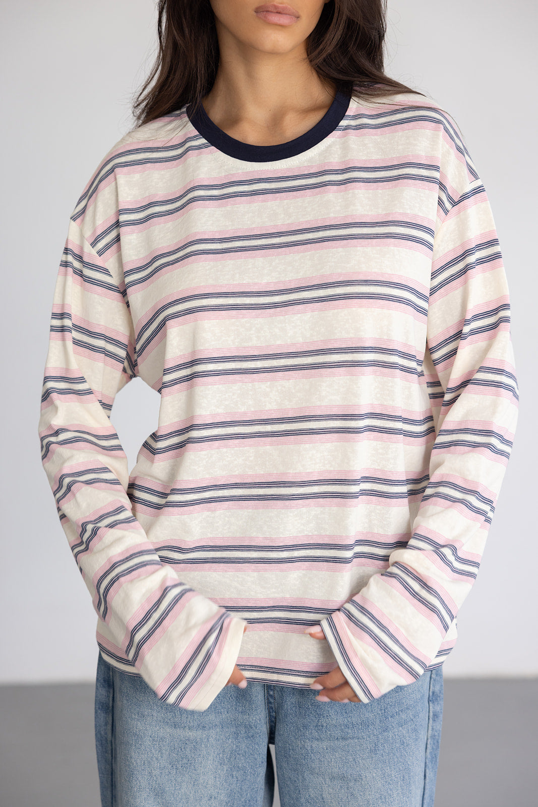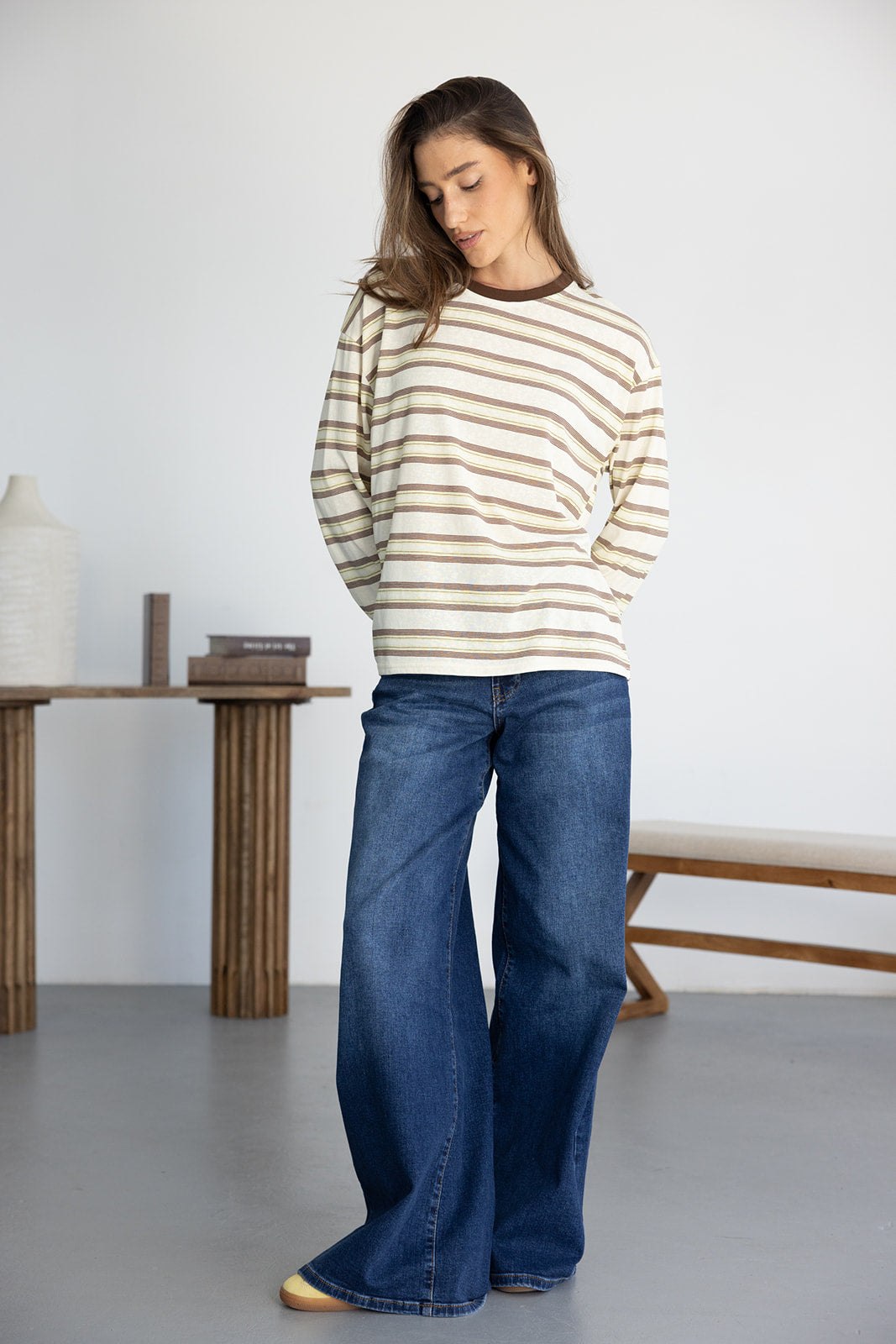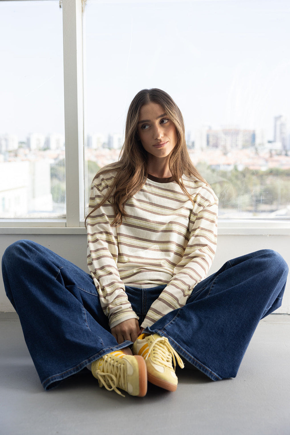 חולצת ארוכה בגזרה משוחררת מעט ומבד נעים ביותר. בשילוב צווארון ניקי עגול קלאסי בצבע כחול כהה ודוגמת פסים לרוחב החולצה.
