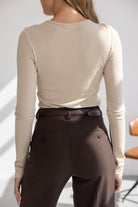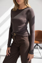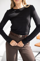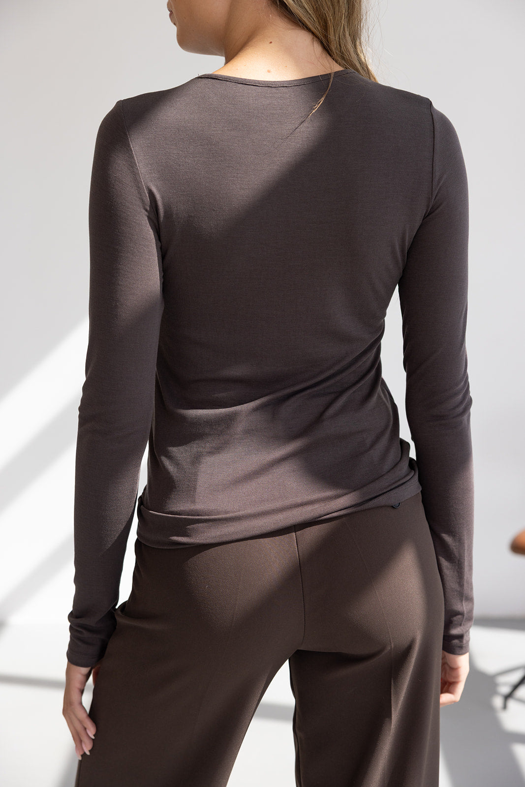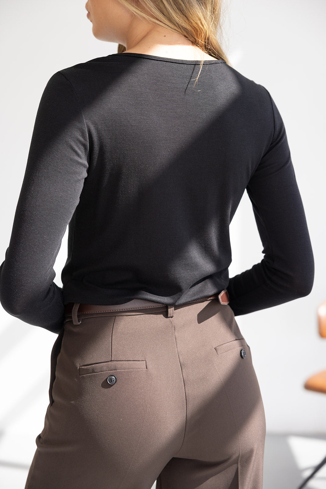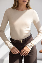 חולצת בייסיק מבד נעים ואיכותי ביותר, מעט שקפקף אך אלגנטי. החולצה בגזרה צמודה ומחמיאה, בשילוב שרוולים ארוכים המתאימים לעונה וצווארון עגול קלאסי.