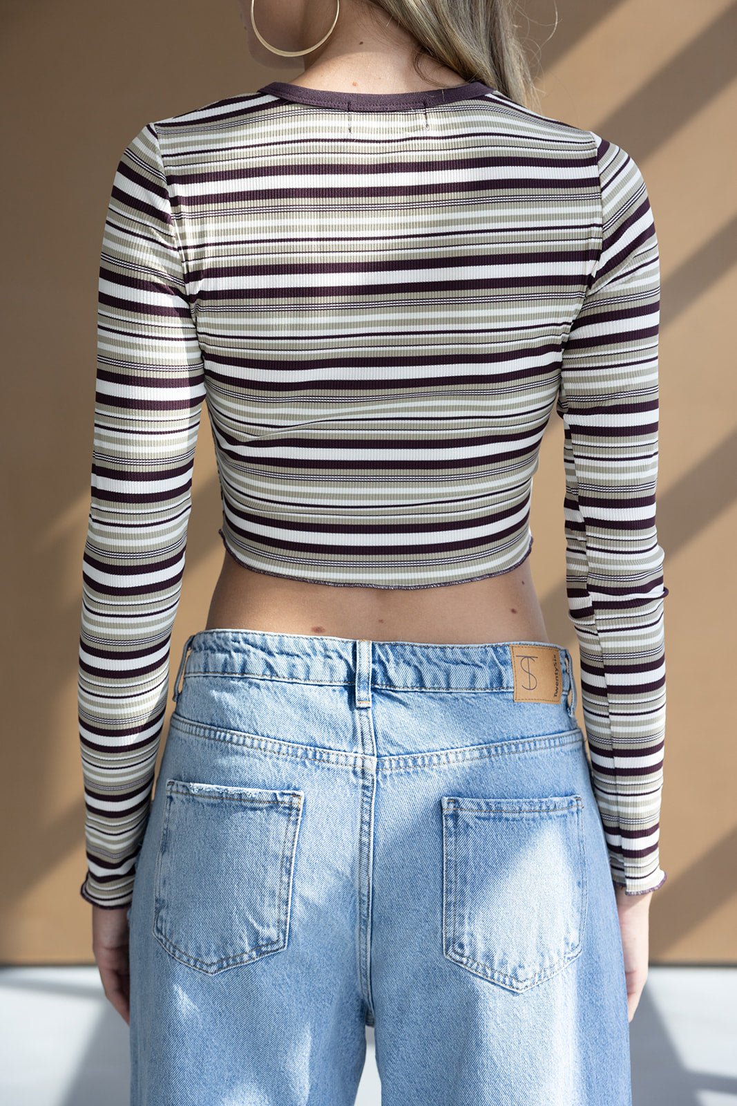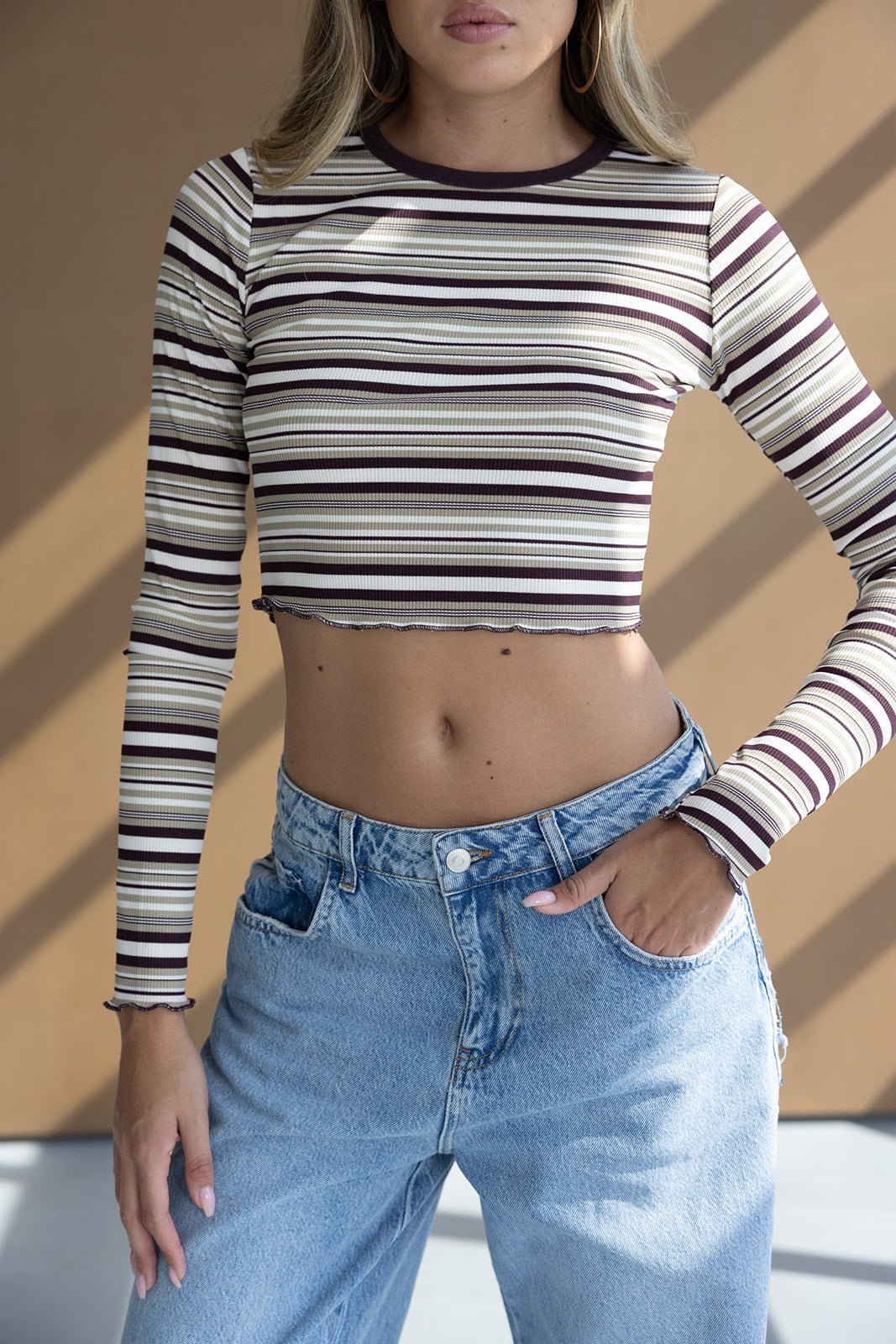 חולצה מבד ריב נעים ביותר, בשילוב צווארון עגול בצבע בולט למראה טרנדי, סיומת מלמלה בחלק התחתון ובקצוות השרוולים ודוגמת פסים לרוחב החולצה.