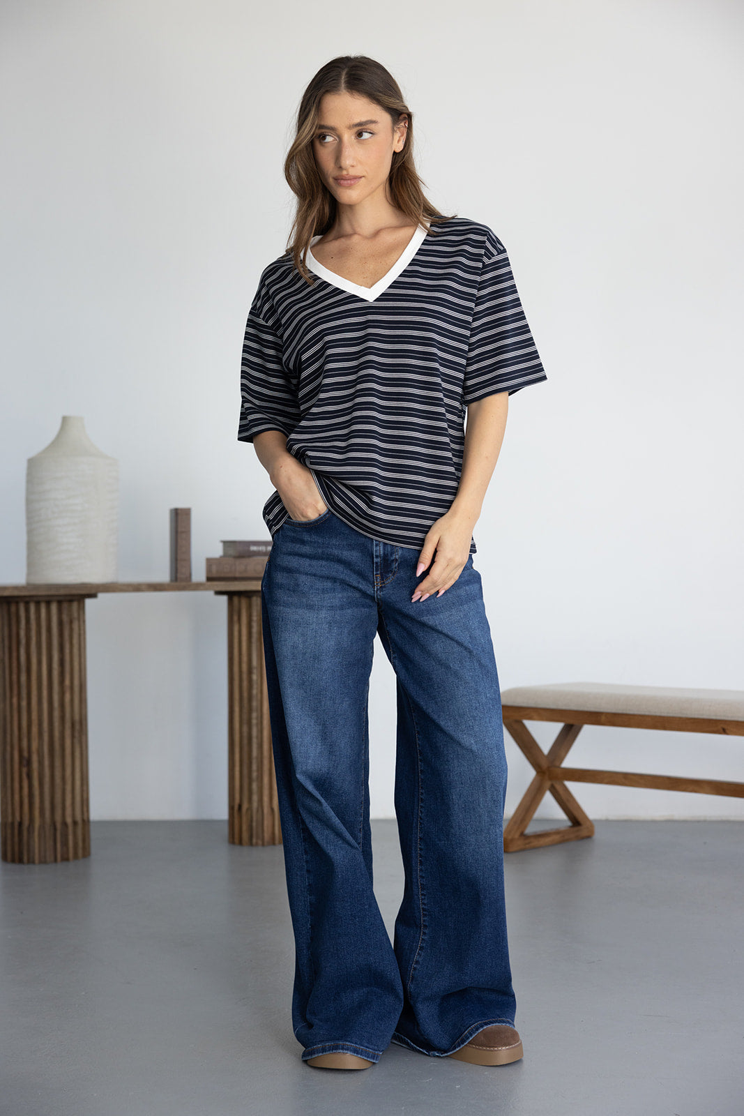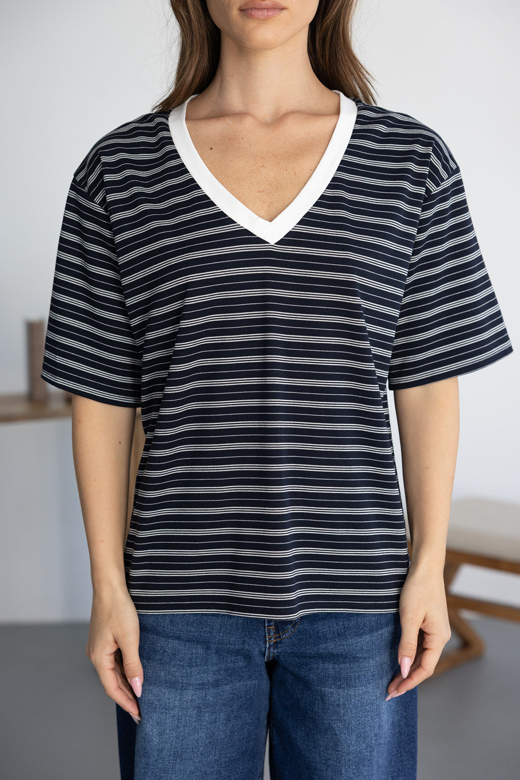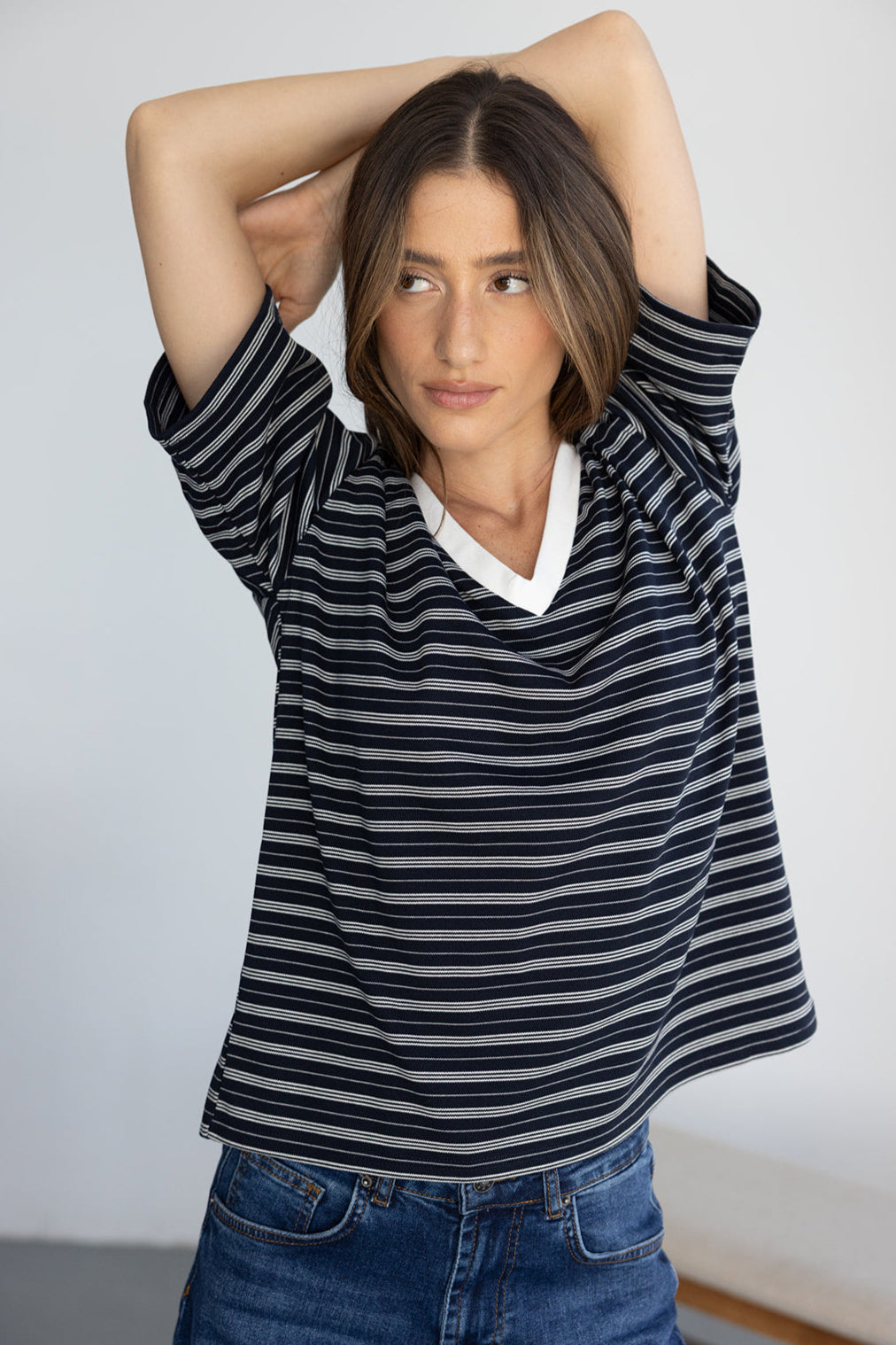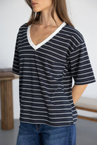 חולצת בייסיק מבד נעים ואיכותי ובגזרה מעט משוחררת. בשילוב צווארון וי בצבע לבן והדפס פסים לרוחב החולצה.