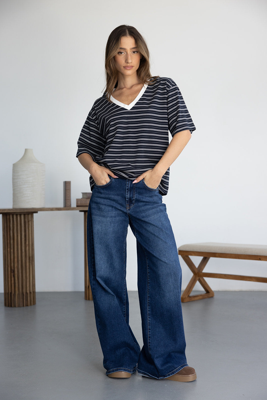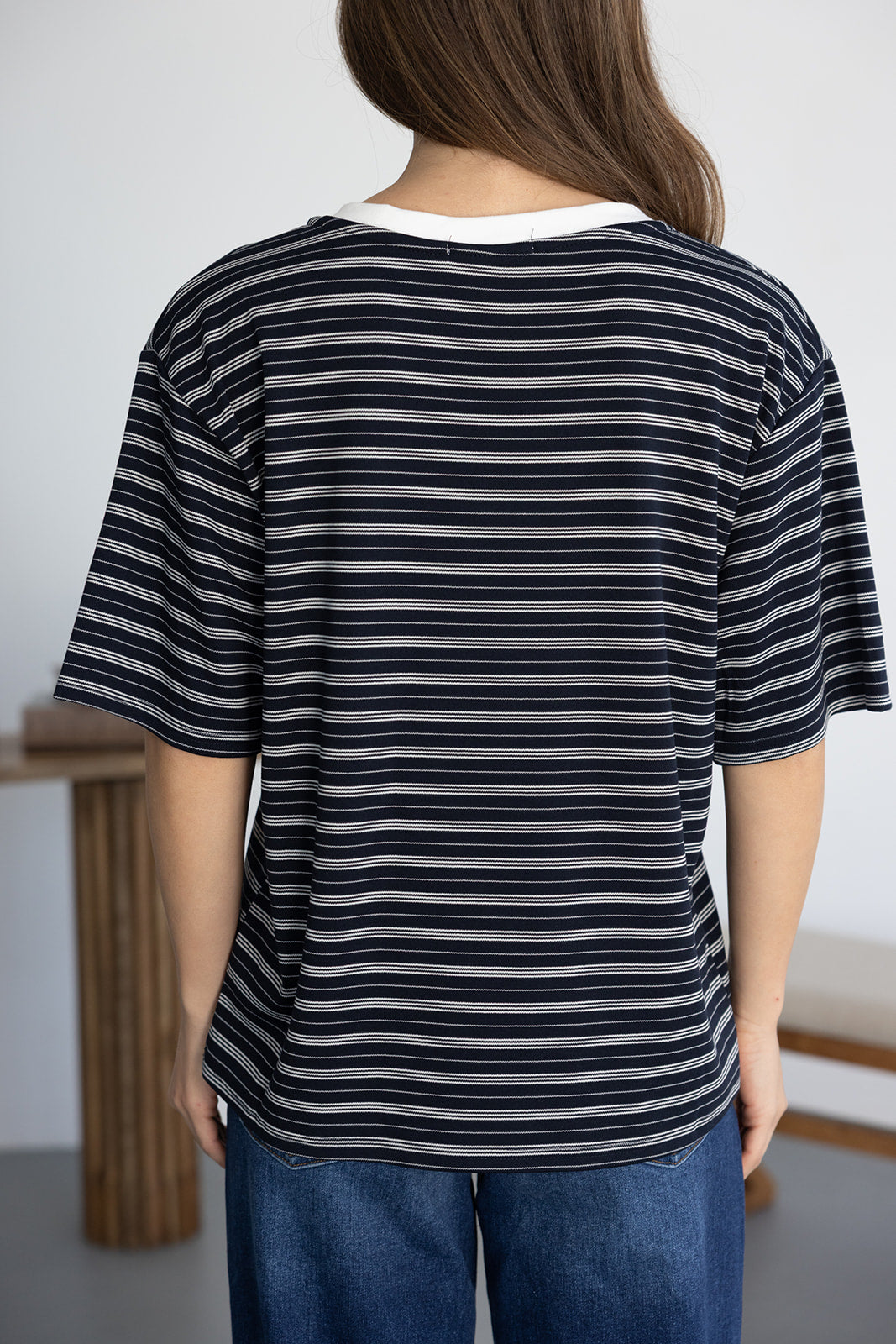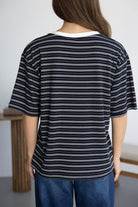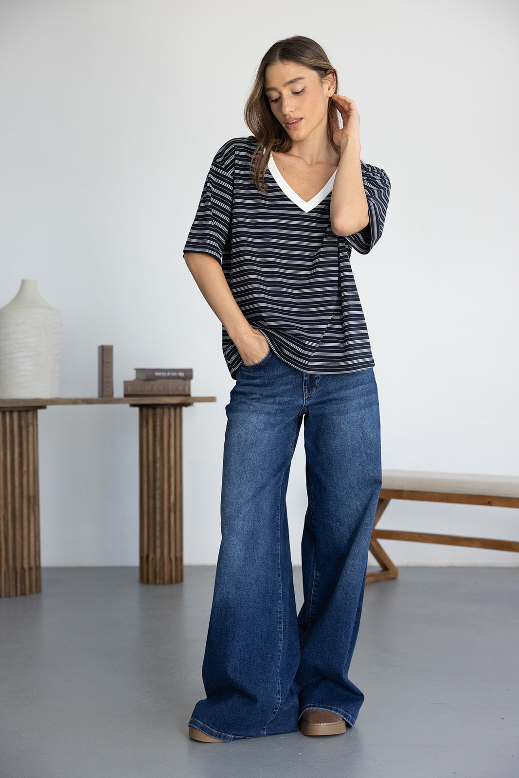 חולצת בייסיק מבד נעים ואיכותי ובגזרה מעט משוחררת. בשילוב צווארון וי בצבע לבן והדפס פסים לרוחב החולצה.