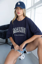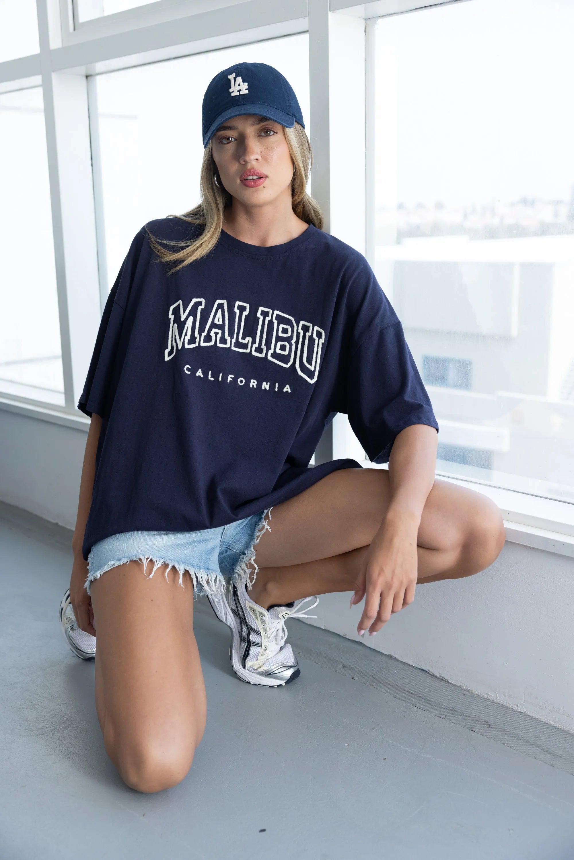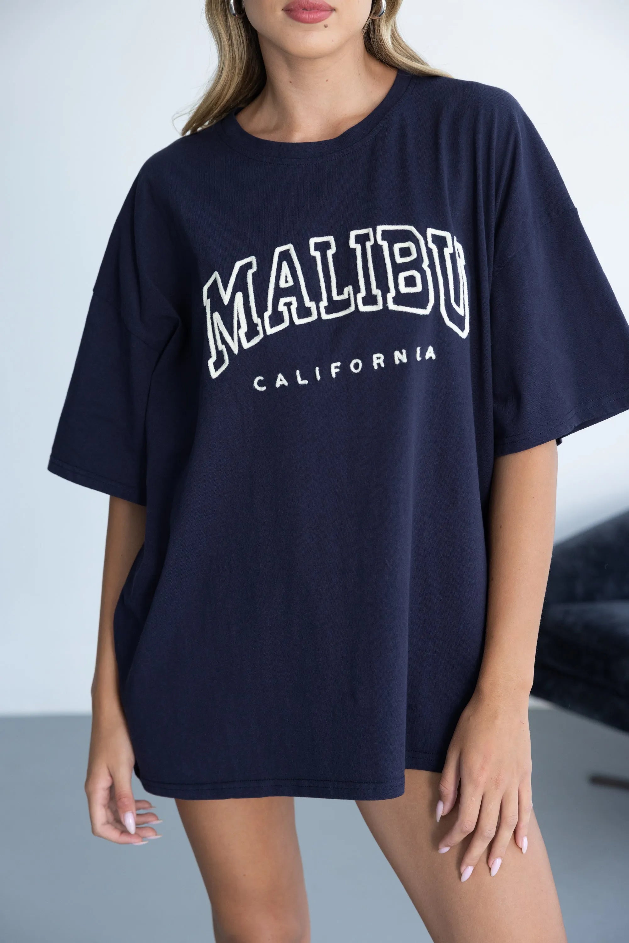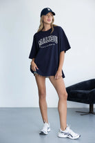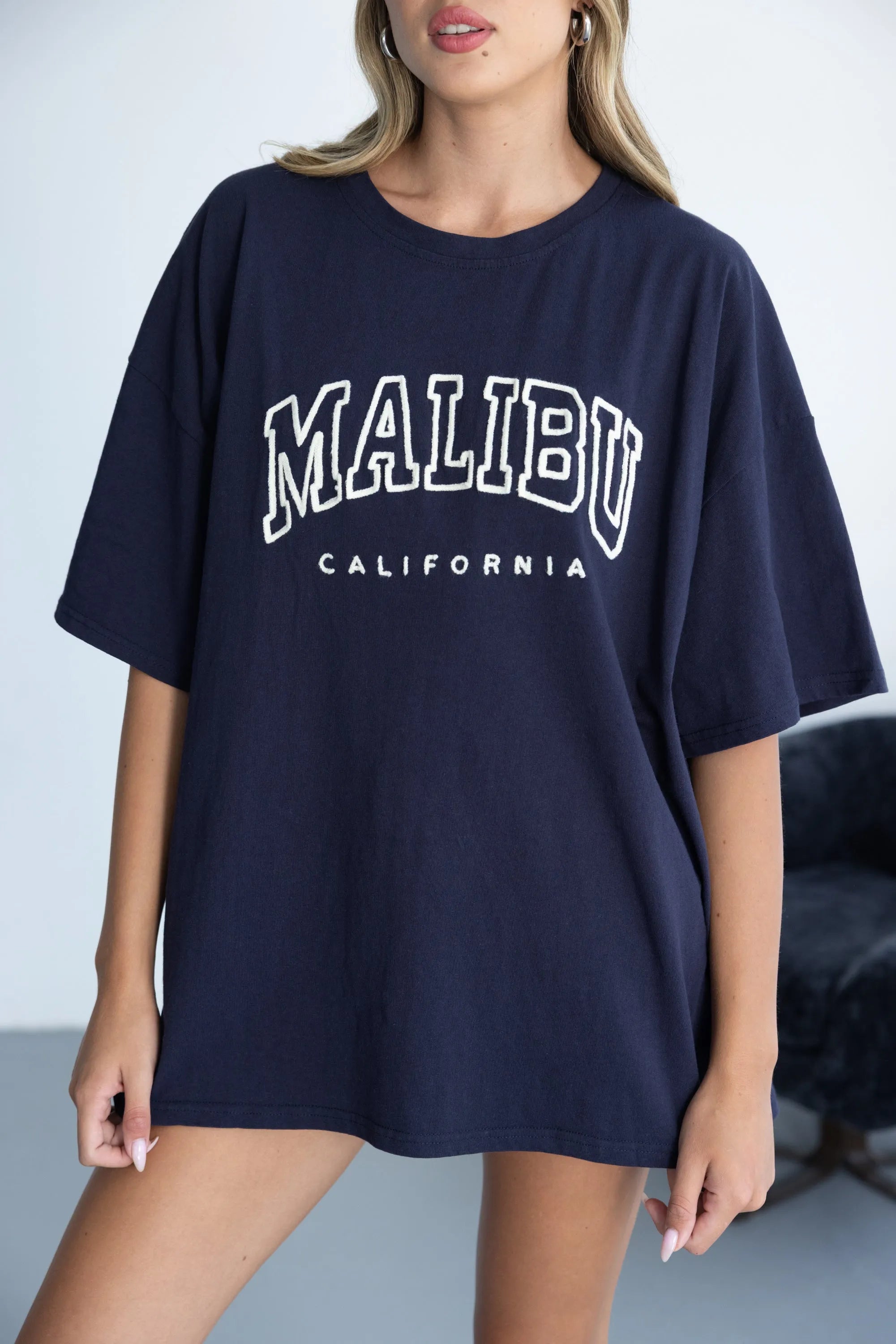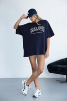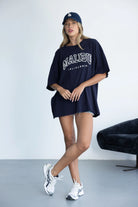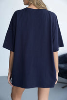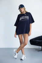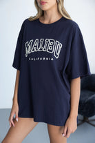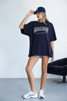 חולצת אוברסייז כחולה בשילוב כיתוב טרנדי, בד נעים ואיכותי המתאים לעונה.