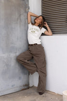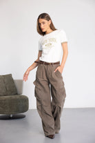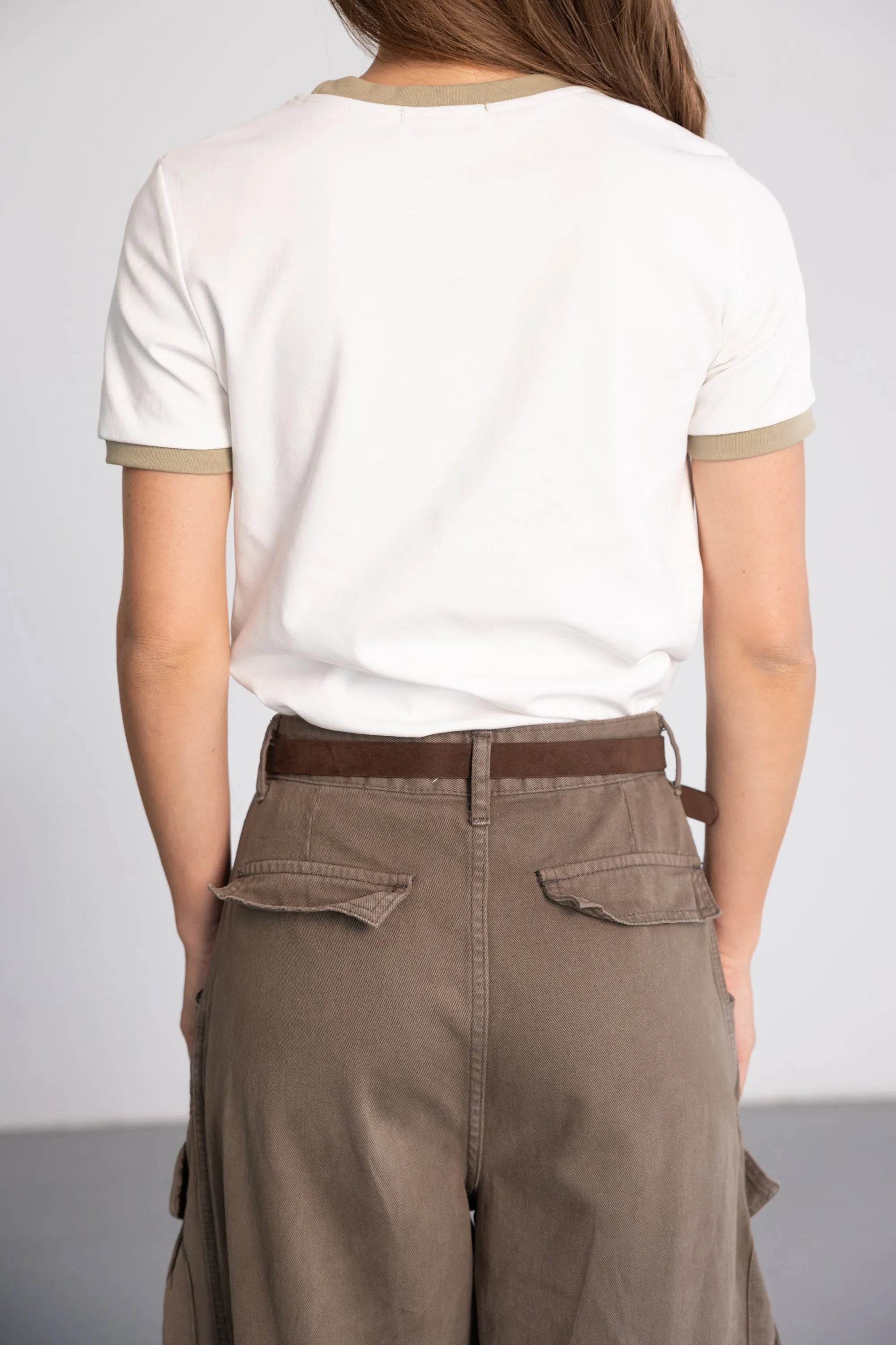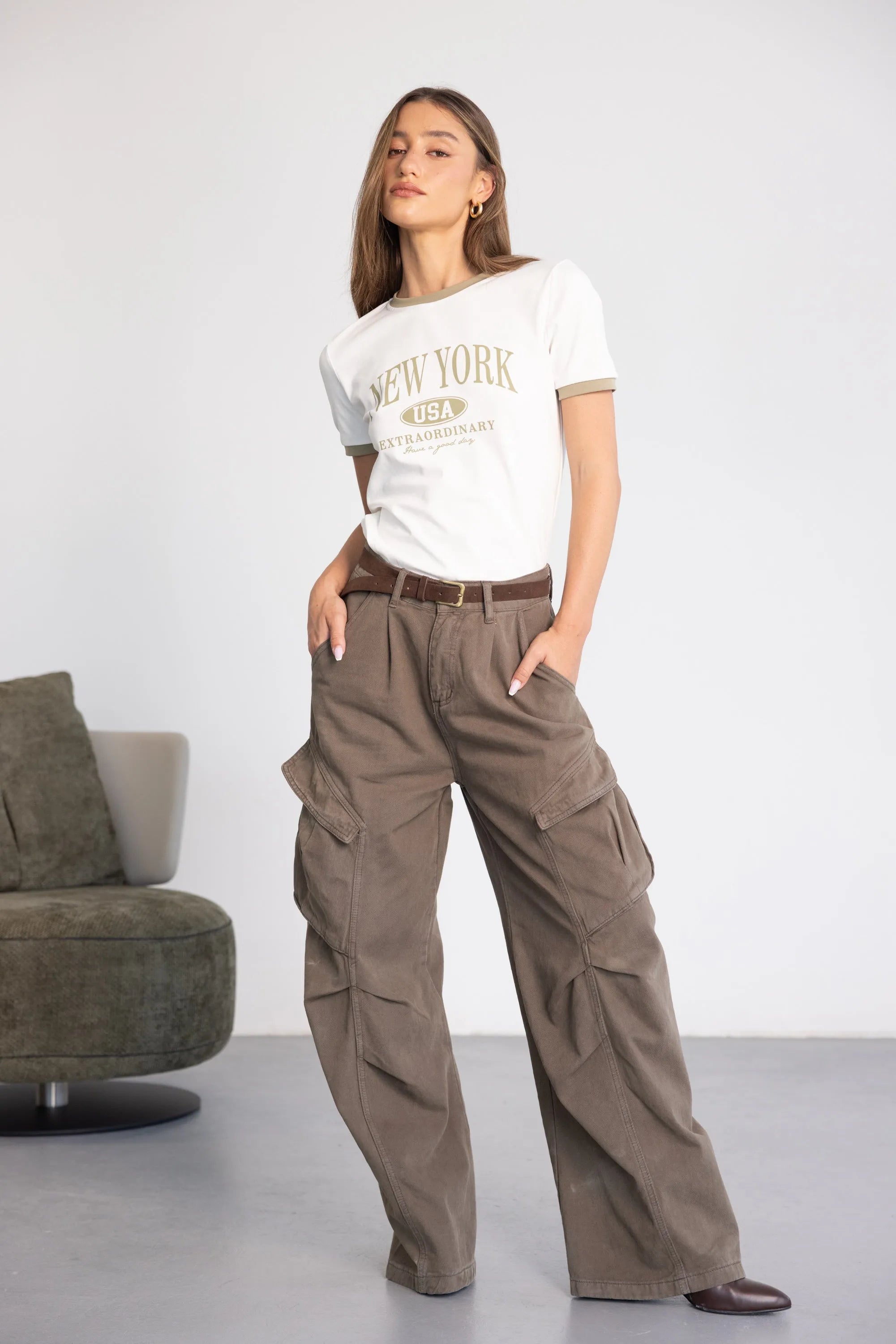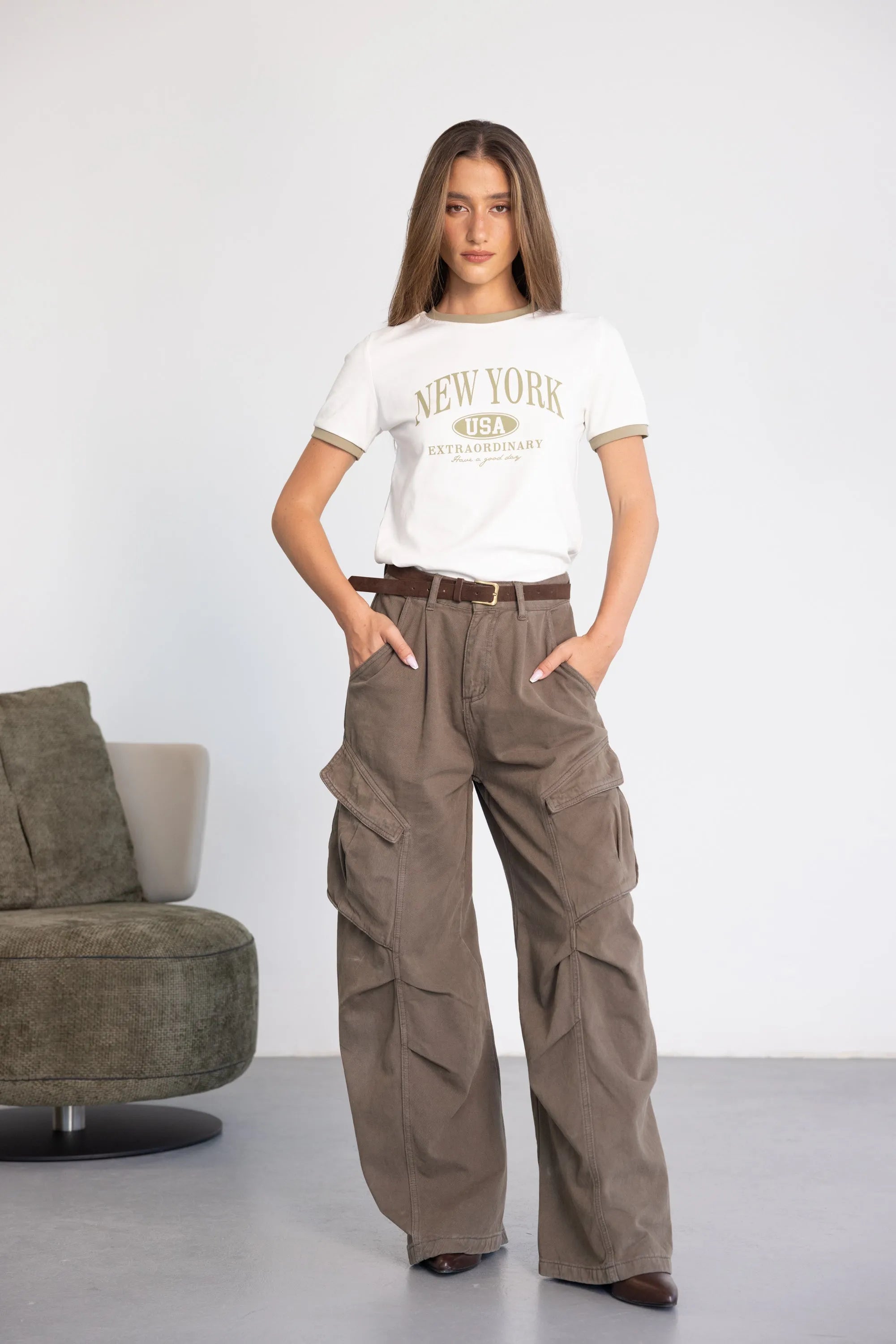 חולצת בייסיק בגזרה מחמיאה, בשילוב צווארון ניקי עגול קלאסי בצבע ירוק זית והדפס טרנדי.