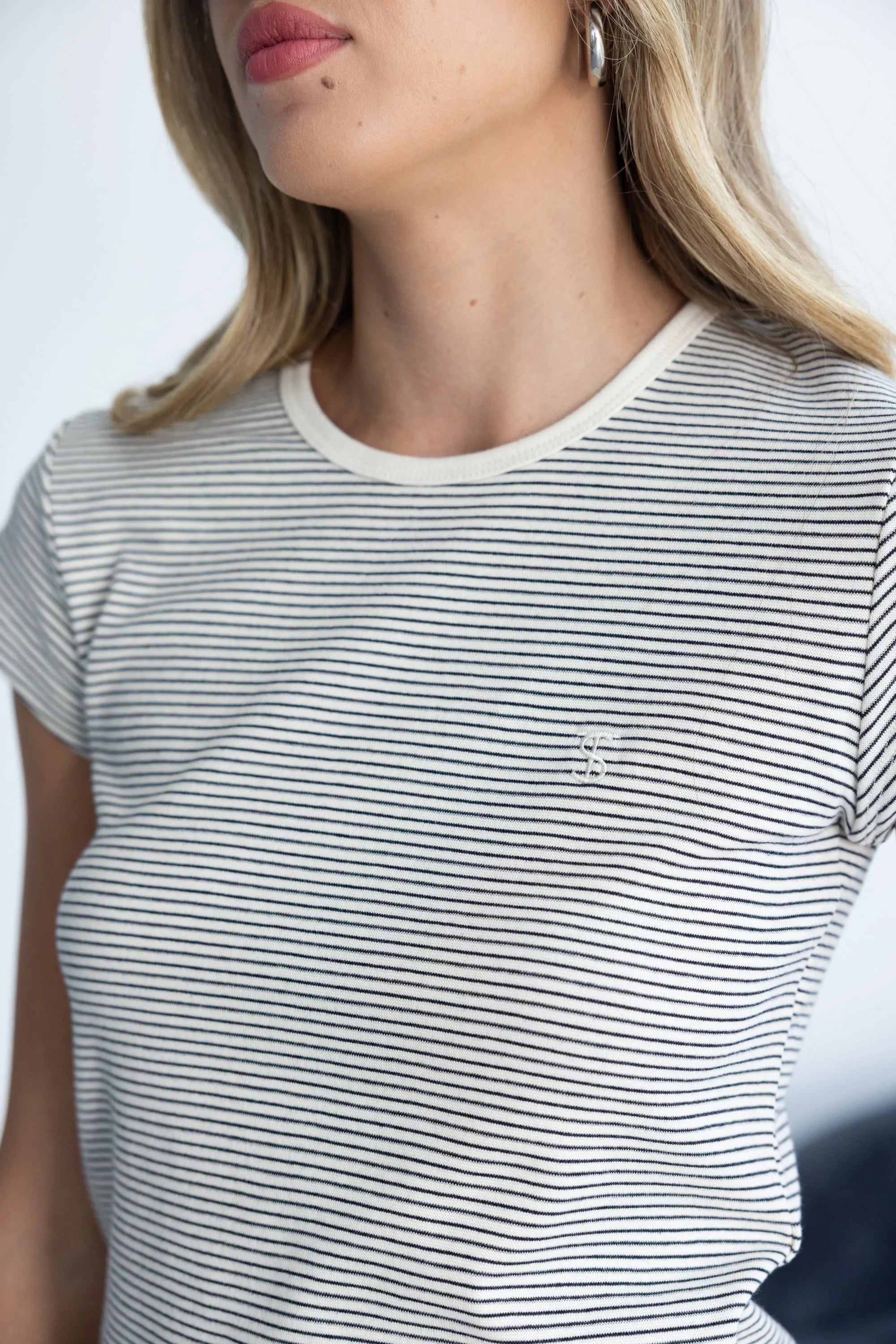 חולצת בייסיק בגזרה מחמיאה ביותר, בשילוב צווארון ניקי עגול קלאסי, דוגמת פסים לרוחב החולצה והלוגו שלנו רקום בקטן בצד החולצה.