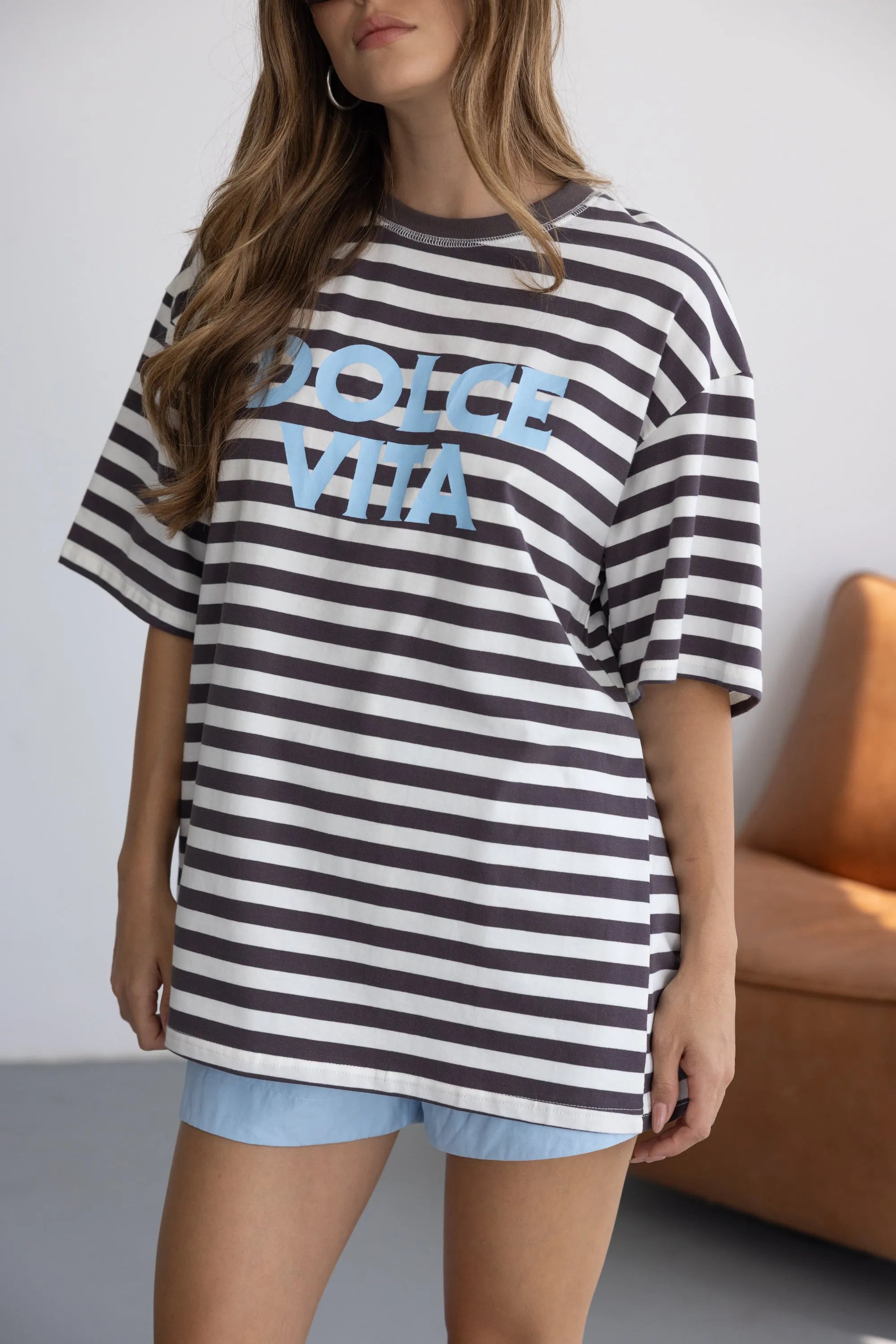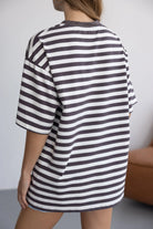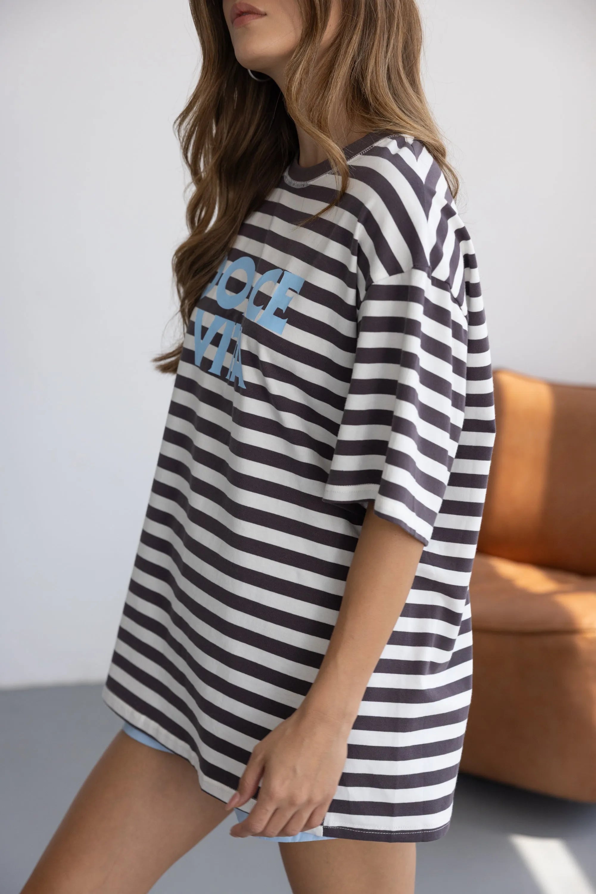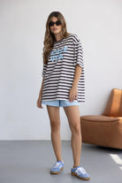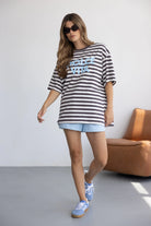 חולצת טי שירט מבד נעים, איכותי ובגזרה משוחררת ומחמיאה. בשילוב צווארון עגול קלאסי, דוגמת פסים לרוחב החולצה והדפס טרנדי.