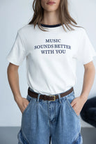 חולצת בייסיק בגזרה נוחה, מבד נעים ביותר ובשילוב צווארון ניקי עגול קלאסי וכיתוב טרנדי בצבע כחול כהה.