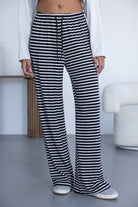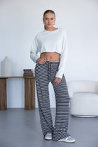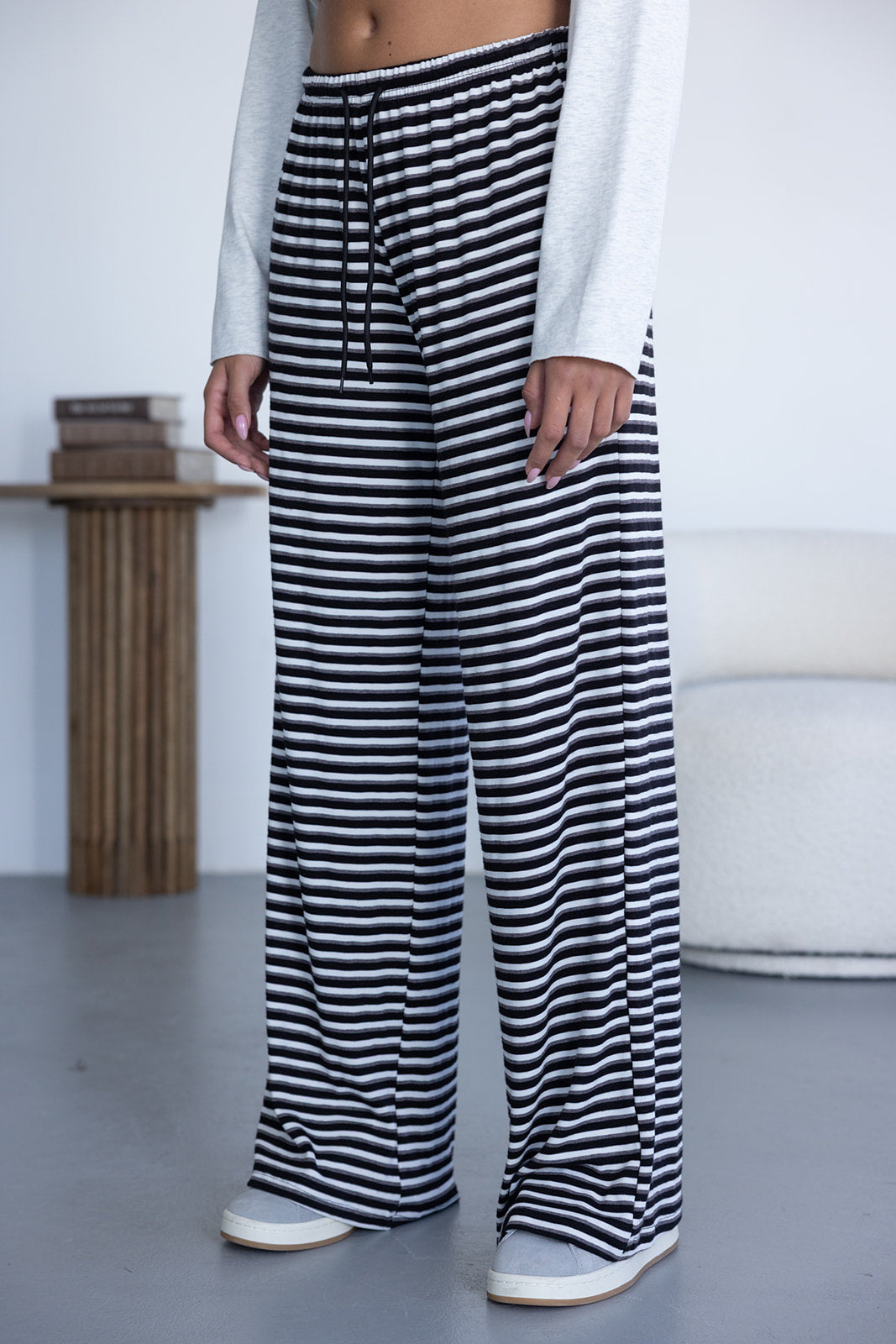 מכנס ארוך בגזרה ישרה, נוח ונעים ביותר לעונה. בשילוב הדפס פסים טרנדי, גומי במותן וקשירה לנוחות מקסימאלית.