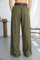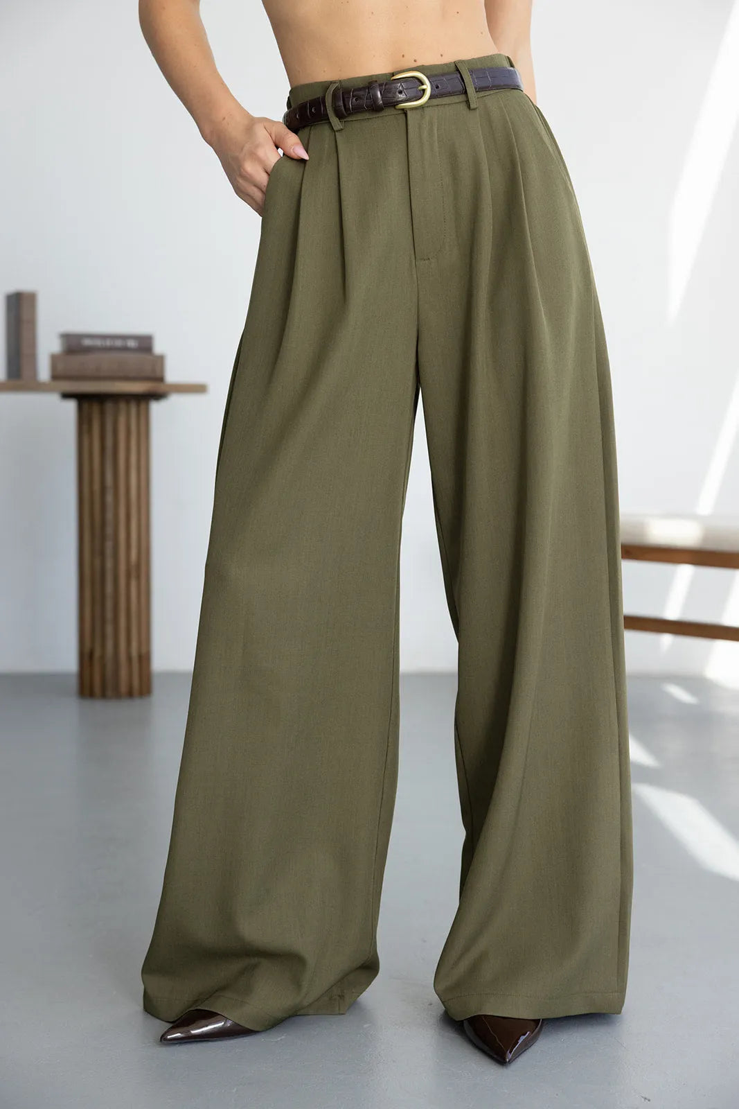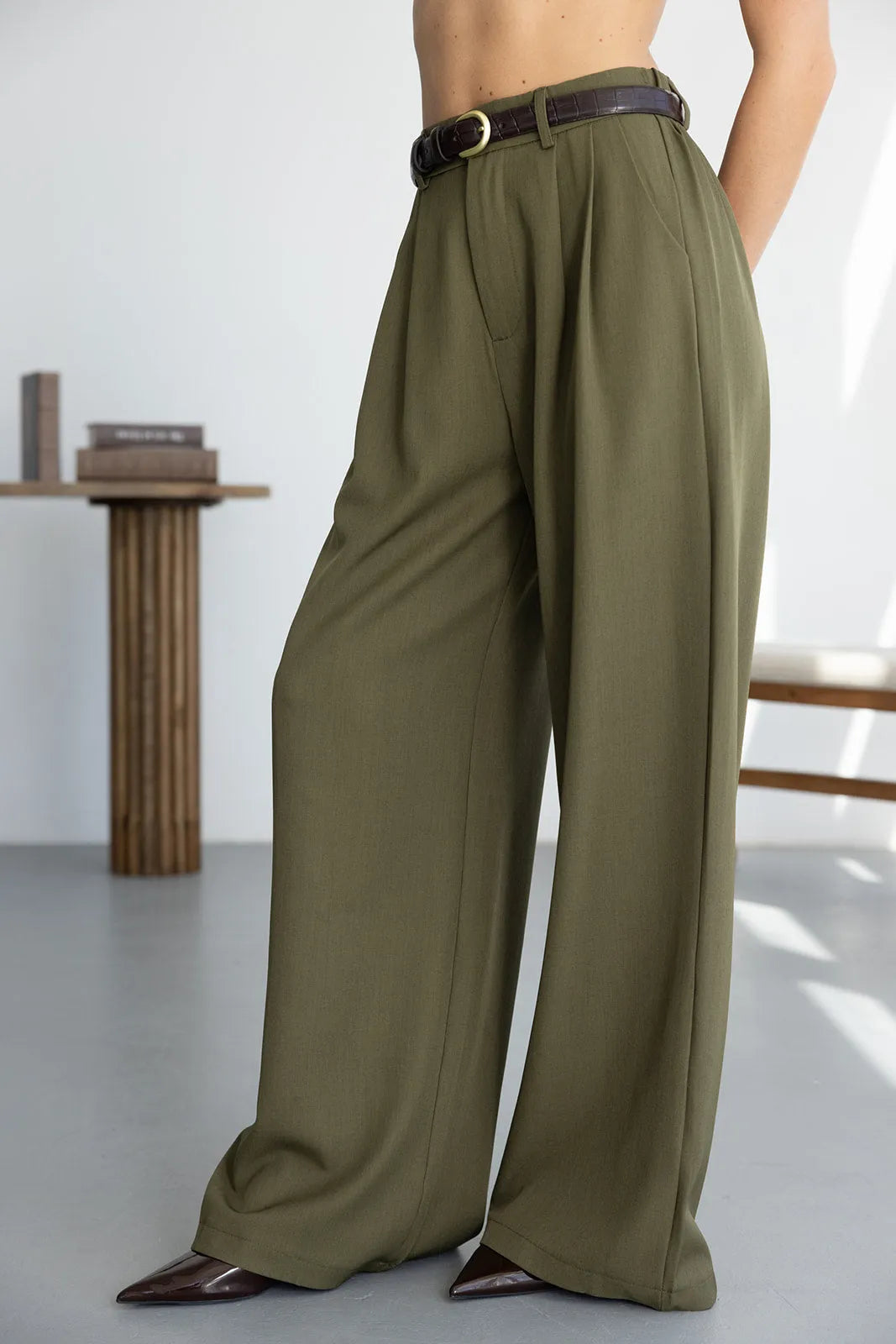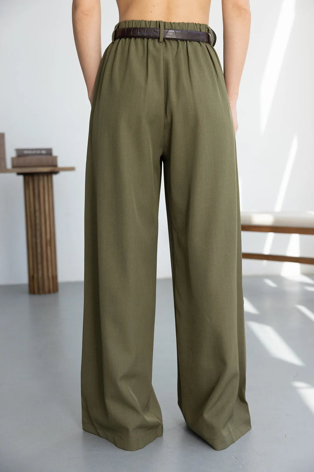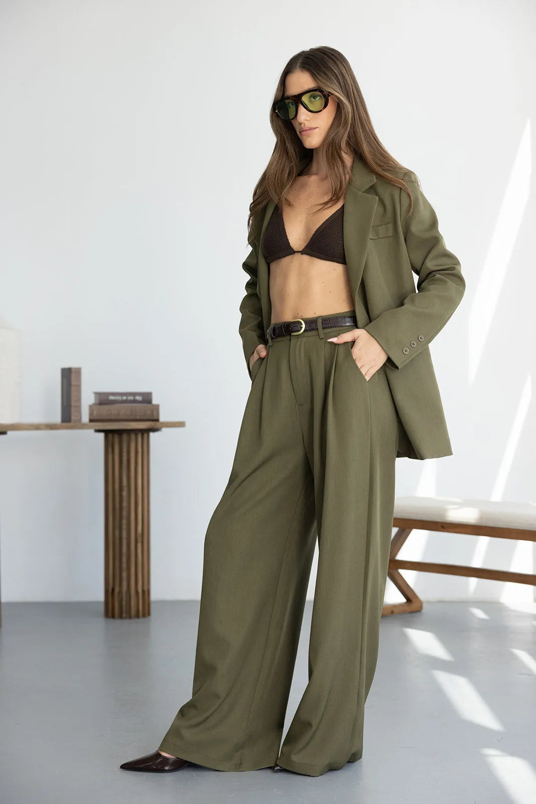 מכנס רחב בגזרת מותן גבוהה, עשוי בד קליל ונופל. מגיע בצבע ירוק זית עם קו ישר ורגל רחבה.