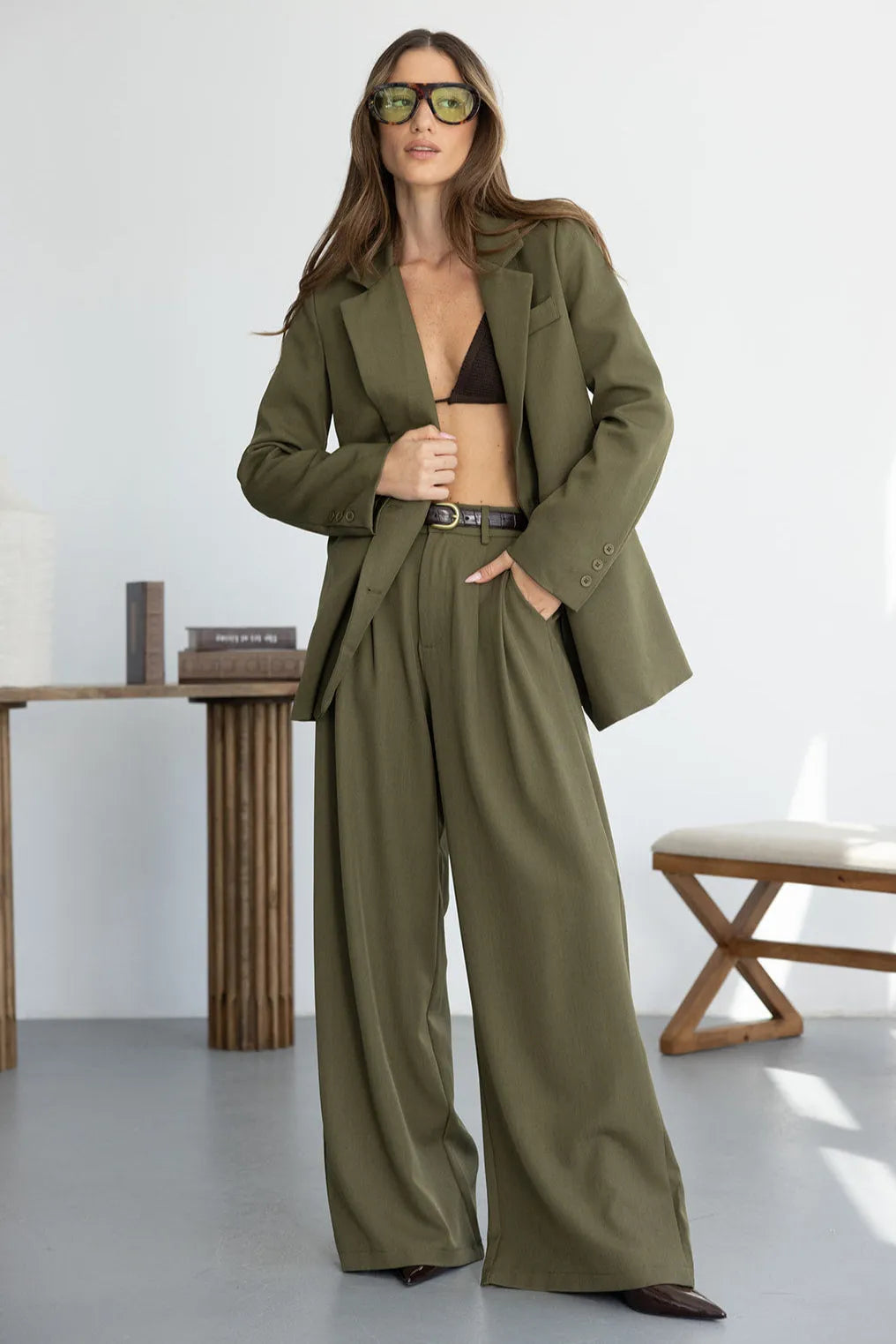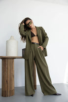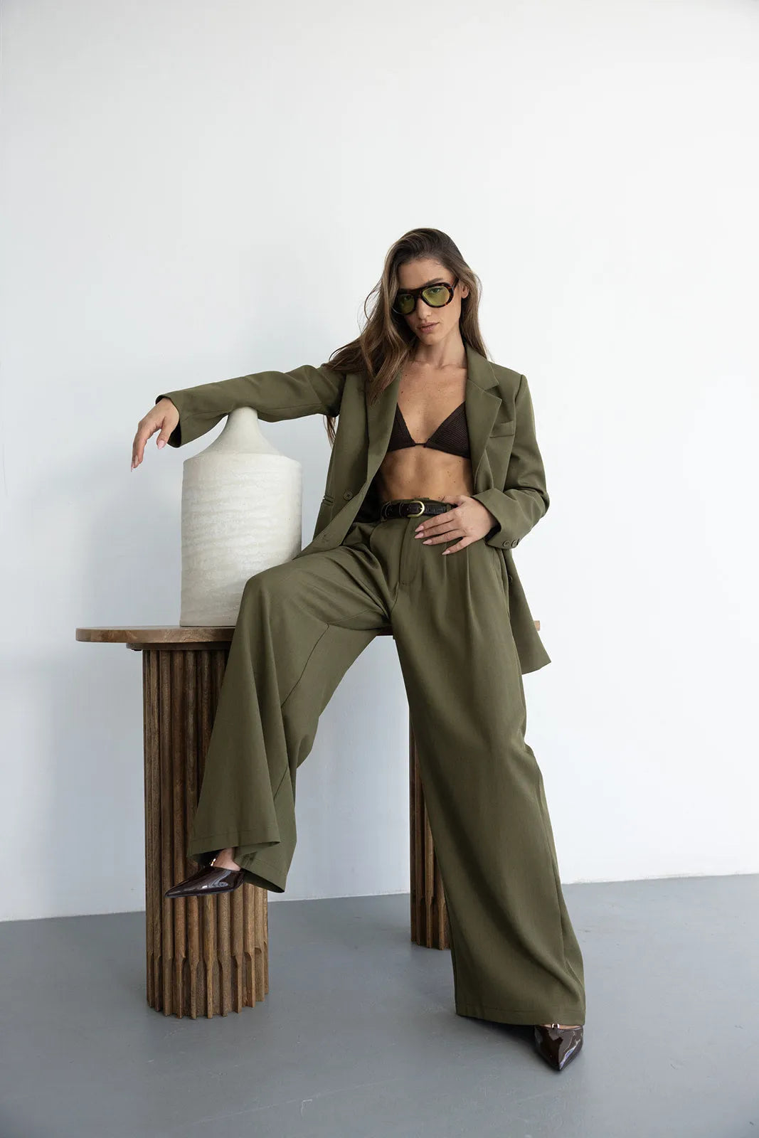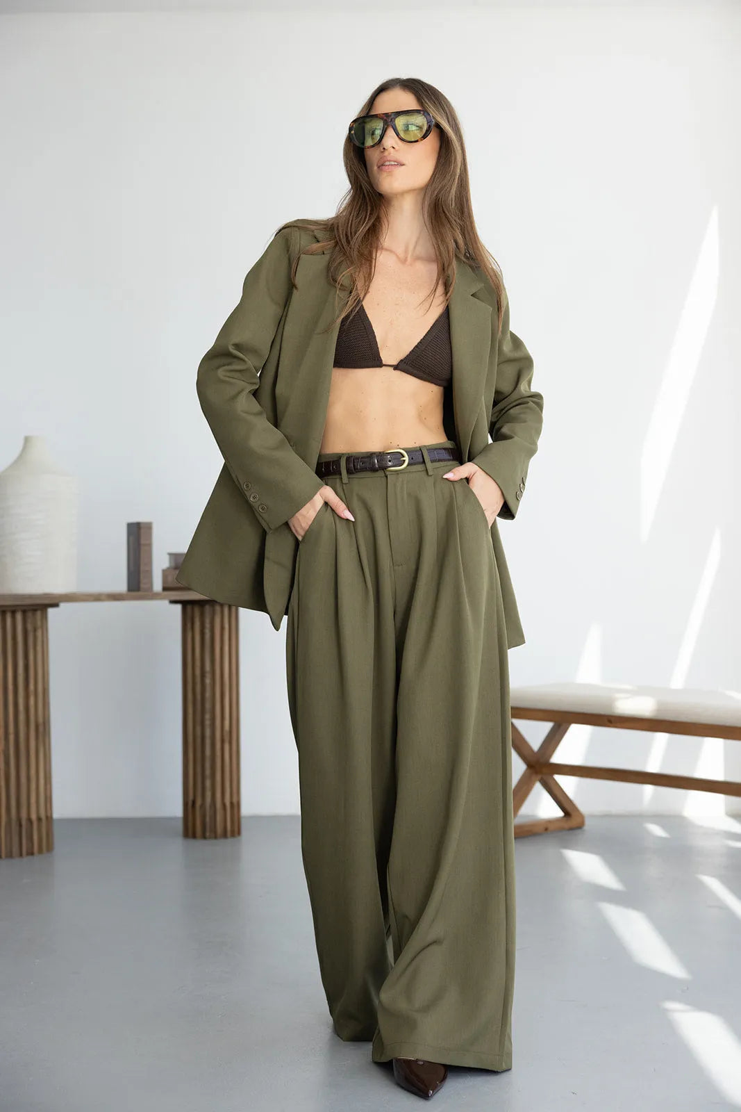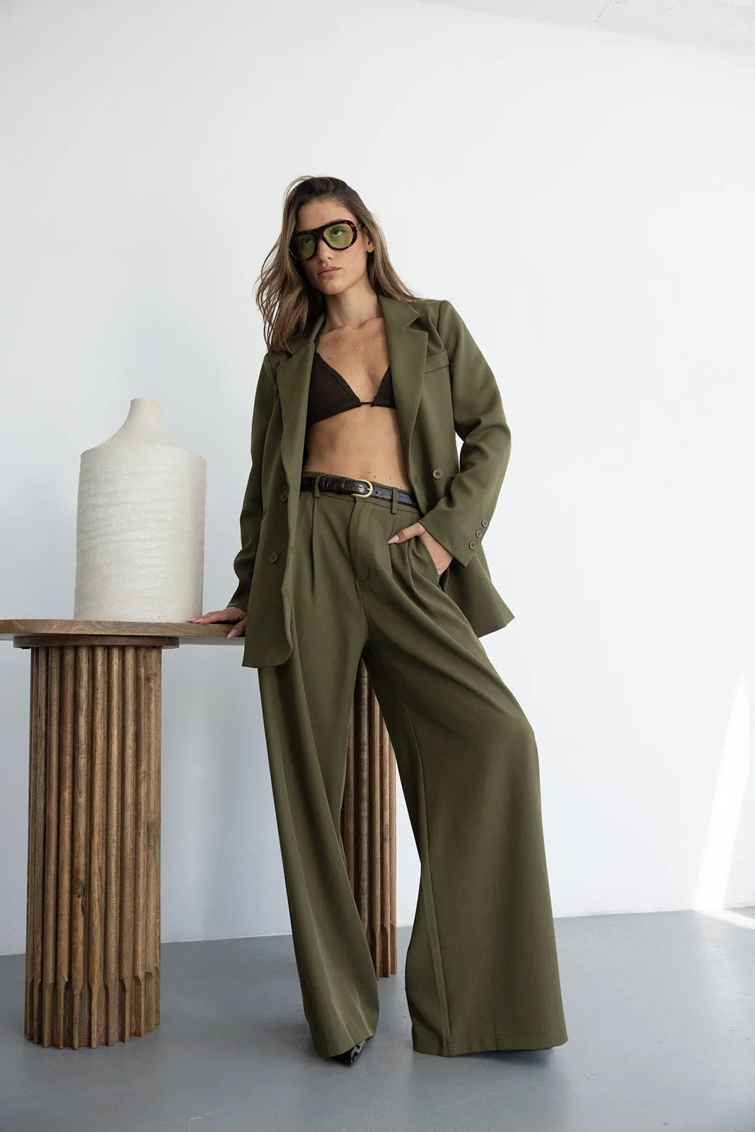 מכנס רחב בגזרת מותן גבוהה, עשוי בד קליל ונופל. מגיע בצבע ירוק זית עם קו ישר ורגל רחבה.
