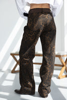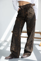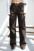 מכנסיים ארוכים בהדפס מנומר כהה, עם גזרה רחבה ומשוחררת. מגיעים עם כיסים קדמיים, סגירת רוכסן וכפתור, ותוספת חגורה תואמת למראה מודגש