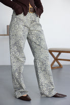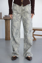 מכנסיים ארוכים בהדפס מנומר בהיר, עם גזרה רחבה ומשוחררת. מגיעים עם כיסים קדמיים, סגירת רוכסן וכפתור, ותוספת חגורה תואמת למראה מודגש