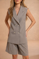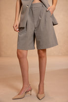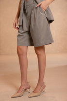 מכנסיים קצרים מבד איכותי בגזרת ברמודה ישרה. בשילוב זוג כיסים קדמיים, דוגמת פסים לאורך המכנס וסגירת רוכסן עם כפתור.