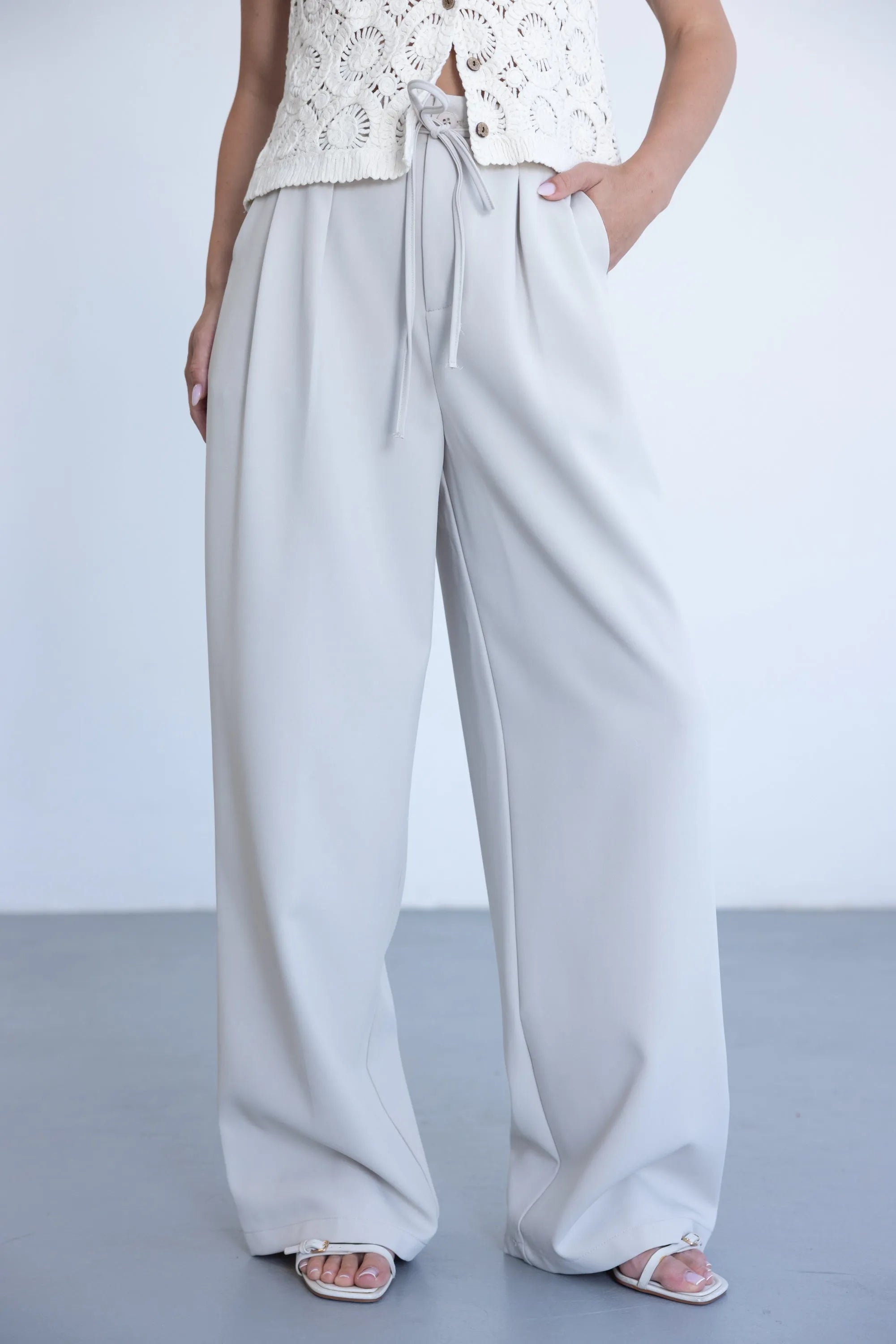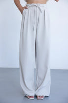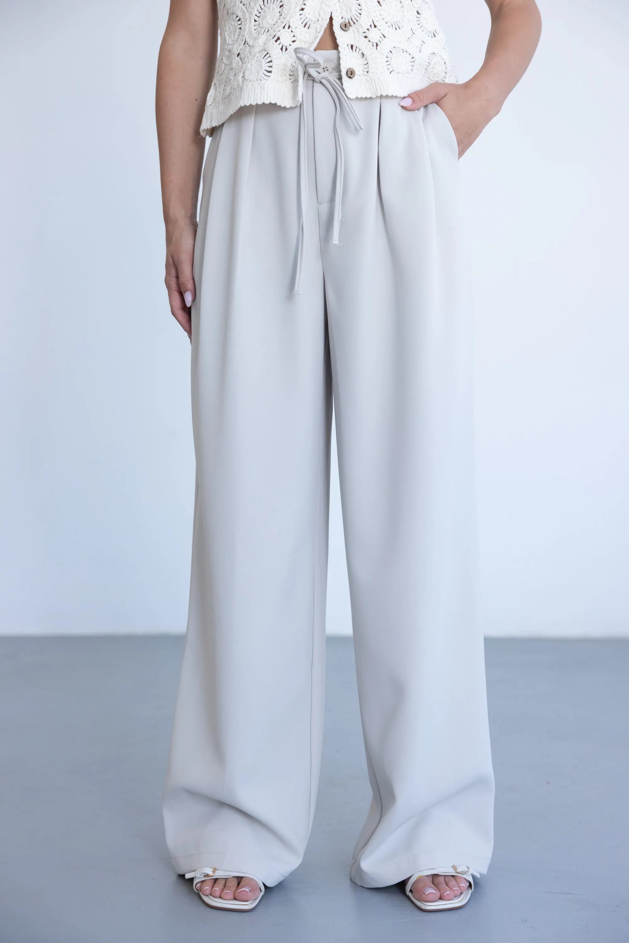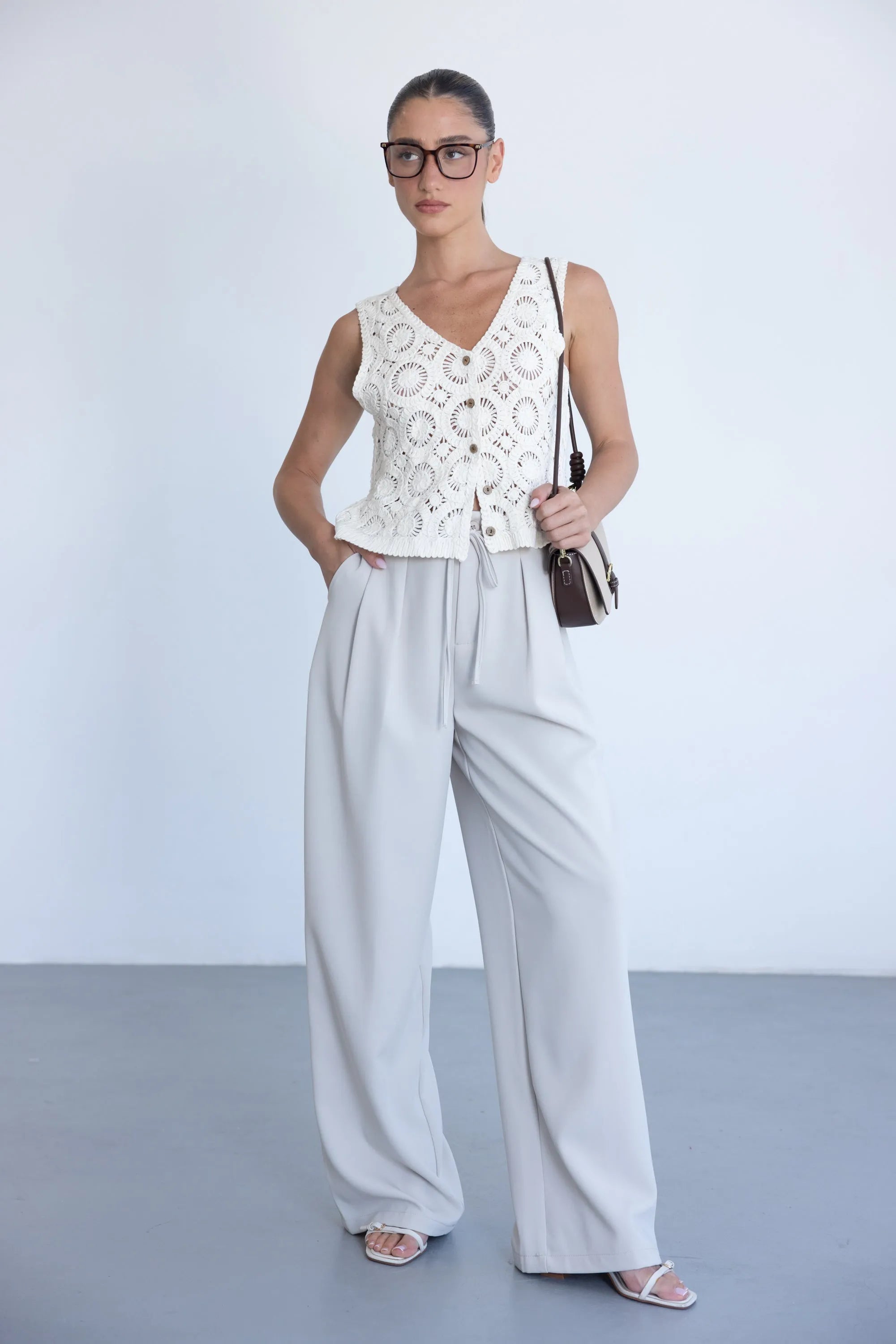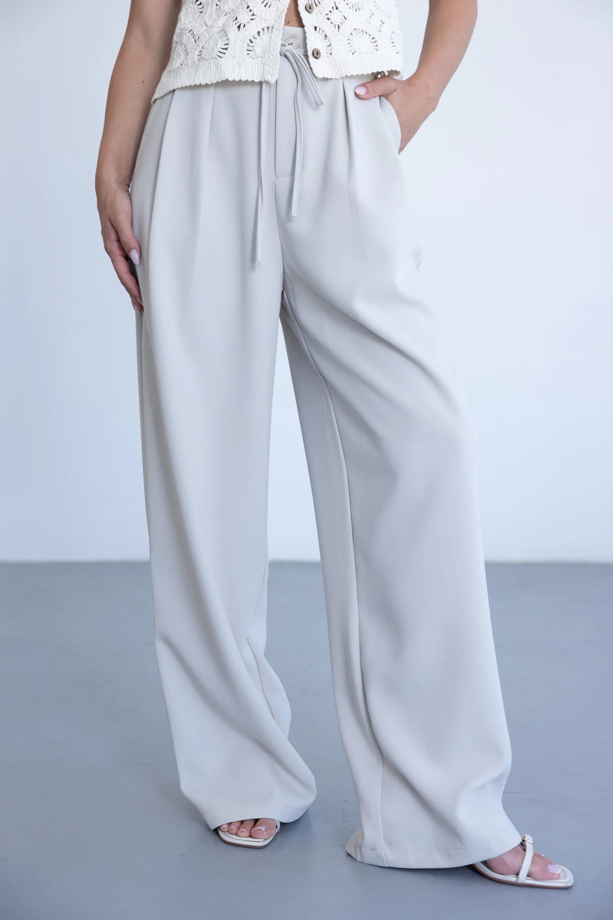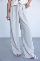 מכנס אלגנטי קליל לעונה, בגזרה ישרה ומשוחררת ובשילוב קשירה. למכנס שני כיסים קדמיים, כפתור ורוכסן.