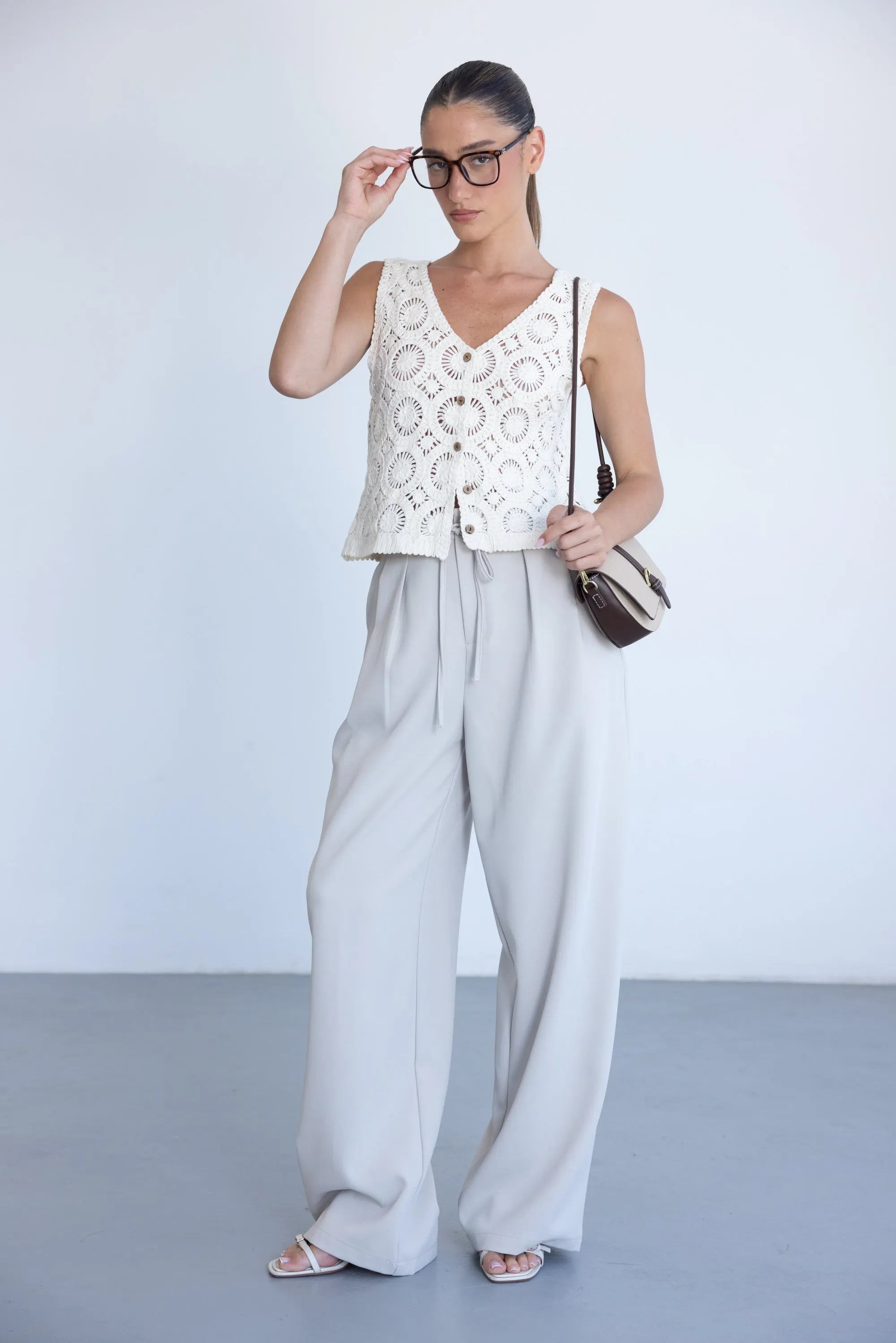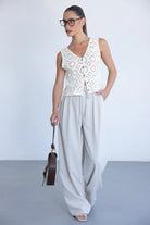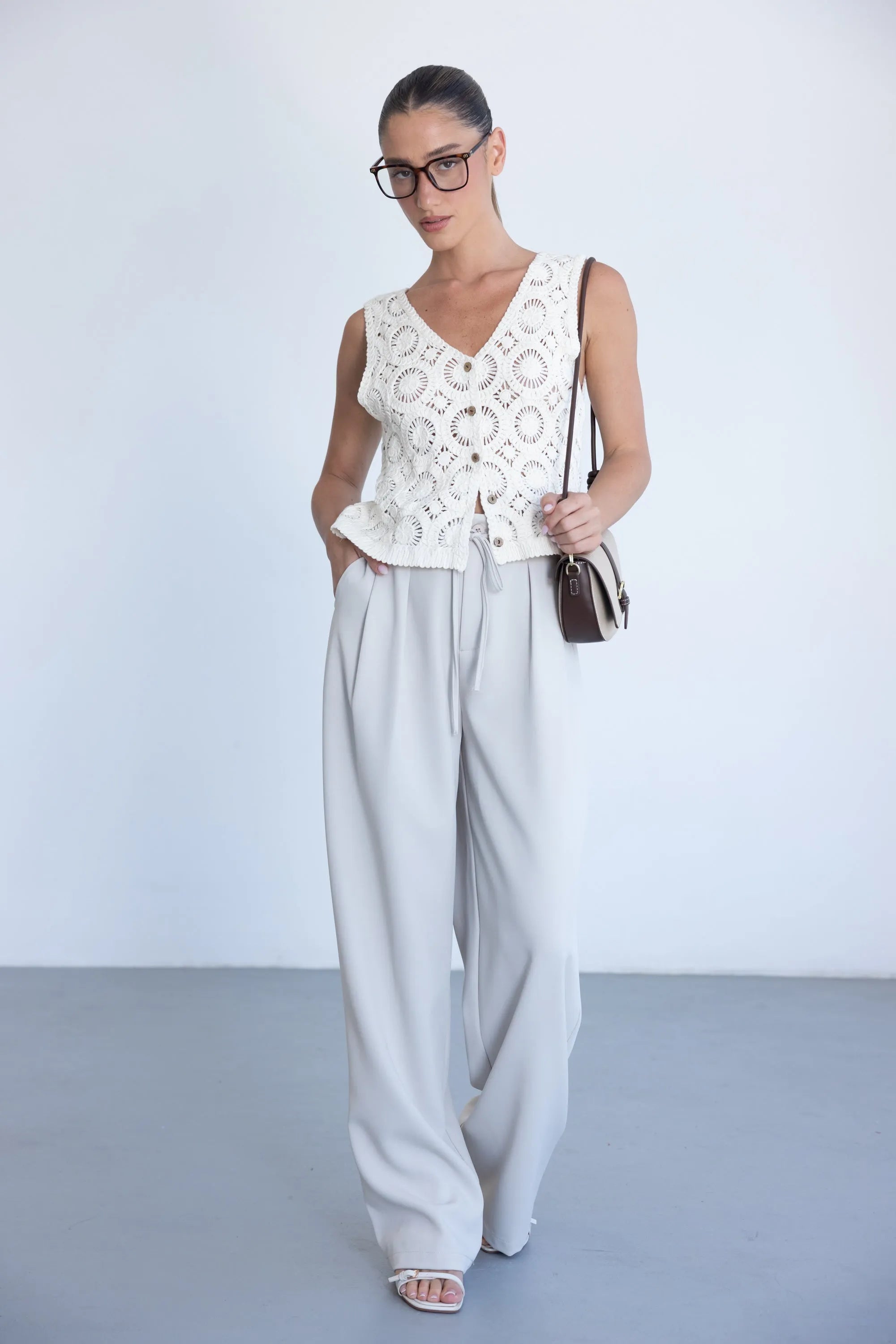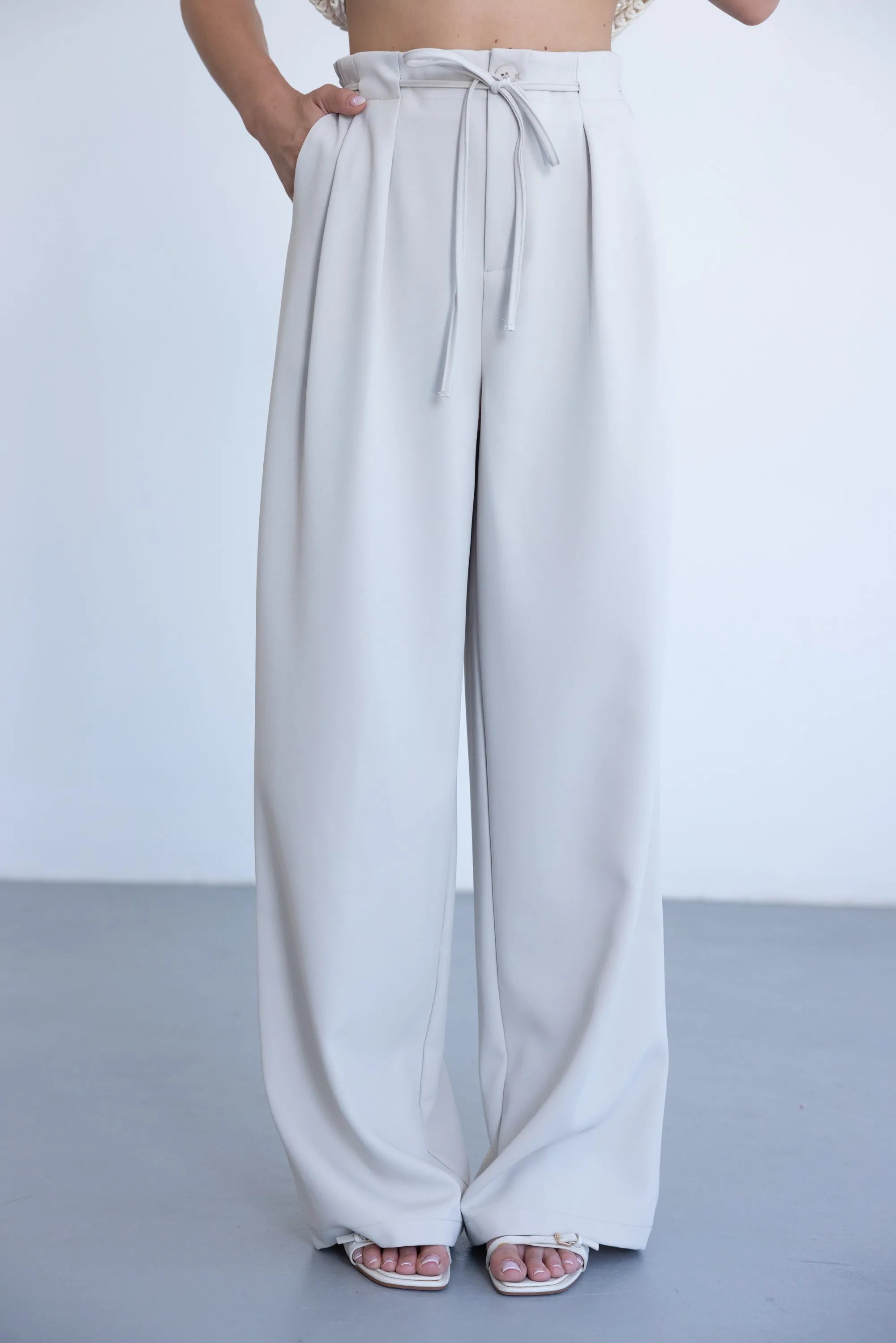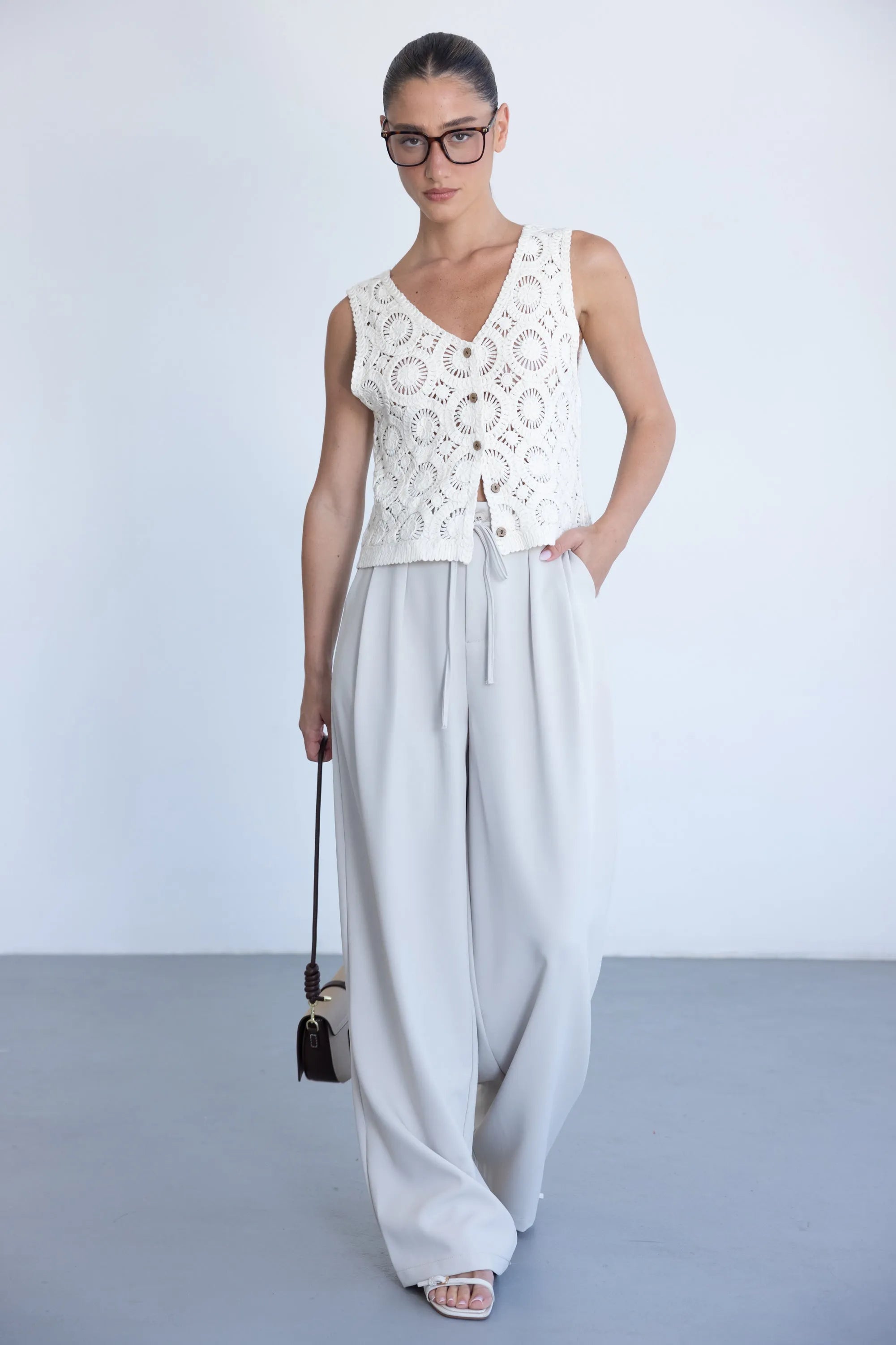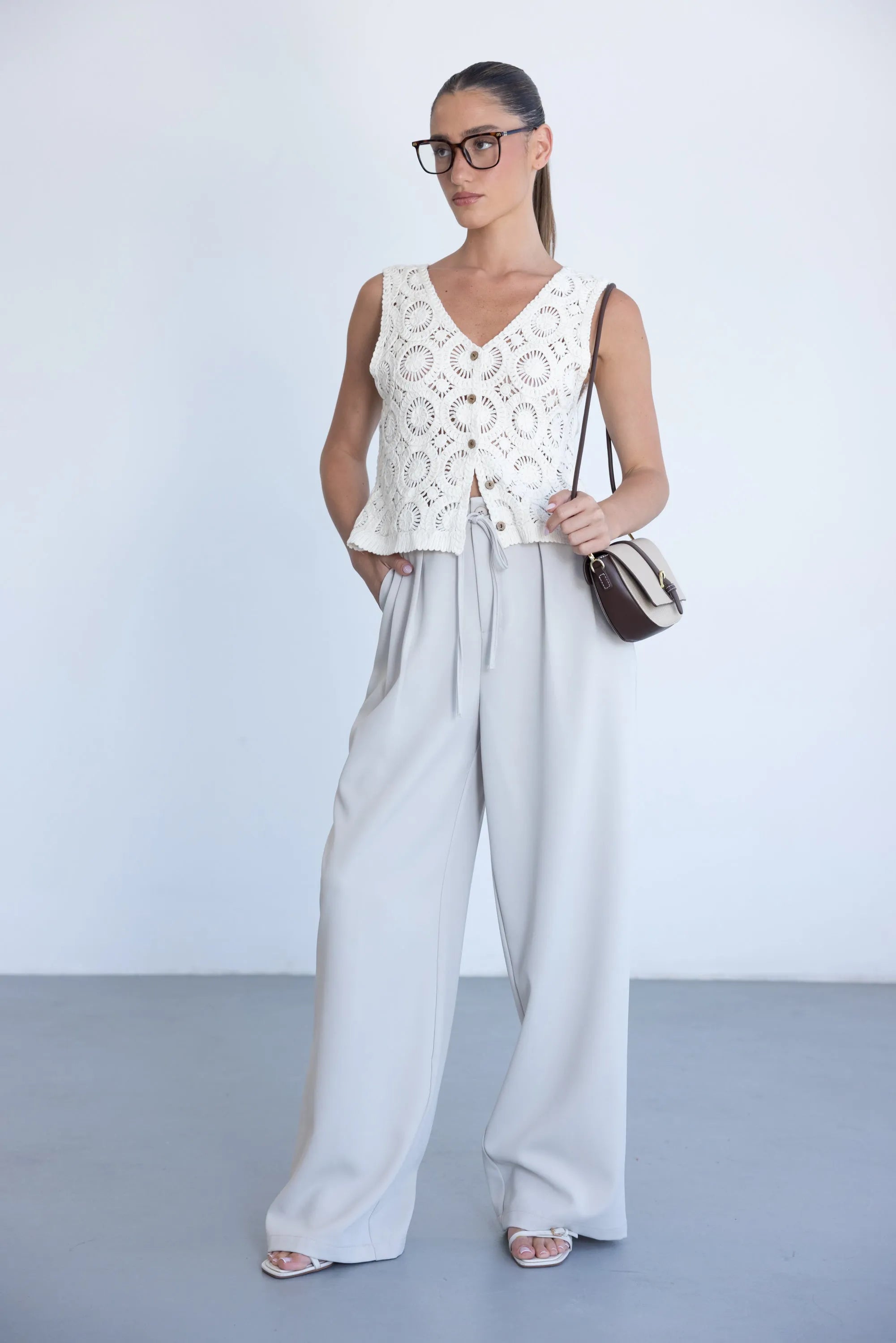 מכנס אלגנטי קליל לעונה, בגזרה ישרה ומשוחררת ובשילוב קשירה. למכנס שני כיסים קדמיים, כפתור ורוכסן.