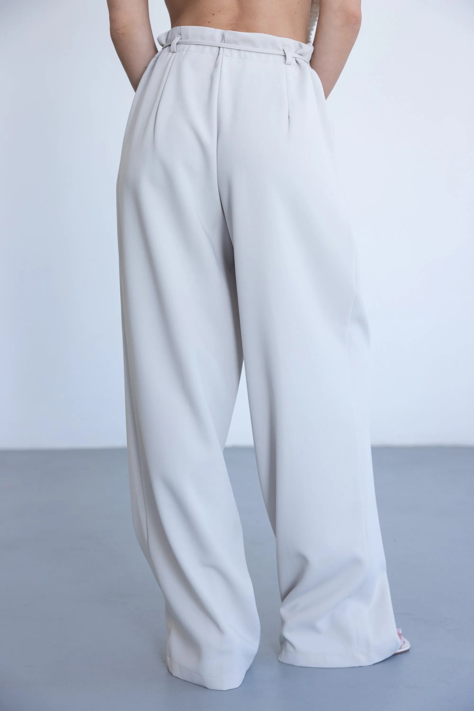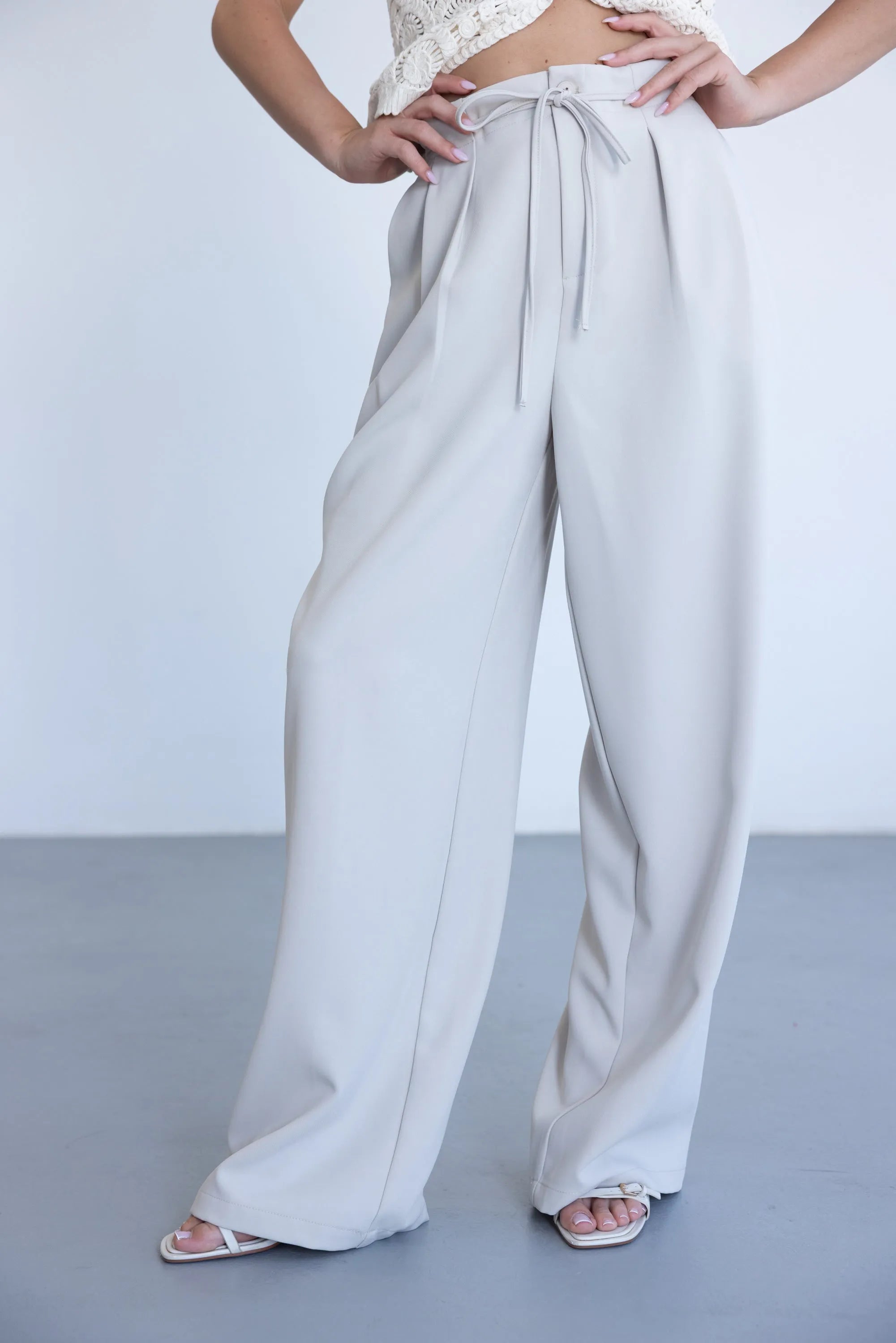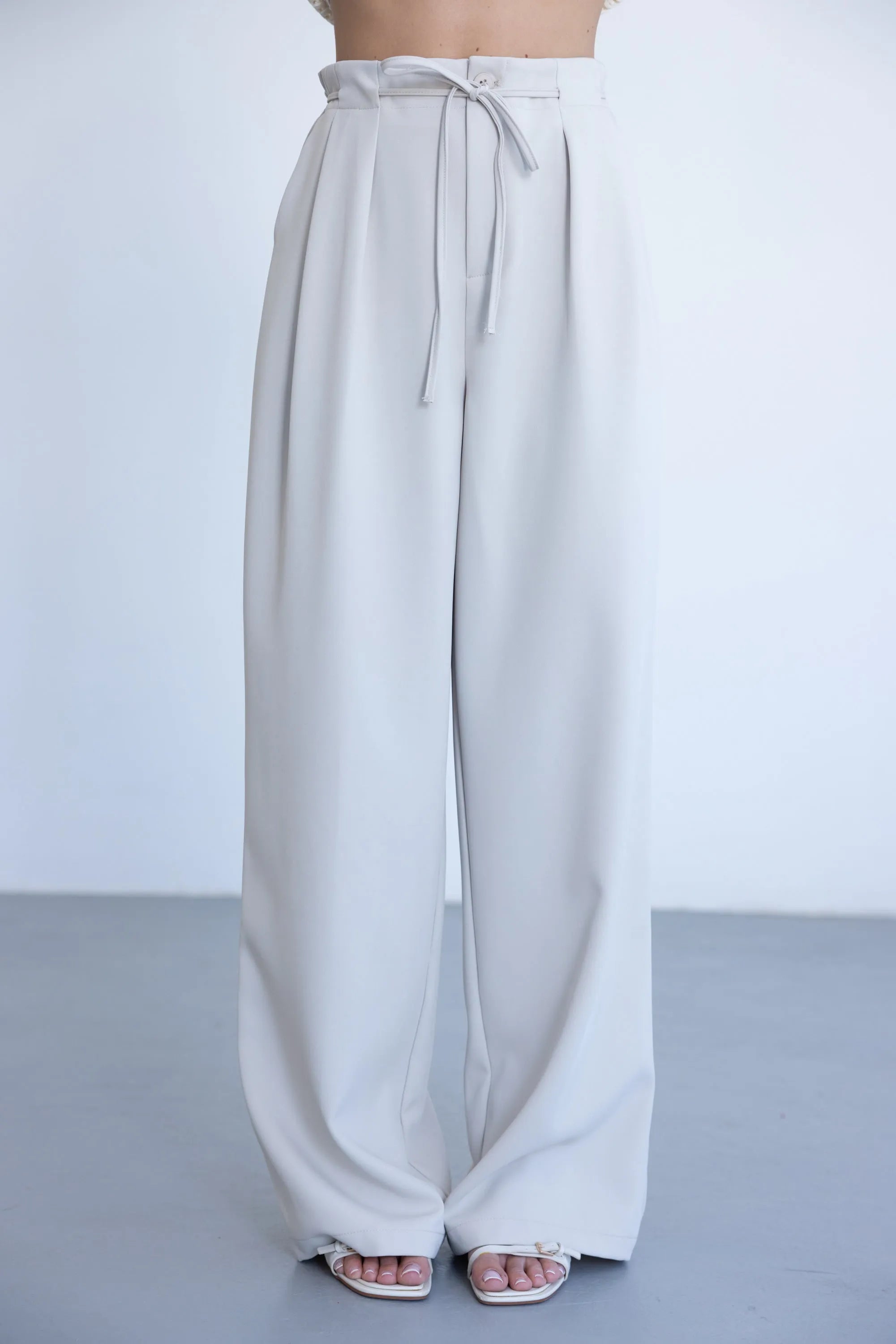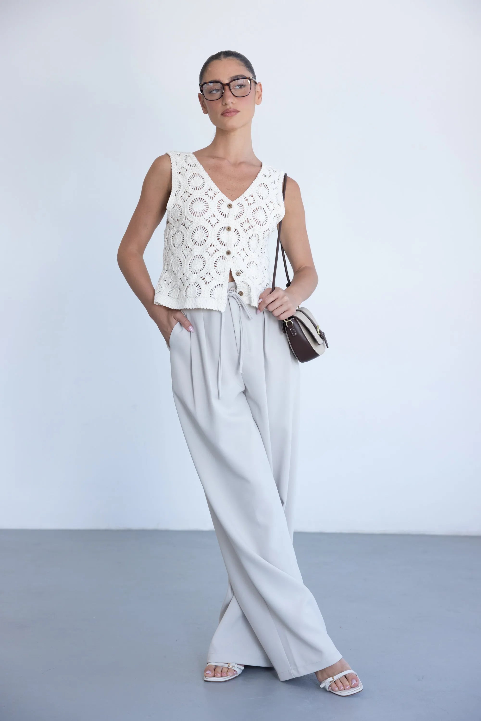 מכנס אלגנטי קליל לעונה, בגזרה ישרה ומשוחררת ובשילוב קשירה. למכנס שני כיסים קדמיים, כפתור ורוכסן.