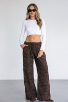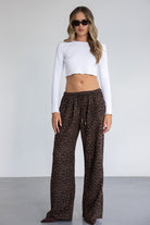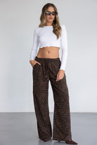 מכנס נוח בגזרה ישרה ומעט רחבה. בשילוב גומי במותן, קשירה ודוגמה מנומרת טרנדית לאורך המכנס. למכנס שני כיסים קדמיים.