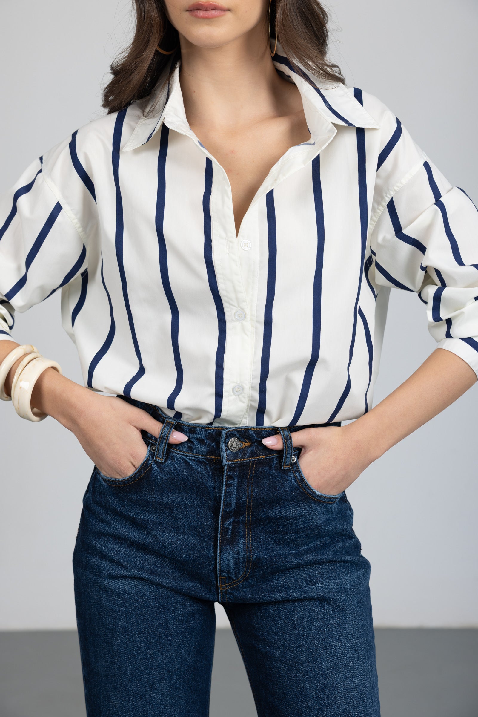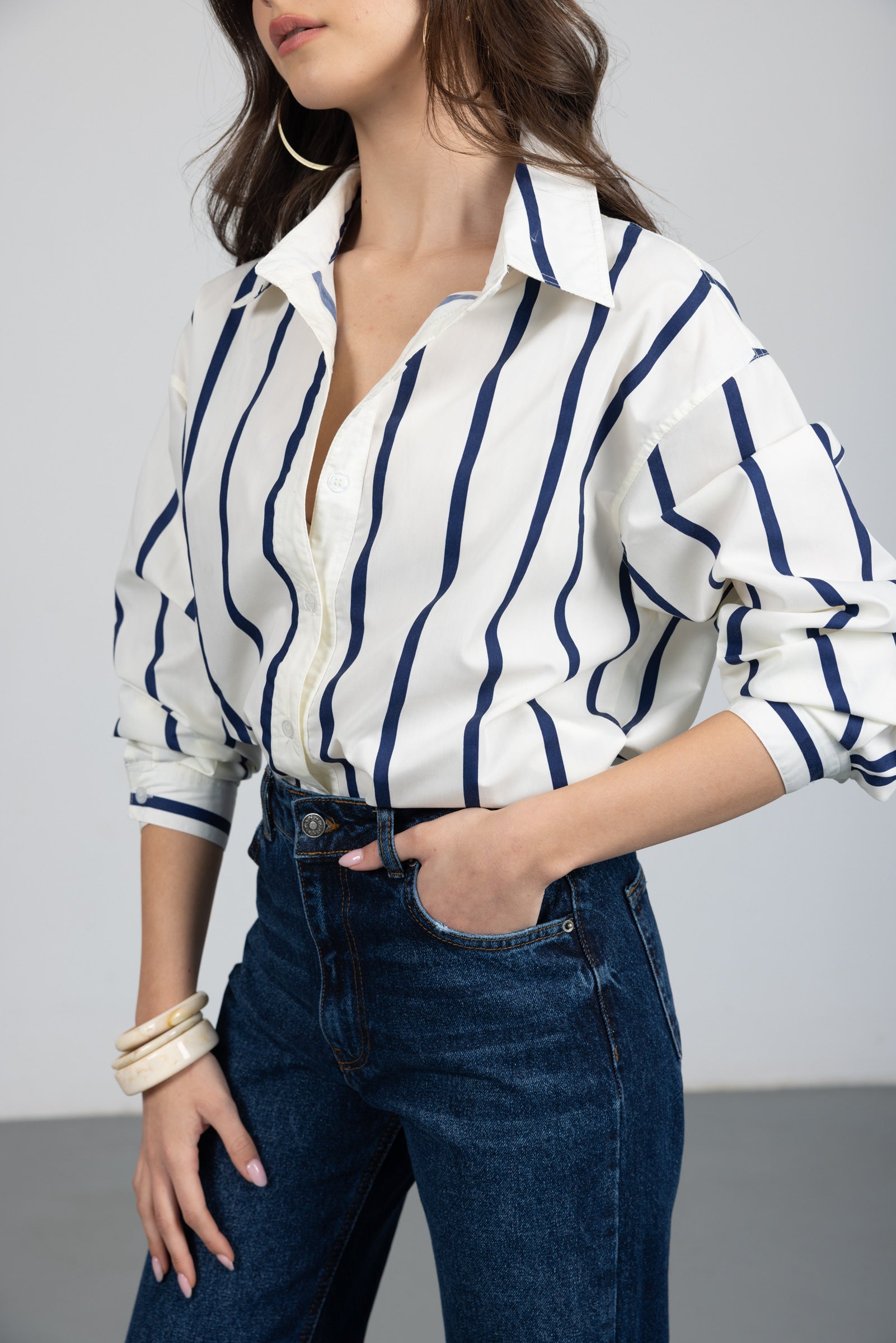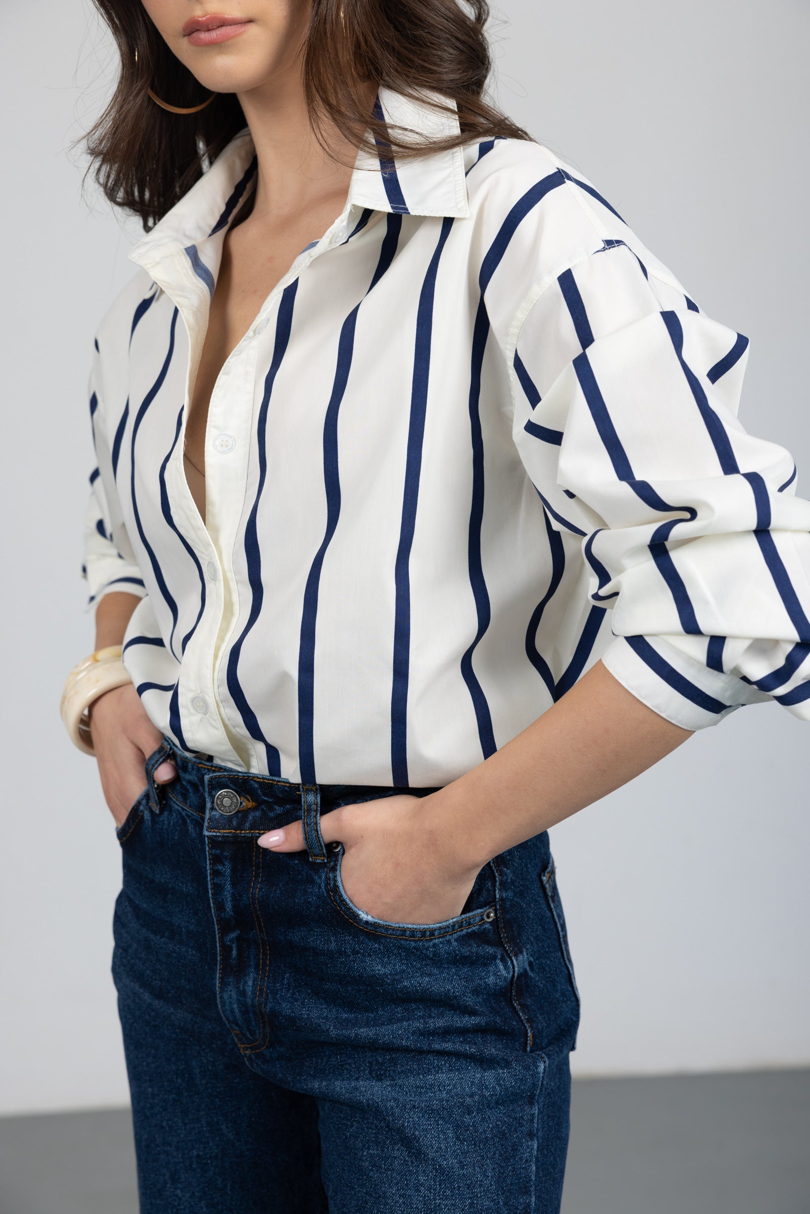 חולצה מכופתרת קלאסית מבד איכותי, בשילוב דוגמת פסים לאורך החולצה. גזרה ישרה ונינוחה עם צווארון מוקפד ושרוולים ארוכים.