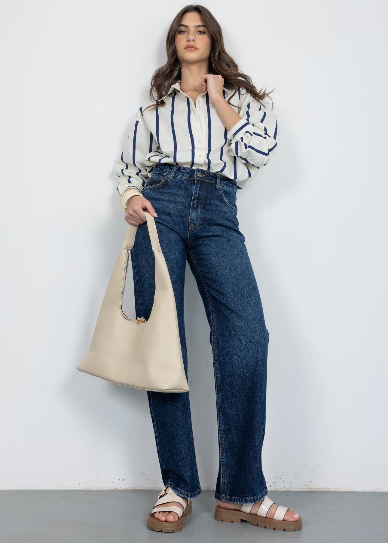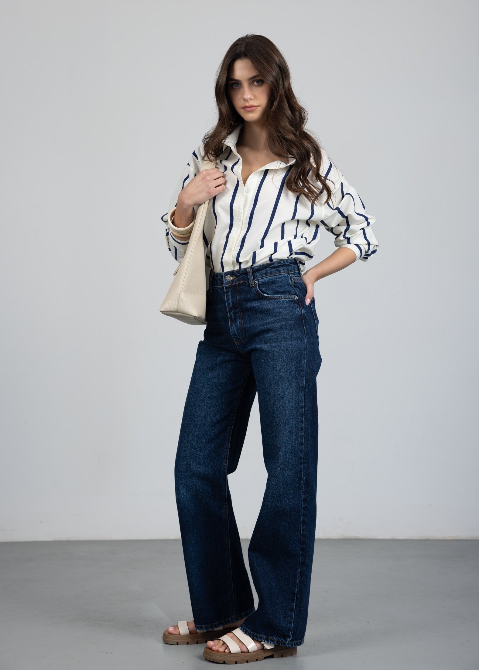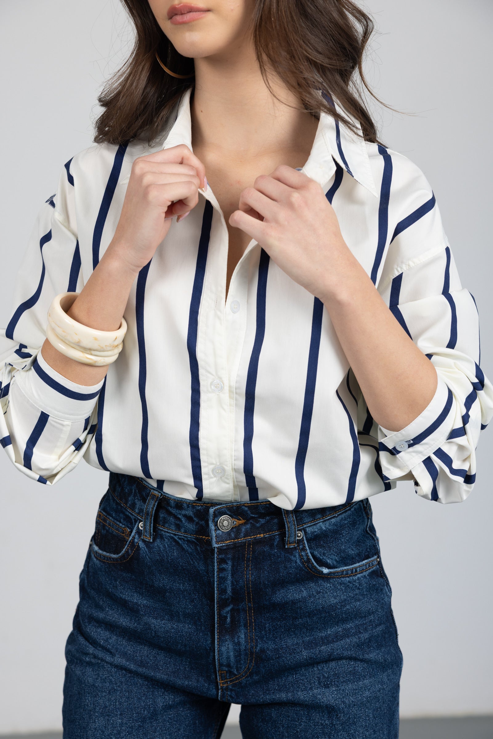 חולצה מכופתרת קלאסית מבד איכותי, בשילוב דוגמת פסים לאורך החולצה. גזרה ישרה ונינוחה עם צווארון מוקפד ושרוולים ארוכים.