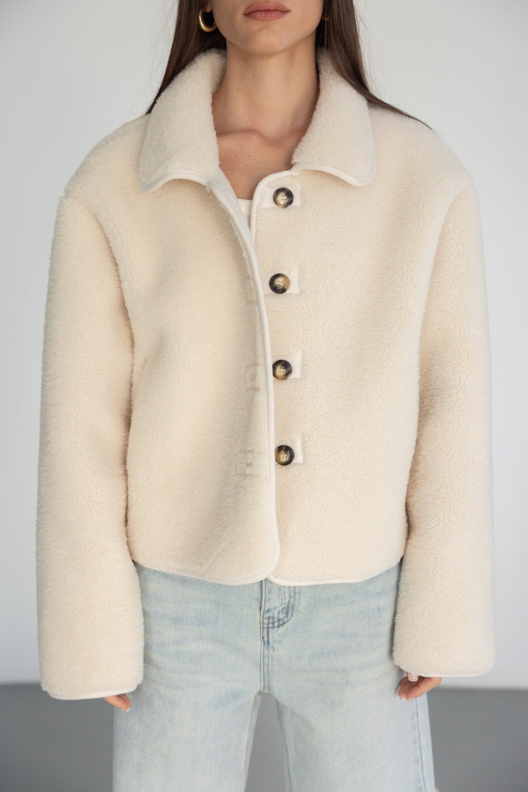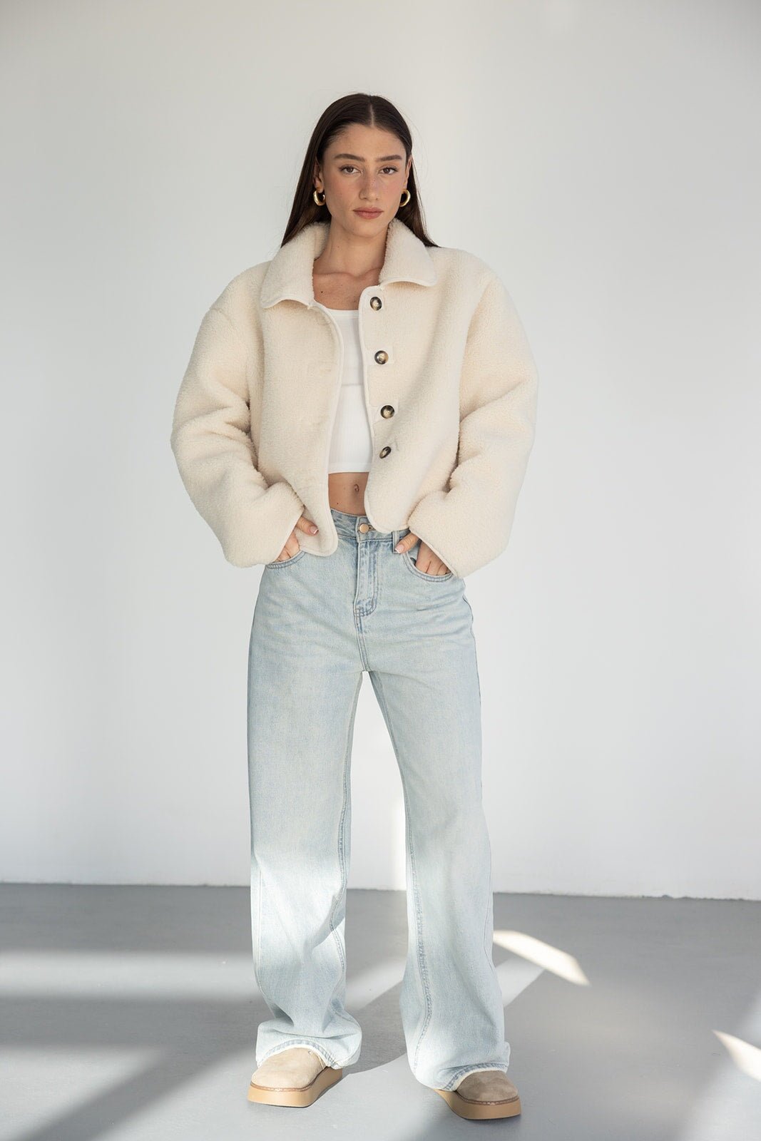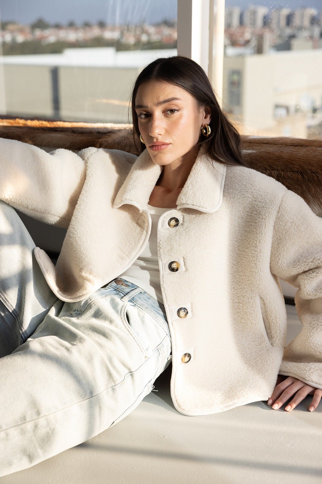 ג'קט דמוי צמר מבד נעים ומחמם ביותר לעונה ובגזרה מעט משוחררת ומחמיאה ביותר. בשילוב צווארון קלאסי, כפתורים לאורך הג'קט וזוג כיסים.