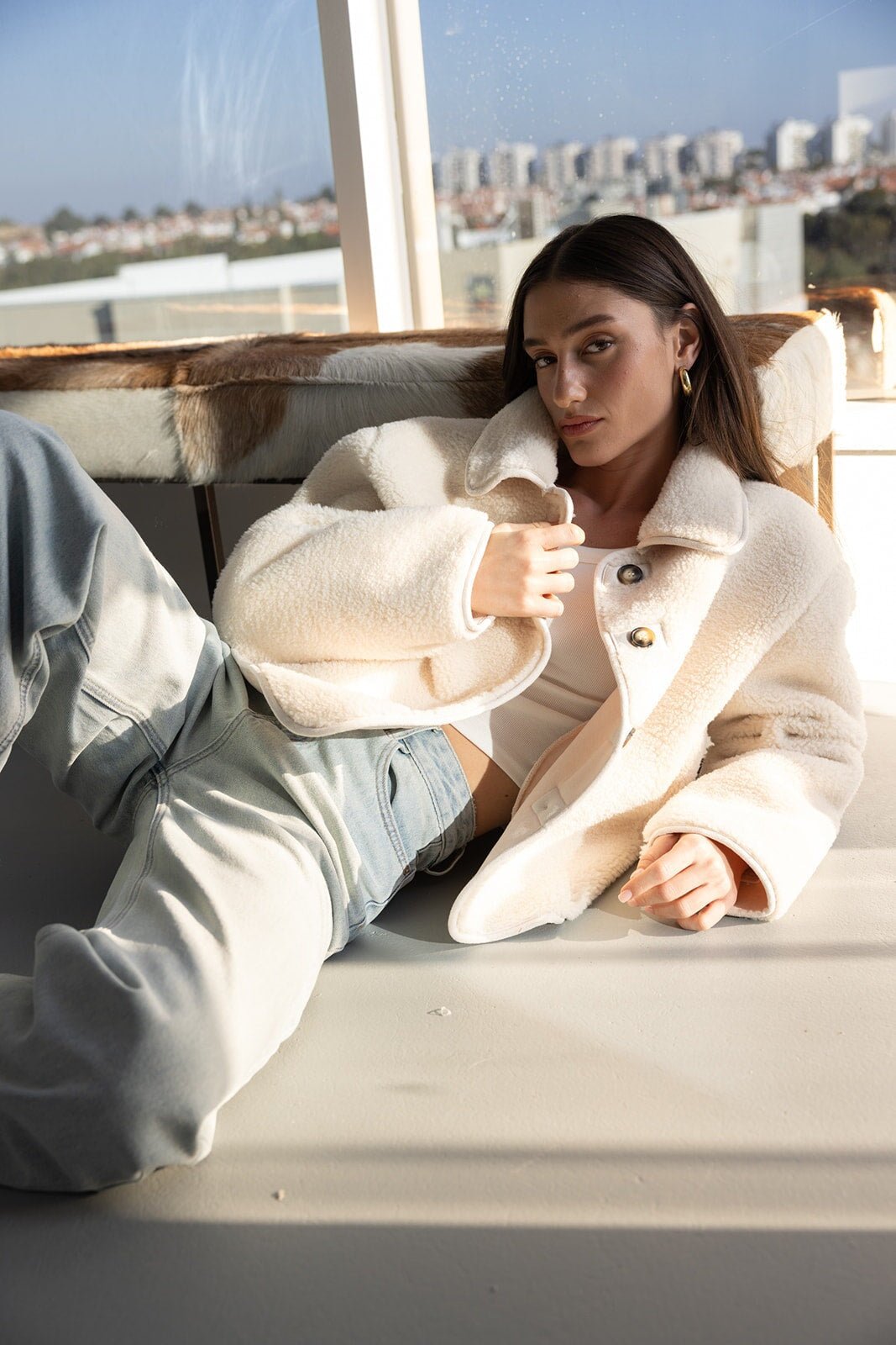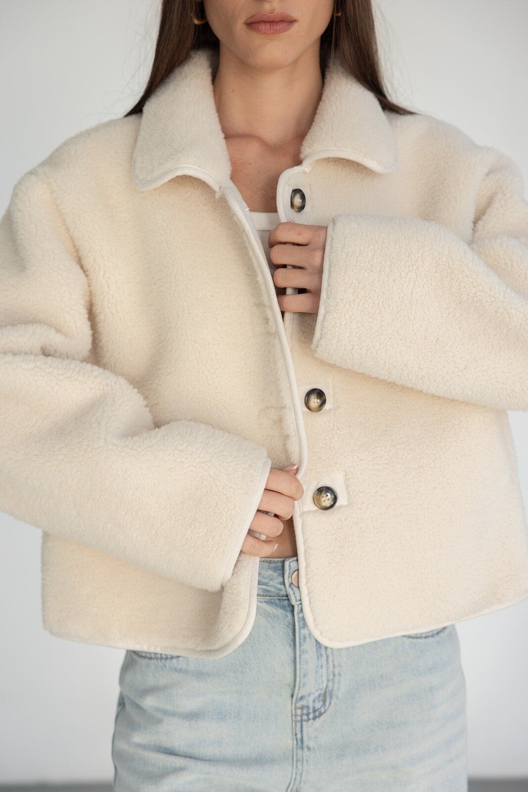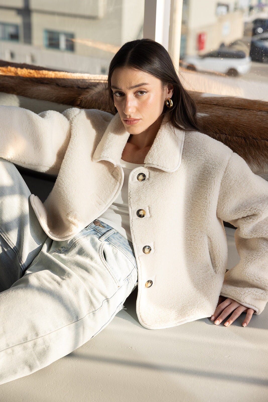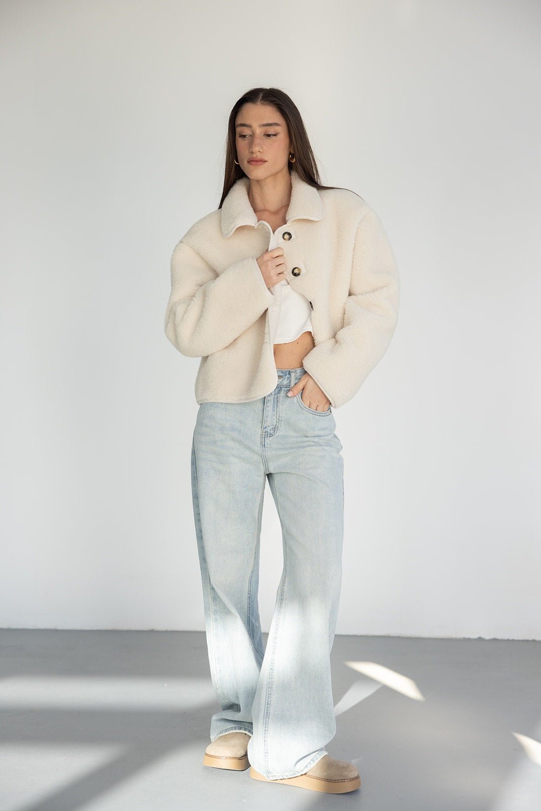 ג'קט דמוי צמר מבד נעים ומחמם ביותר לעונה ובגזרה מעט משוחררת ומחמיאה ביותר. בשילוב צווארון קלאסי, כפתורים לאורך הג'קט וזוג כיסים.