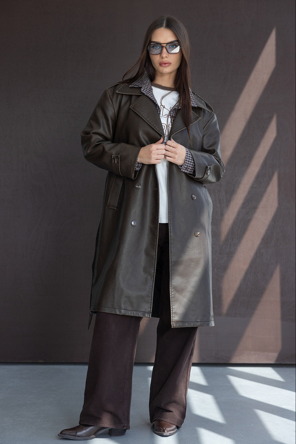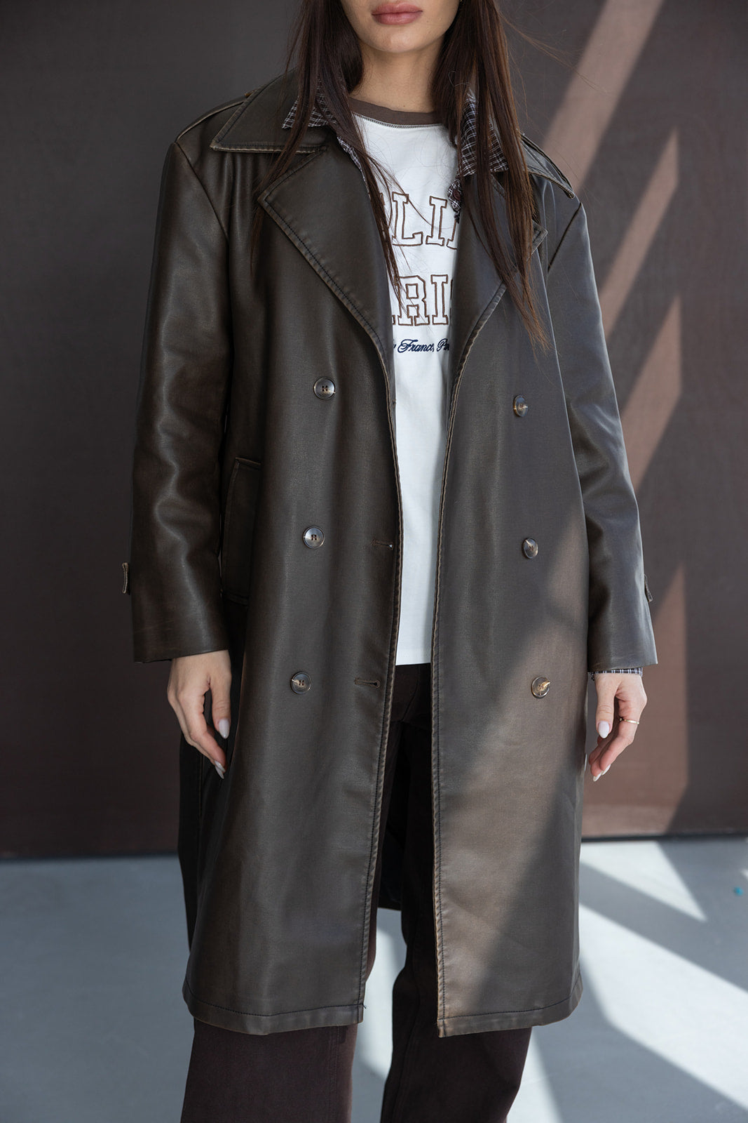 מעיל טרנץ' ארוך קלאסי עשוי דמוי עור איכותי ונעים, בשילוב כפתורים וקשירה.