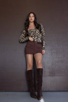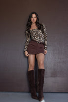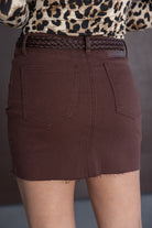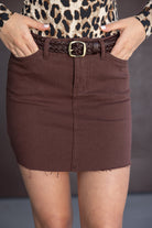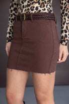 חצאית מיני מבד ג'ינס עם מעט לייקרה. בשילוב זוג כיסים קדמיים, זוג כיסים אחוריים וחגורת צמה דמוי עור בצבע חום כהה עם אבזם מוזהב.