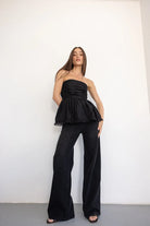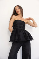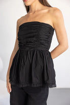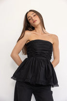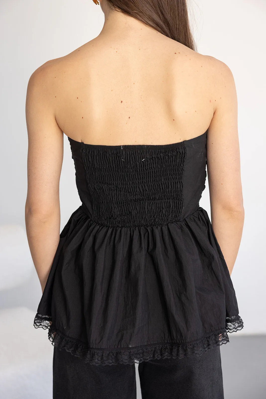 חולצת סטרפלס חגיגית ביותר בשילוב כיווצים וסיומת תחרה למראה טרנדי ומחמיא.