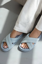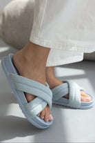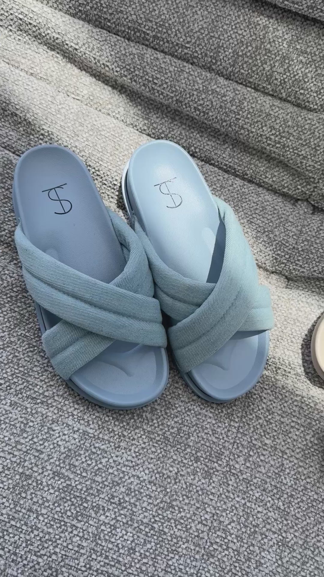 כפכף שטוח מבד ג'ינס, בשילוב רצועות מוצלבות.