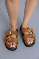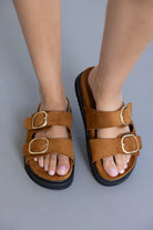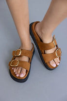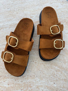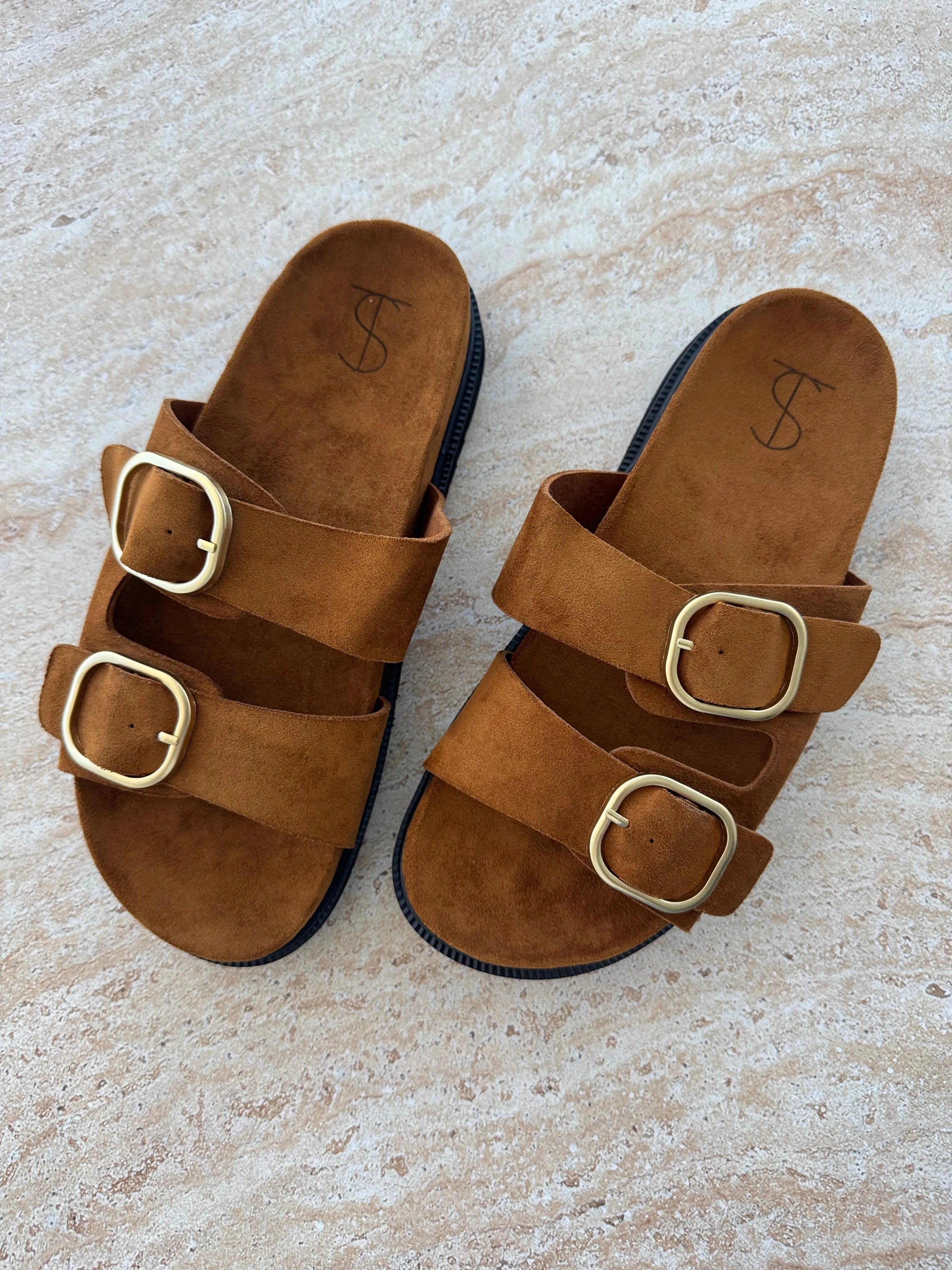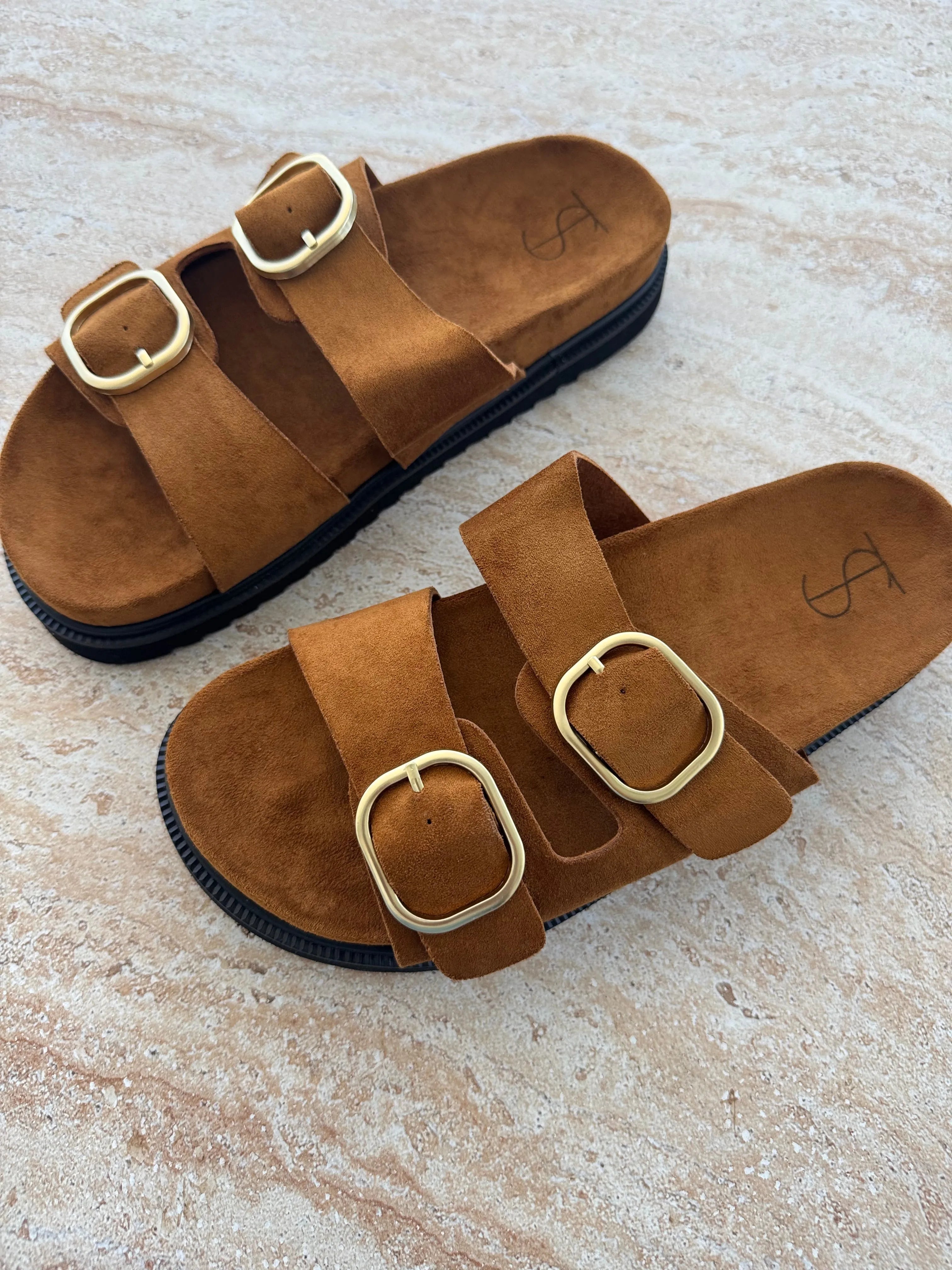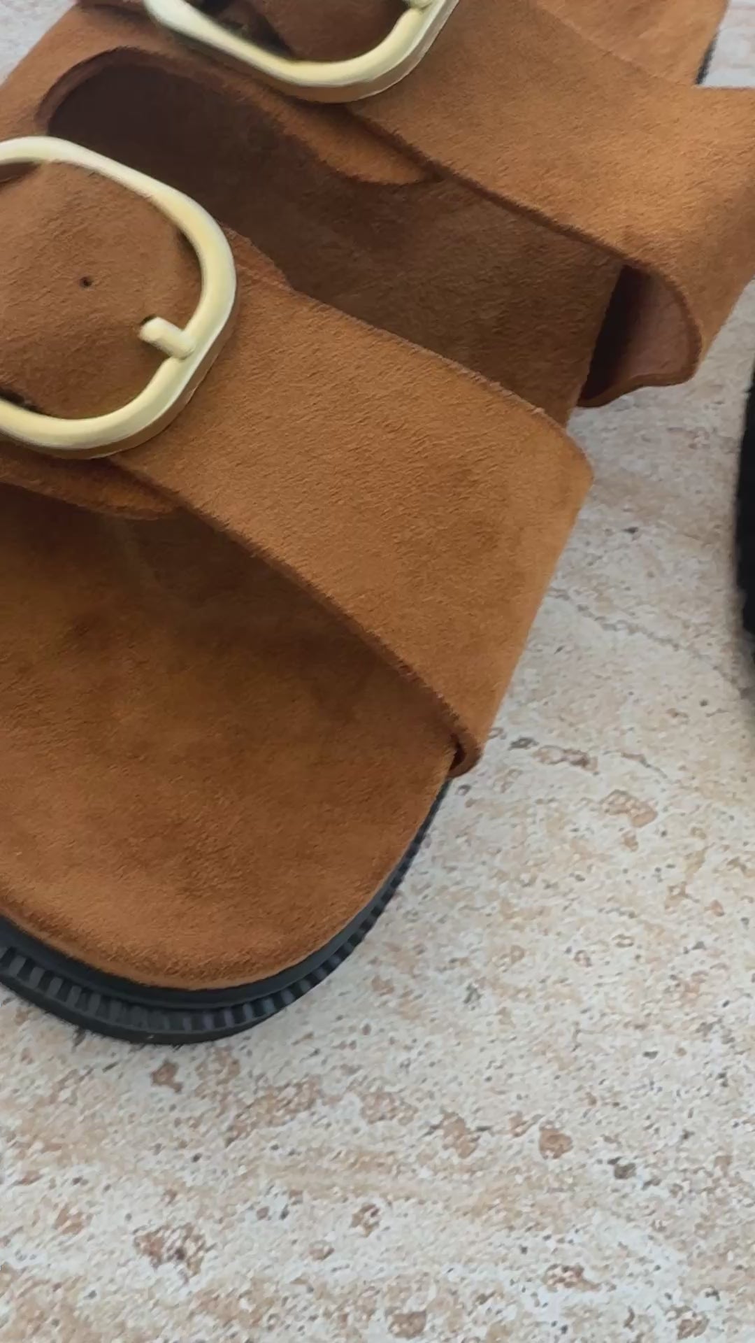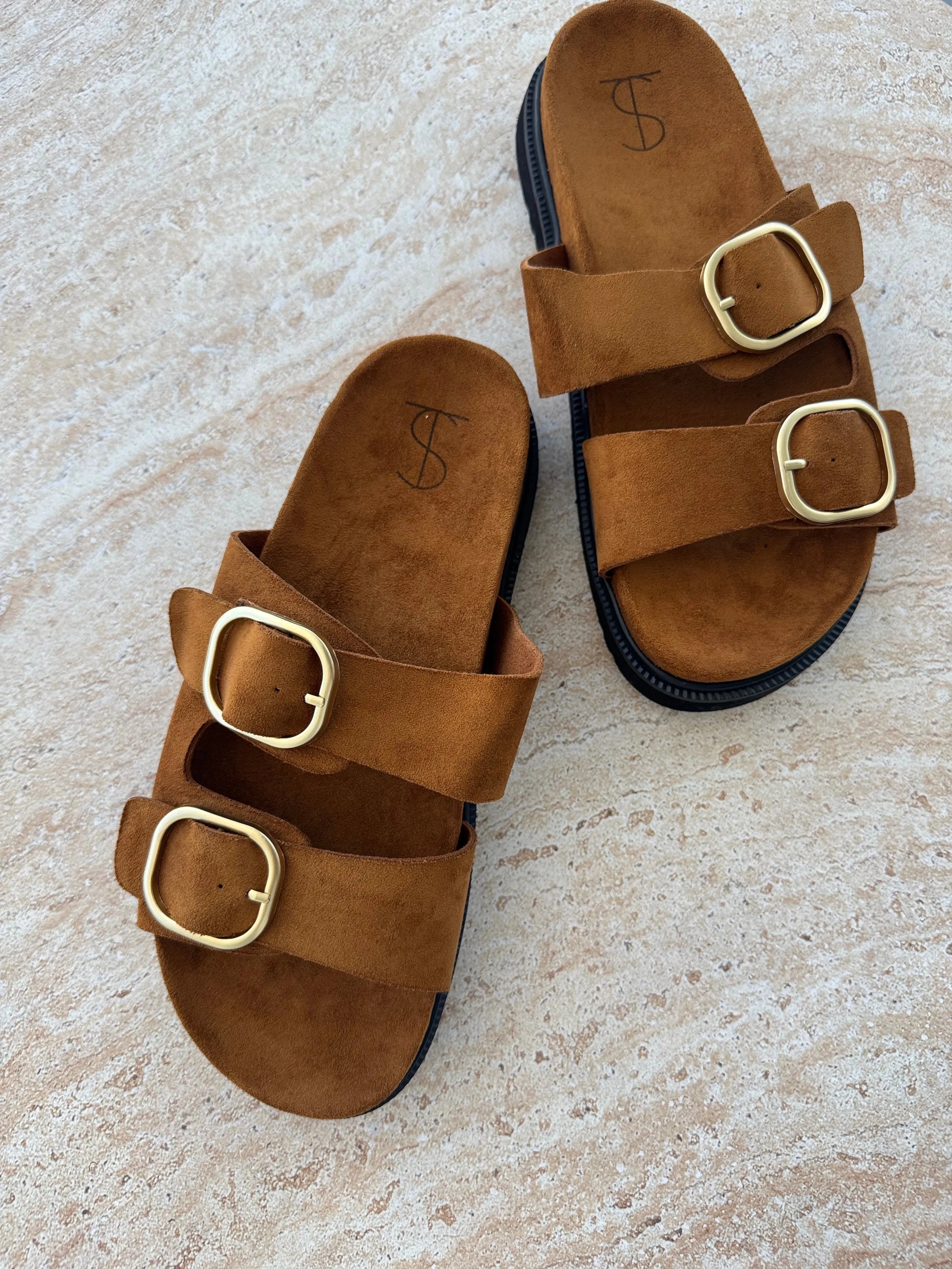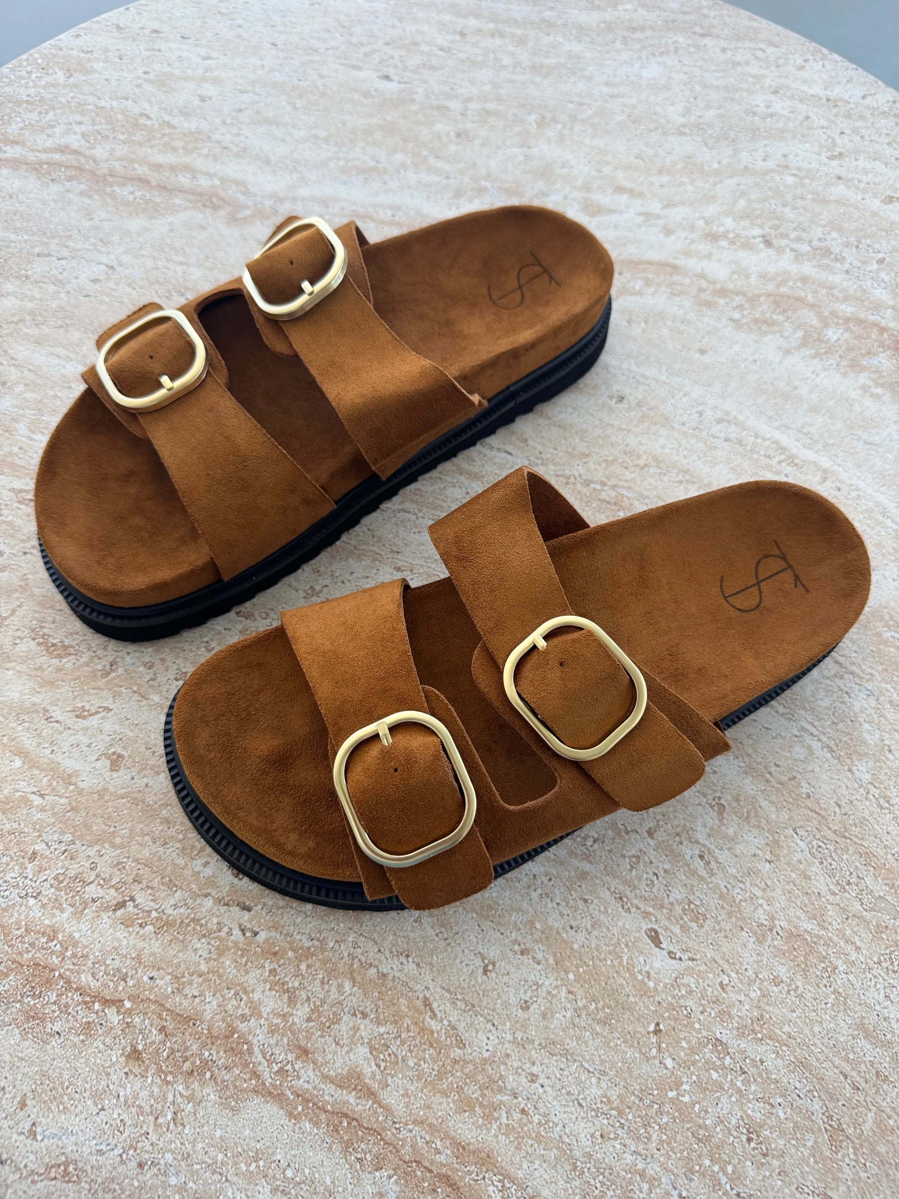 כפכף זמש בשילוב שתי רצועות וחגורה להידוק בצבע זהב.