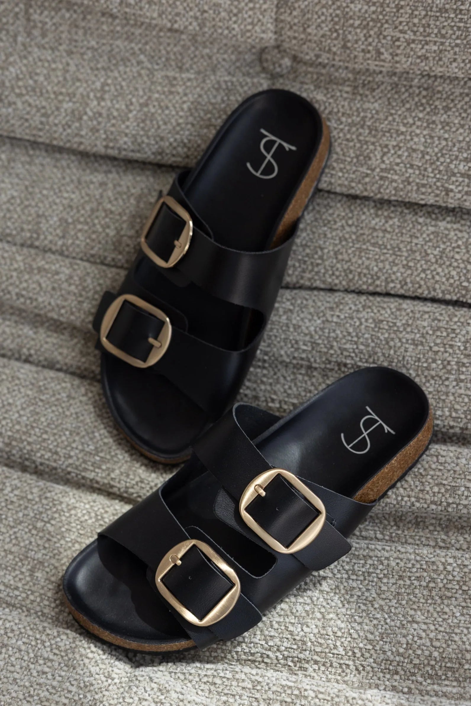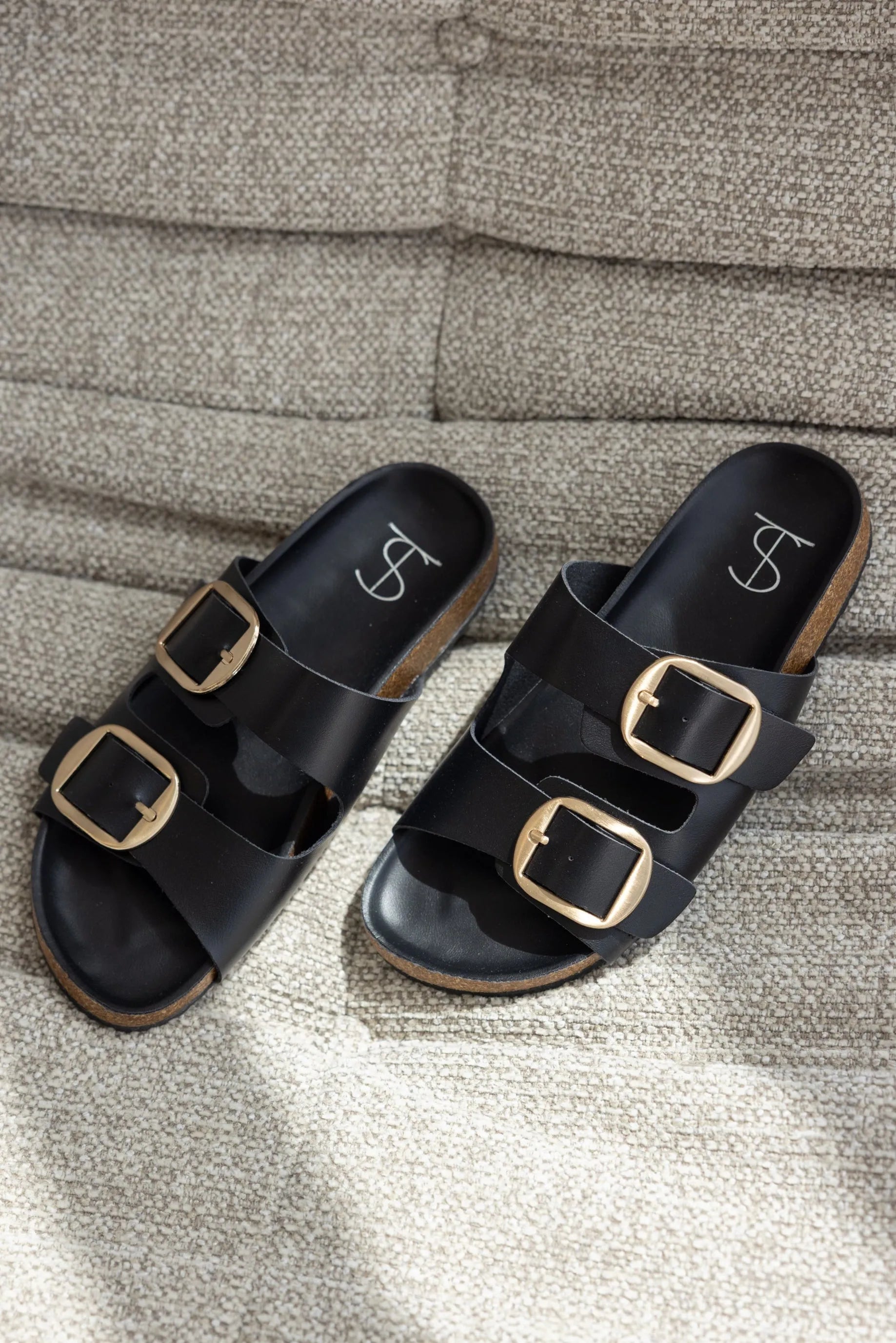 כפכף שטוח דמוי עור בשילוב שתי רצועות עבות ואבזם בצבע זהב להידוק.