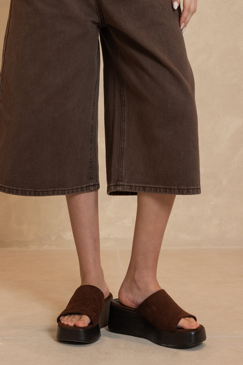 כפכפים בגוון חום עם פלטפורמה ורצועה רחבה בחלק הקדמי. נוחים ללבישה ומתאימים לשילוב יומיומי.